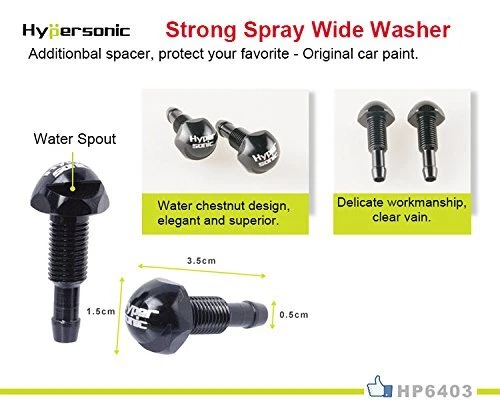 How to use the sprayer 1.Carefully remove existing washer jets(it may be helpful to warm the pipe) 2.Lightly tighten nuts and refit pipes 3.Check spray direction and turn to optimum position 4.If tool low remove jest and re-assemble using tapered washers to raise the angle as shown in diagram 5.When spray pattern correct secure nuts taking care not to over tighten 6. This washer sprayer fits the vehicle which the sprayer is on the hood, but doesn't fit the vehicle that the sprayer hide in the hood. Aluminum material with black finish. The item with small pads, please use them to adjust the angle to get wide sprayed. Produces a wide mist spray for greater windscreen coverage . This windscreen washer nozzle for car that the nozzles are exposed on the hook. The items are small but they can expand the cleaning area of front windshield. The washer sprayer fits the vehicle which the sprayer is on the hood, but don't fit the vehicle that the sprayer hide in the hood.