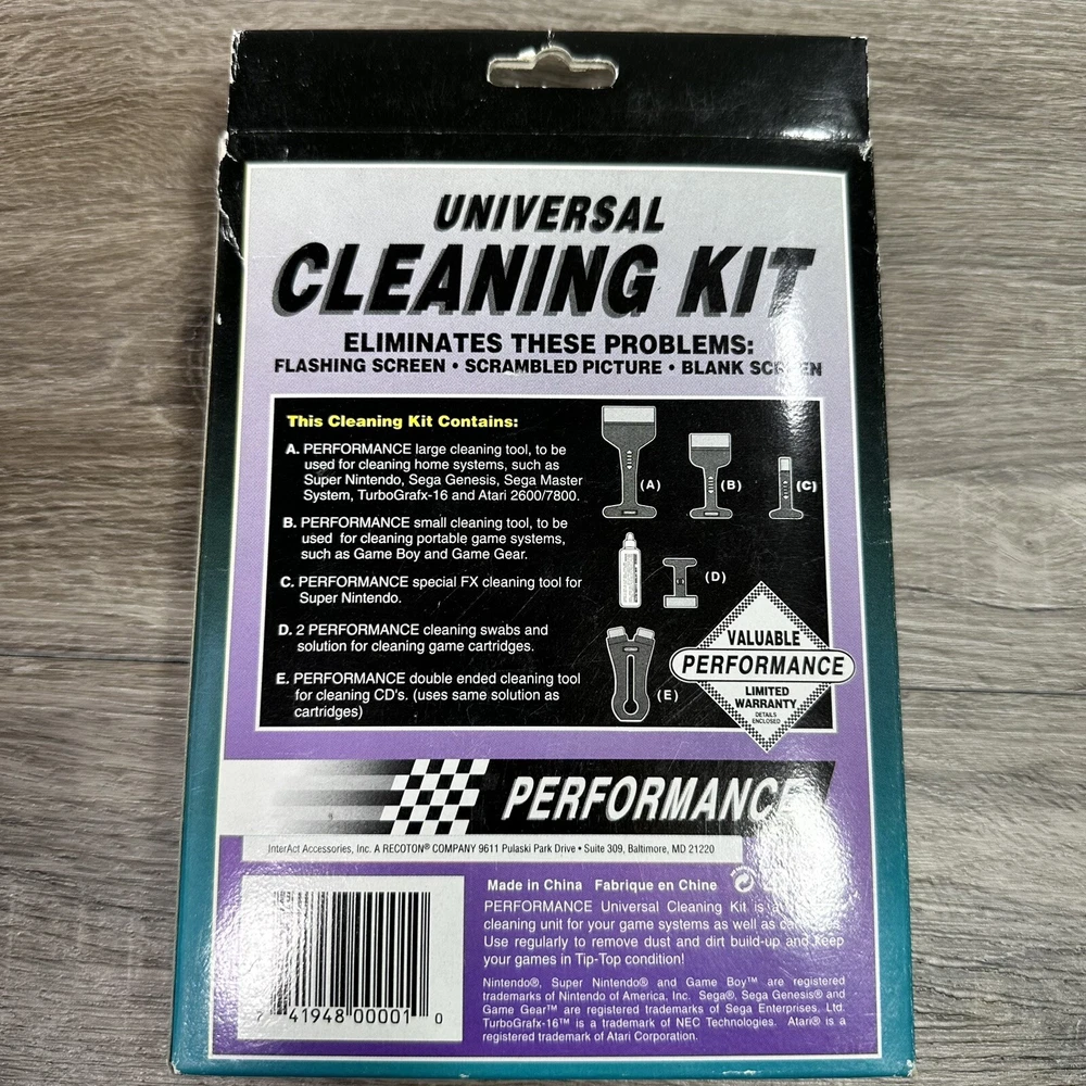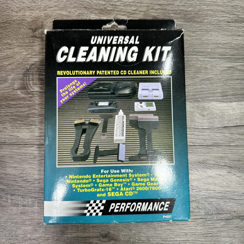 Universal Cleaning Kit NES Sega Genesis Master Nintendo Atari Gameboy. In used condition please see pictures for details. These are opened and looks to be complete. They still have a bottle of liquid in them and feels full. I had others in the buy which had no liquid and tossed those. This came from a large sega collection of many new old stock items and lightly used items.