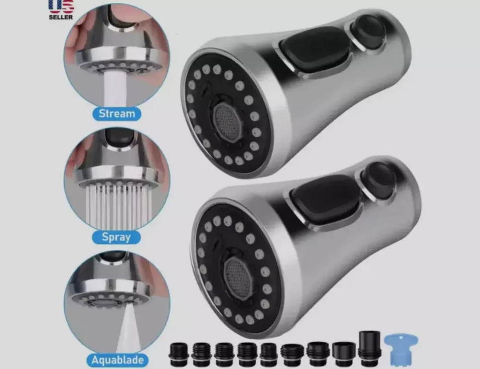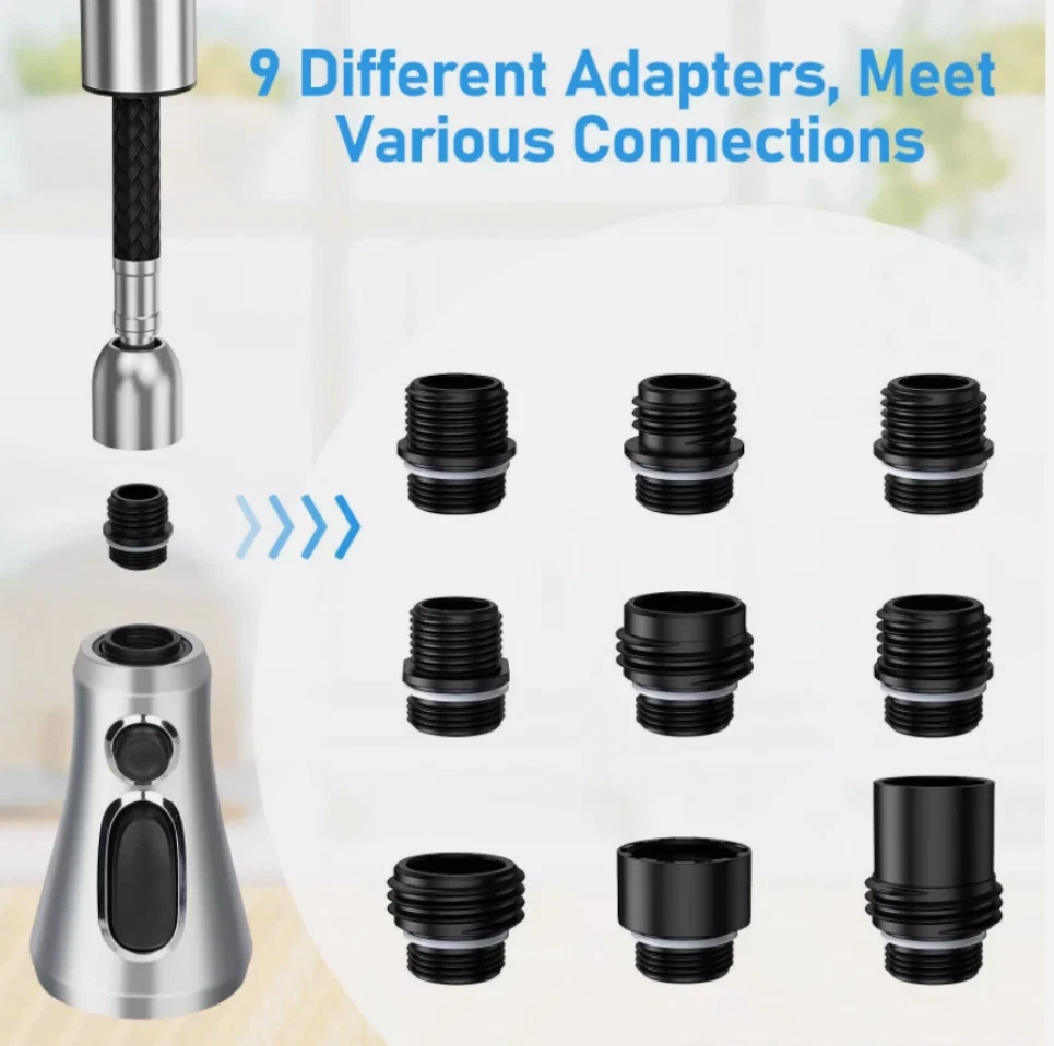 Product Feature : 【Premium Quality】 Crafted from high-grade ABS plastic with a premium chrome finish, our pull-down faucet spray head ensures durability and rust resistance, providing everyday convenience for various rinsing and filling needs. 【9 Different Adapters】 Our faucet spray head replacement includes 9 adapters, catering to various connections. Compatible with major brands of faucet hose connectors such as Moen, Delta, AquaSource, Kohler, Hansgrohe, Grohe, and so on. Please note that it is not compatible with most Pfister or Glacier Bay hoses. 【3-Mode Spray Options】 Enjoy three water modes: stream, spray, and aquablade. The aquablade mode provides powerful flushing to remove food debris. Easily switch between water modes with the push of a button. 【Removable & Washable Faucet Aerator】 We provide a free aerator key for easy removal or replacement of the faucet aerator for cleaning purposes. The interior multi-mesh aerator ensures a quiet, no-splashing aerated stream, filtering out most impurities. Cleaning the aerator ensures a continuous flow of clean water. 【Easy to Install】 Installation is a breeze! No tools required. In just minutes, unscrew your old faucet head and replace it with our new one for immediate use. Product Specification: Type: Pull Down Faucet Material: Engineering-grade ABS plastic Outer Diameter: G1/2 (20mm) Connection: G1/2 Male Thread, 5/8-16 UN, 5/8-18 UNF,4 Male Thread(17.1mm, 16.4mm, 15.5mm and 14mm) Overall Height: 4.09". (104 mm) Max. Width: 2.24". (57 mm) Package Included: 1 x Faucet Spray Head 9 x Connectors 1 x Aerator Key Tool Shipping * All items are in US warehouse and will be dispatched within 24 hours after receipt of payment. Please note that items purchased on weekends and Bank Holidays will be dispatched on the next working day. * It usually takes 3-5 working days for the delivery. But, the transit time is highly depend on Postal Service after we dispatched.If you have any problems, please feel free to contact us. * We ship items to your eBay confirmed address only. Please make sure your address on eBay is matched with your shipping address before you pay. * We are unable to take any responsibility for wrong address, any custom delay or tax. Returns * If the item can't works fine, please check twice to confirm that the item is defective, and contact our customer service representative asap let's know the detailed problem, we will do our best to server you. * If the package damaged during the freight, please refuse to sign for the package and return to us, then contact us promptly. * All of the Non-Seller mistake returns for refund are subject to 20% re-stock fee. And buyer should pay for the return shipping fee.(E.g choose the wrong size or wrong item) * We only accept the original package. Please make sure the item have No man-made sabotage. If you purchased in improper condition, please Note that the shippping and handling fee will not be refunded, all return shipping fee should paid by the buyer unless item DOA. * Guaranteed to Not be DOA and 100% working. Warranty covers replacement or repair. * Buyers are responsible for part return shipping fees on return package. * We reserve the right to refuse any returns for objective reasons. Contact Us * If you are dissatisfied for any reason, please don't leave negative/neutral feedback without asking. We work hard to make sure EVERY CUSTOMER 100% SATISFIED and resolve any problem for you. We always l eave positive feedback to all our customers. * If you are satisfied with the product you received,please leave us Positive Feedback and 5 Scores DSR * We are strive to providing 100% satisfaction services for our customers. Your satisfaction is our greatest pursuit. Positive Feedback is very important to us! Thank you!