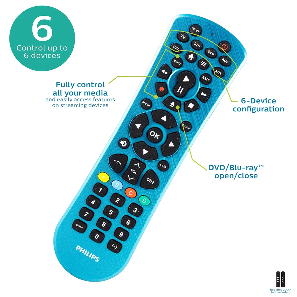 Universal Remote Control, Universal TV Remote Replacement, Samsung TV Remote Control Universal, for Roku Remote Replacement, Vizio, LG, Sony, Apple TV, Smart TVs, 6 Device, Blue, SRP9263C/27 Multi-device control – Operate up to six audio and video devices such as TVs, Blu-ray/DVD players, soundbars, cable and satellite receivers, and more Best remote code library – Universal remote works with all major brands and supports thousands of the latest audio and video devices (not for use with radio frequency devices like Roku Streaming Sticks and Fire TV/Sticks) Preprogrammed for Samsung and Roku – Universal remote’s TV and STR device buttons are preprogrammed for immediate use with Samsung TVs and Roku streaming media boxes (not compatible with Roku Streaming Sticks) Simple setup – Add two AAA batteries (not included) and enjoy easy automatic code search and direct code entry programming, as well as primary audio control to adjust the volume no matter which device is being used Stylish finish and ergonomic design – The universal remote’s brushed electric blue finish adds a splash of color to your décor while its compact design fits comfortably in hand Add a splash of color to your home theater setup with the 6-Device Universal Remote in a brushed electric blue finish. Designed to operate six separate devices, including your TV, Blu-ray player, cable, satellite, soundbar and more, this universal remote lets you clear the clutter and consolidate your controllers into one ergonomic, handheld device. Preprogrammed for immediate use with Samsung TVs and Roku streaming media boxes, this universal remote control offers simple, user‑friendly setup with your choice of auto code search or direct code entry programming. Just insert two AAA batteries (not included) and follow the included instructions or our online step-by-step programming videos. The primary audio control feature allows you to adjust the volume regardless of which device is being used. And, for added convenience, this remote includes a Blu-ray/DVD player open/close button as well as advanced DVR functions, simple menu navigation, a dash button for sub-channel access and a streaming app hotkey to take you straight to your smart TV’s primary media platform. Make this colorful 6-Device Universal Remote the center of your home entertainment system. Shipping We offer FREE shipping on all orders! We ship within Three business days of payment, usually sooner. We use a selection of shipping services such as UPS, FedEx, USPS etc. We only ship to the lower 48 states, no APO/FPO addresses or PO Boxes allowed. Local pickups and combined shipping options are not provided at this time. Return You can return a product for up to 30 days from the date you purchased it. Any product you return must be in the same condition you received it and in the original packaging. Please keep the receipt. Payment We accept payment by any of the following methods: PayPal Please pay as soon as possible after winning an auction, as that will allow us to post your item to you sooner! Feedback Customer satisfaction is very important to us. If you have any problem with your order, please contact us and we will do our best to make you satisfied. Contact Us If you have any queries, please contact us via ebay. We usually respond within 24 hours on weekdays. Please visit our eBay store to check out other items for sale! Thank you for shopping at our store.
