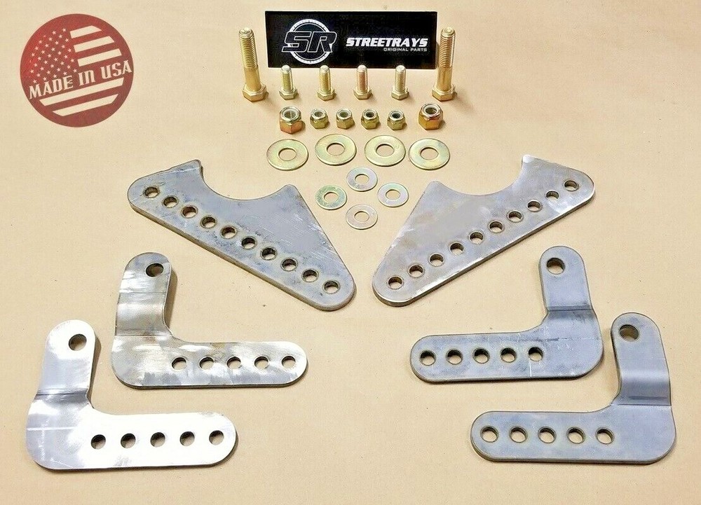 StreetRays [Originals] Coil Over Shock Mount Kit Adjustable Lower Brackets For up to 3" Axle Tubes All StreetRays [originals] parts are fabricated right here in Central Texas! where precision & quality finish is the main focus. This set includes 1 pair of mounting plates (driver & passenger side) and a set of adjustable height coilover mounting brackets. The main plates will need to be welded on to your suspension. Our plates and brackets are CNC cut to a high tolerance so you can rest assured that your installation will go smoothly. The main mounting plates will fit 2.75" to 3.25" Axle Tubes.