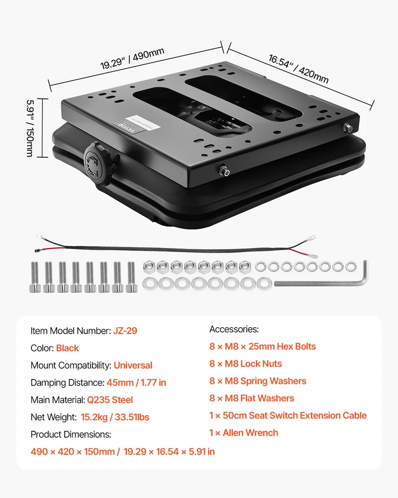 Document Product Description Forklift Seat Suspension Kit This forklift suspension kit supports 110.2-286.6lbs, features a 1.77" shock absorption stroke, effectively reducing back and waist fatigue. The 8 mounting holes make it ideal for forklifts, lawn mowers, etc. The 19.7in switch extension cord make installation flexible and quick. Mowers Forklifts Bulldozers Tractors Adjusts for Rough Terrain Adjustable Suspension Damping Distance Key Features PVC Dust Cover 8 Extra Mounting Holes 19.7" Extension Cable Features & Details Comfortable Operation: The forklift seat suspension kit uses high-strength 65mn springs with a 45mm (2") shock travel, ideal for users weighing 50-130kg. It effectively reduces back and spinal impact, ensuring greater comfort for extended periods of operation. Versatile Compatibility: With 8 additional mounting holes, this universal seat suspension kit fits a wide range of machines, including lawnmowers, forklifts, tractors, and bulldozers. It simplifies the replacement of old suspension systems, improving both stability and operational ease. Durable Construction: Made from heavy-duty 3mm (0.12") steel, coated with electrostatic powder for durability and corrosion resistance. The ssuspension kit features a PVC dust cover for additional protection against dust, dirt, and water, making it ideal for outdoor work environments. Flexible Installation: The lawn mower seat suspension kit includes a 50cm (19.7") extension wire for easy adaptation to various wiring setups. This ensures smooth connections and minimizes installation limitations, giving you more flexibility during setup. Adjustable Suspension: Equipped with an adjustable switch, allowing you to fine-tune the suspension based on weight and environmental conditions. Adjust for different vibration levels, enhancing both comfort and safety. Note: This suspension kit does not come with rails. You will need to install 3/4-inch spacers for proper mounting. SHIPPING ABOUT US PAYMENT RETURNS CONTACT WARRANTY Welcome to our eBay store. As a leading and emerging company in manufacturer and exporting business, we are specialized in Business and Industrial Products, Sporting Goods, Pet Products, Home and Garden products for more than 10 years. We believe that it is our vision and mission to provide innovative products with best service and competitive price to satisfy you. Our goal is to make sure that you can find exactly what you are looking for and make it easy for you to place your orders. We accept PayPal payment,PayPal Credit,Credit card or debit card and so on. Payment should be completed within 4 (Four) days of auction closing. Or unpaid dispute will be filed for closing auction. We will leave a positive feedback immediately after payment is received. We appreciate a positive feedback as much as you do. If for some reason there is any issue with the purchase, please contact us prior to leaving feedback, we will be glad to work together and provide a satisfying solution. Please be aware that PO Box cannot receive items, please DO NOT fill in the PO Box address. DELIVERY DAYS: 3-7 BUSINESS DAYS 3 BUSINESS DAYS SHIPPING OUT SHIP FROM CA & TX & NJ & GA & NC &OR WAREHOUSE California Warehouse: City of Industry, CA Texas Warehouse : Houston, TX New Jersey Warehouse : Perth Amboy, NJ New York State Warehouse: Perth Amboy, NJ Georgia Warehouse: Austell,GA North Carolina Warehouse: Grove NC Oregon Warehouse: AIRPORT WAY Portland,OR All of our items are backed with a 30-day return policy. We ensure all our items are new and in excellent condition prior to shipping. In case you receive the item that is not to the standards above, please contact us via e-Bay messages. All returns must be in new original condition as received and should be shipped with delivery confirmation Please note that all returns must be pre-approved by us. Unauthorized returns will not be accepted. If you need to return, please check twice to confirm the item not work and contact our customer service representative, let us know the detailed problem and send us some pictures for confirmation. We ONLY accept returns with original package. Please make sure that item has NO man-made sabotage. Used items will not be accepted for return. Email Customer Support: 9:00am-2:00am PST Sunday-Friday All emails will be responded to within 12-24 hours This item comes with 12 months Warranty from the date of customers purchased it. Special circumstances will be listed clearly in the listing. If your item has been damaged in transit or become faulty in warranty period, please email us with pictures or video to show the problem. Please do check everything carefully after you received the parcel, any the damage except DOA (Dead-On-Arrival) would not be covered if it's your fault. Replacement products are provided with the same warranty as the returned products. VEVOR is a leading brand that specializes in equipment and tools. Along with thousands of motivated employees, VEVOR is dedicated to providing our customers with tough equipment & tools at incredibly low prices. Today, VEVOR's products are sold in more than 200 countries and regions with 10 million plus members worldwide. Forklift Seat Suspension Kit This forklift suspension kit supports 110.2-286.6lbs, features a 1.77" shock absorption stroke, effectively reducing back and waist fatigue. The 8 mounting holes make it ideal for forklifts, lawn mowers, etc. The 19.7in switch extension cord make installation flexible and quick. Mowers Forklifts Bulldozers Tractors Adjusts for Rough Terrain Adjustable Suspension Damping Distance Key Features PVC Dust Cover 8 Extra Mounting Holes 19.7" Extension Cable Features & Details Comfortable Operation: The forklift seat suspension kit uses high-strength 65mn springs with a 45mm (2") shock travel, ideal for users weighing 50-130kg. It effectively reduces back and spinal impact, ensuring greater comfort for extended periods of operation. Versatile Compatibility: With 8 additional moun