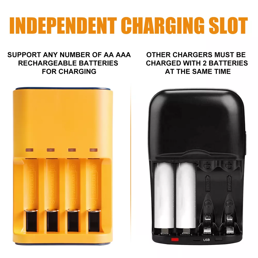 Universal Smart Battery Charger 4-Slot for AA AAA 1.2V Rechargeable Batteries Features: 1. 【Smart Rechargeable AA Battery Charger】 AA AAA battery charger 4 bay for Ni-MH Ni-CD rechargeable batteries can charge any quantity in any slot. Besides, you can also mix charge AA and AAA batteries, as long as they are Ni-MH or Ni-CD batteries. 2.【Safety Protection】 Comes with special charge and discharge management circuit. With multiple security protection settings, battery charger aa can effectively prevent reverse, short circuit, overcharge, over discharge, over-current damage to the battery, which makes users using the product without any safety concern. 3.【LED Indicators Charging Display】 This aa aaa battery charger with Red/Green led light display, And the aa rechargeable battery charger will display the status of each rechargeable battery when you insert a battery to charge, the light will turn solid red, only on the port(s) containing the battery, to indicate the battery is charging. The light turns solid green when charging is complete. 4.【USB AA Battery Charger】 USB Powered Universal Intelligent Battery Charger, allows for on the go worldwide portability.the USB charging line can be connected to USB socket, car charger, computer, phone adapter, other USB output equipment to charge. 5. Note: Products with electrical plugs are designed for use in the US. Outlets and voltage differ internationally and this product may require an adapter or converter for use in your destination. Please check compatibility before purchasing. Specification: 1. LED state the charging statues: Power connection, no battery, Green light is always on. Charging - Red light Full charged- Green light 2. Compatible: Can both charge AA and AAA Ni-MH Ni-Cd rechargeable batteries (Do not charge alkaline or Lithium batteries) 3. Input and Output: Input: DC 5V 1A, Worldwide voltage Output: DC 1.2V 200mA, faster for charging 4. Individual fast-charging,LED indicator light, Easy to use AA/AAA/ Ni-MH Ni-CD rechargeable batteries,Perfect Fit 6. Can charge any number of batteries at the same time, independent charging channels 7. Safety Charging, Offer over-voltage over-current protection, short-circuit protection, over-charge protection, over-heat protection, Good Protection Package Included 1 x USB Smart Battery Charger 4 Bay for AA AAA Battery 1 x USB Cable On Feb 10, 2025 at 01:58:41 PST, seller added the following information: