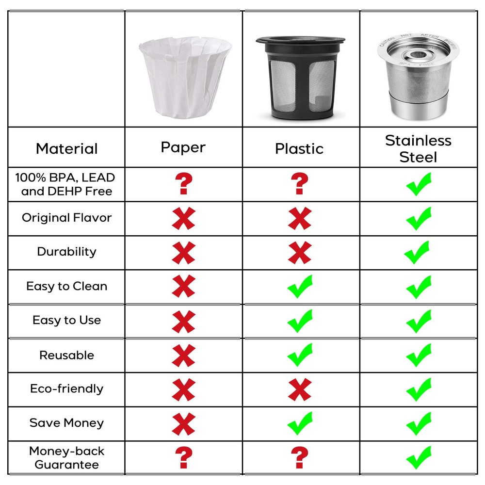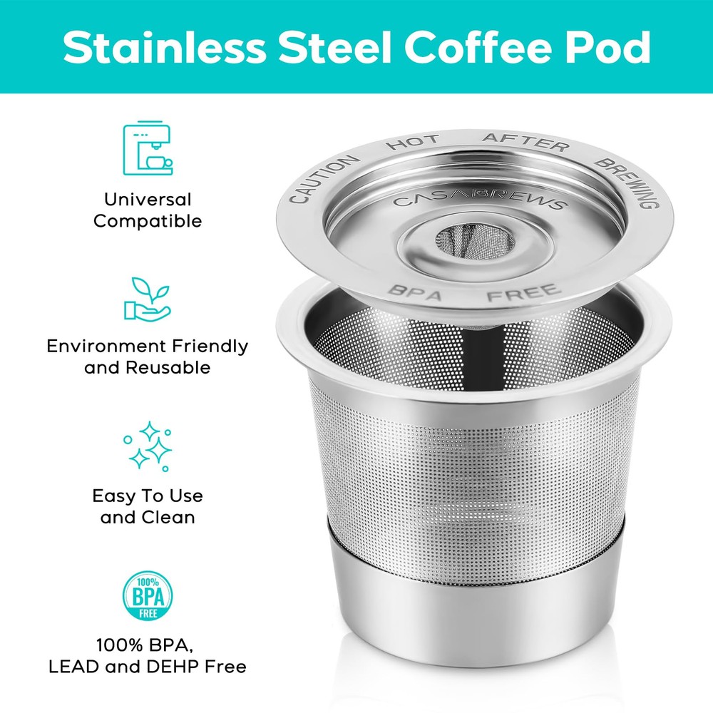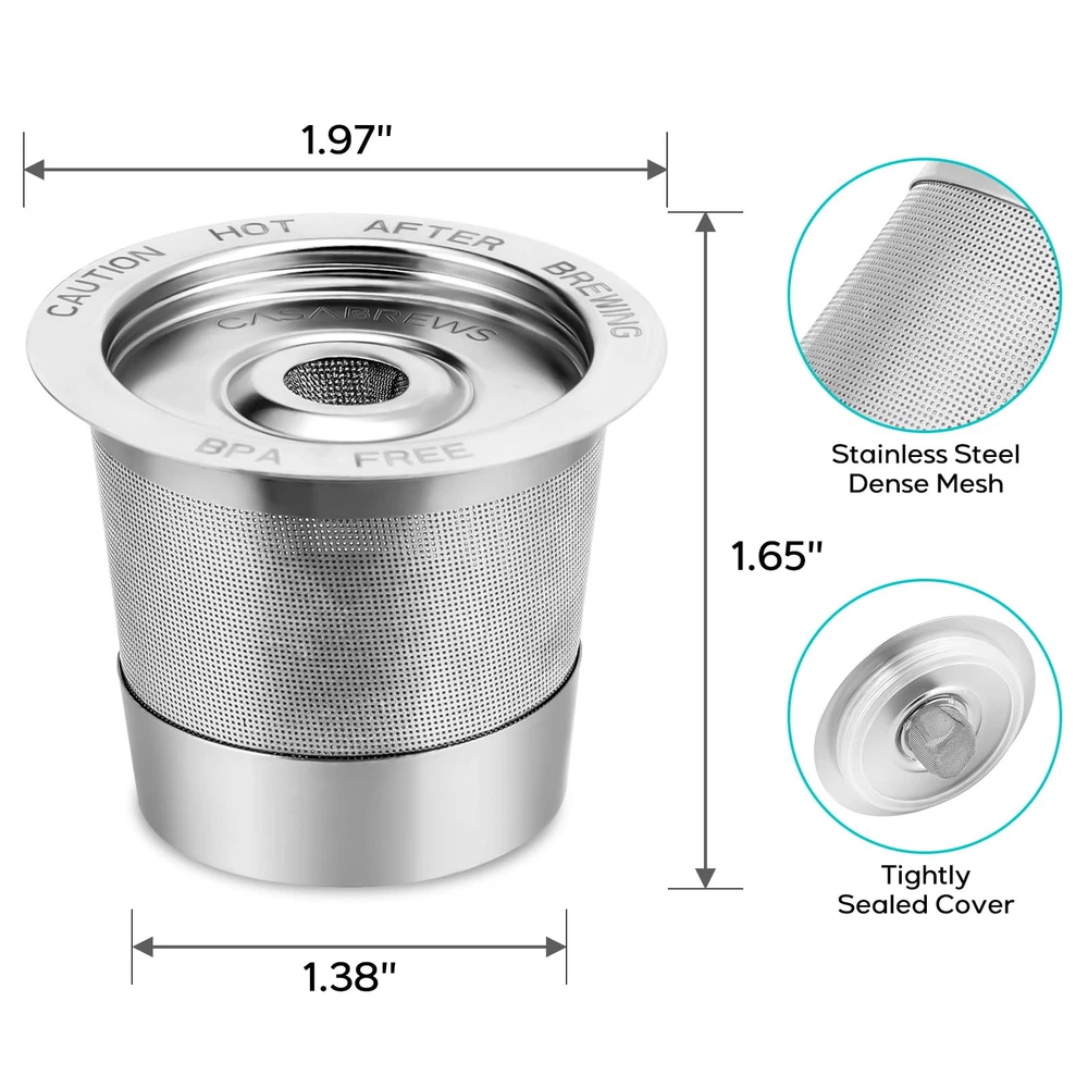 Universal Compatible: k cup reusable coffee pods are compatible with Keurig 1.0 coffee machines, and also work with Keurig K-Classic, K-Elite, K-Latte, K-Cafe, K-Select, K-Compact, and Breville K CUP, Mr. Coffee K CUP, But NOT Compatible with: Keurig 2.0 coffee machine, Keurig K-duo(Gen 2), Keurig K-Supreme/Plus/Smart, K-Slim (See full detailed list picture) Eco-Friendly & Saving Money: K cup coffee pods are made of high-quality stainless steel, recyclable for permanent use and save money, when using k cup coffee pods reusable, you can reduce the use of numerous paper filters and plastic coffee capsules. Contribute to protecting the environment Keep Coffee Flavor: The bottom and side walls of the reusable k cups are 360-degree perforated, allowing water to fully soak the coffee powder, fully retaining the coffee natural oils and flavors, ensuring delicious coffee brewing. The k cups reusable pods are a good helper for coffee lovers Easy To Use & Clean: The reusable coffee filter adopts one-piece design, tightly sealed top cover to prevent coffee overflow during use. Add the desired amount of coffee grounds to the stainless steel k cup coffee pods for each use, simply pour the grounds into the trash after use and clean the reusable k cup filter with water Our Promise To You: We are a US-based company and we care about our customers! If you're not happy, we're not happy. We want you to buy our reusable k cup coffee filters with confidence, We're here to help! please let us know if you experience any problems with our product