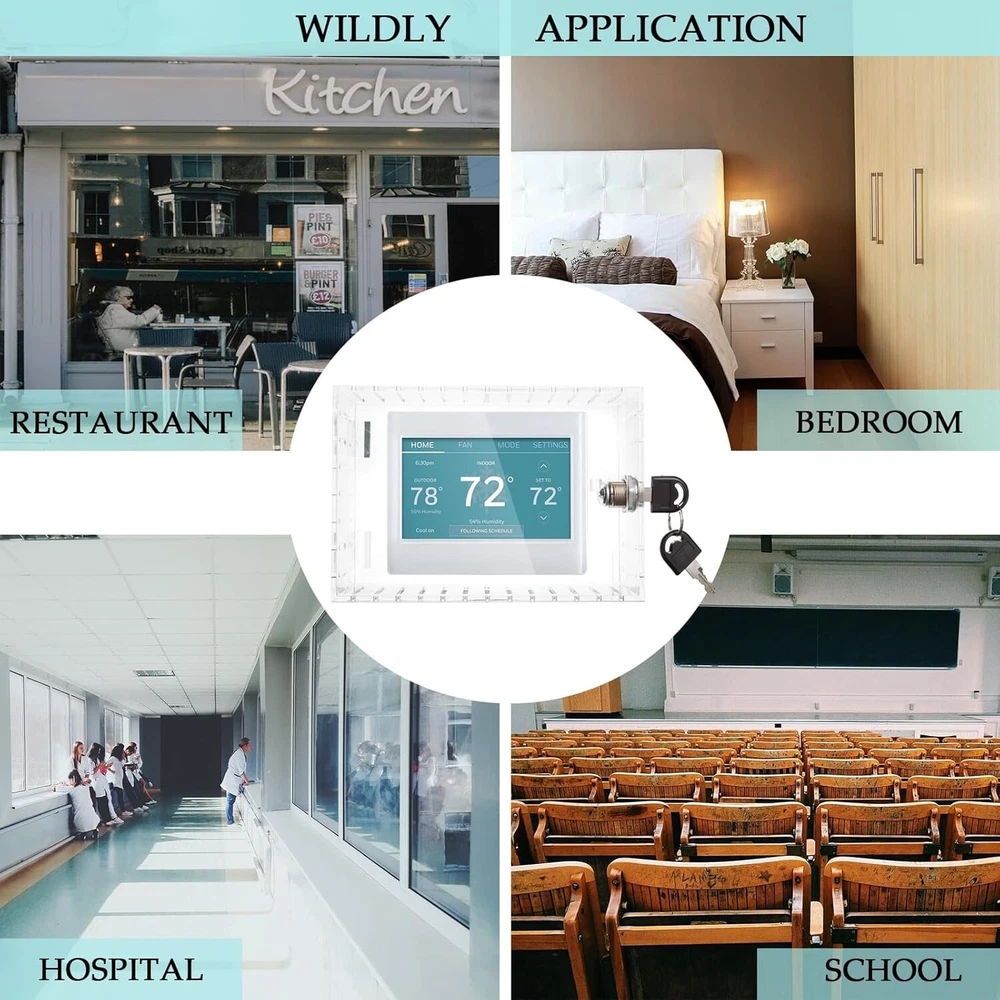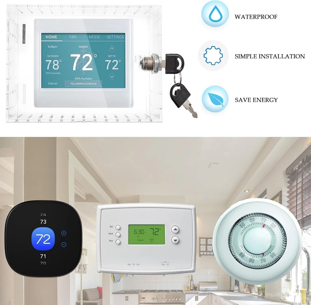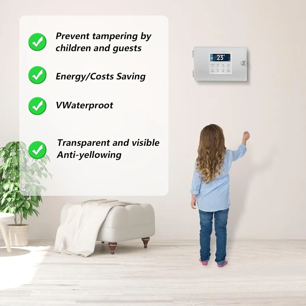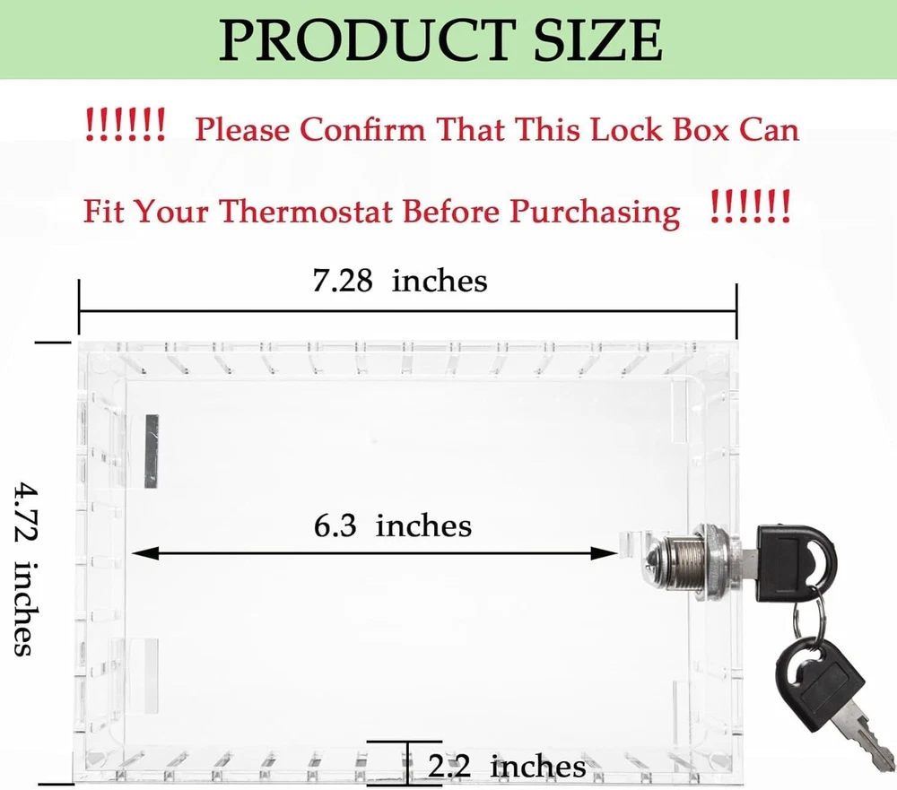 Model 2 【Note: Must Read Before Purchasing】This thermostat lock box is designed to accommodate a wide range of thermostat sizes and types. The thermostat cover with an outer diameter of 7.28''*4.72''*2.2'' and an actual usable size of 6.5''*4.72''*2.2''(MAKE SURE YOUR THERMOSTAT SMALLER THAN THIS SIZE) 【Superior Protection】Our thermostat lock box with key is designed to prevent tampering, damage, and unauthorized adjustment of your thermostat settings. With its construction and included keys, ensuring your thermostat stays secure and your bills stay in check 【High-Quality Materials】Your thermostat deserves the best protection. Our thermostat cover is made from high-quality material. Not only is it resistant to UV rays, but it also prevents yellowing over time. With its sleek design, your thermostat will always look clean and beautiful 【Easy Installation】 Installing our thermostat guard is a breeze! The open design allows for installation without removing the thermostat from the wall. Whether you prefer a horizontal or vertical orientation, our guard can be easily adjusted to fit your thermostat perfectly 【Widely Application for Energy Control 】Our thermostat lock box isn't just for homes. It can be widely used in various places such as restaurants, offices, churches, schools, and even industrial environments. By keeping control over your energy use, you'll see significant savings while ensuring the temperature remains at the desired level Model 1 Universal Thermostat Lock Box:The thermostat cover with lock measures 7.28x2.48x4.72 inch (LxWxH), fits for: 5.9x4 inch (WxH), or smaller thermostat, suitable for all shapes of thermostats, ensuring optimal protection And safety. Warm reminder: Please confirm the size before purchasing. Superb and Durable Material:The thermostat lock box with key is made of high-quality acrylic material with exquisite workmanship, which has excellent durability, UV resistance, and anti-yellowing properties. It is not easy to be damaged or deformed, and has long-lasting durability and stability. Safeguard Your Thermostat:Lock box for thermostat on wall protects your thermostat from tampering, damage and unauthorized adjustments by children, tenants or the public. Helps to control energy usage to a great extent, helping you avoid high bills and save your home a lot of money. Two Installation Methods:We provide you with two installation methods: screw installation or adhesive installation. Screw mounting provides greater stability. Adhesive installation offers greater flexibility and requires no drilling into the wall. You can choose according to your needs. Multi-scene Applications:Ideal for homes, restaurants, schools, hotels, factories and other occasions to protect the thermostat from tampering, protect the thermostat and extend its service life. The thermostat cover with lock has high transparency, ventilation on all sides and good air permeability, which can prevent temperature detection from being interfered and ensure the accurate performance of the thermostat.