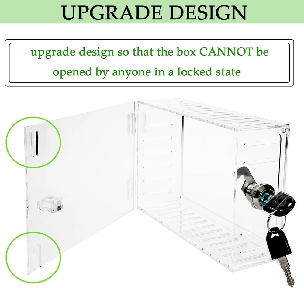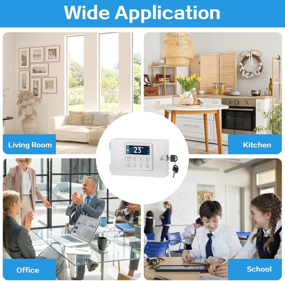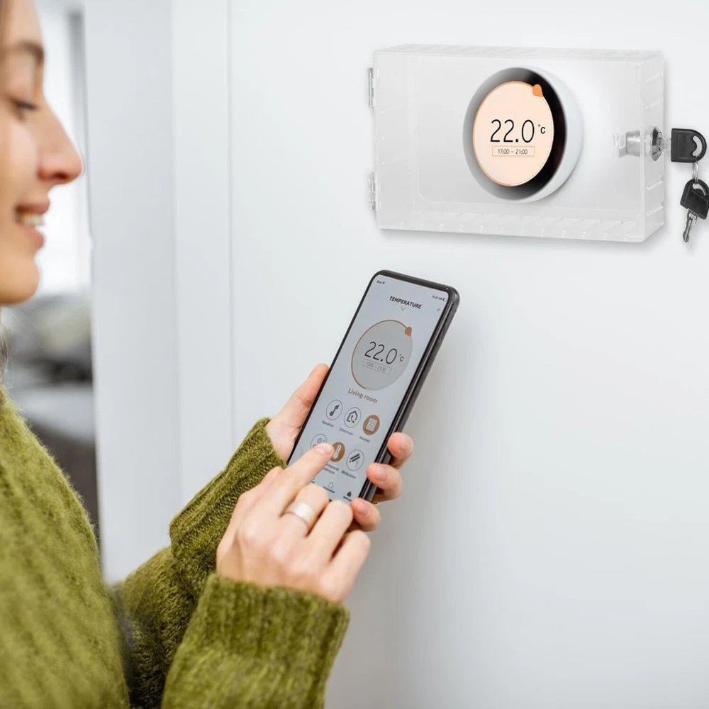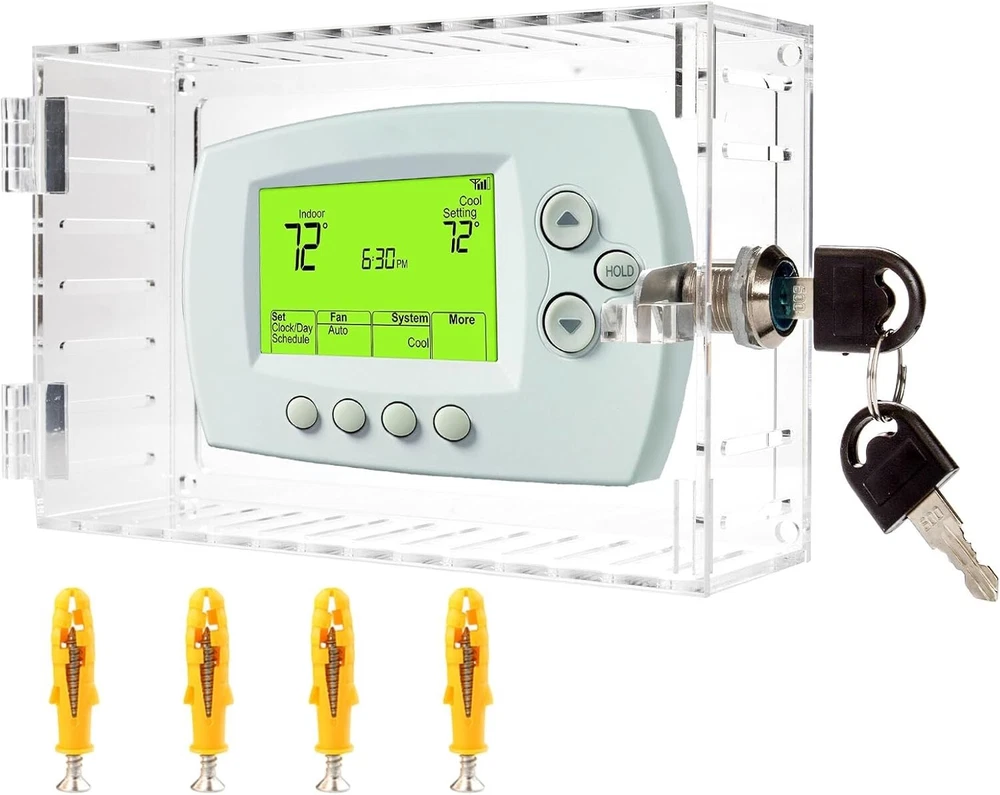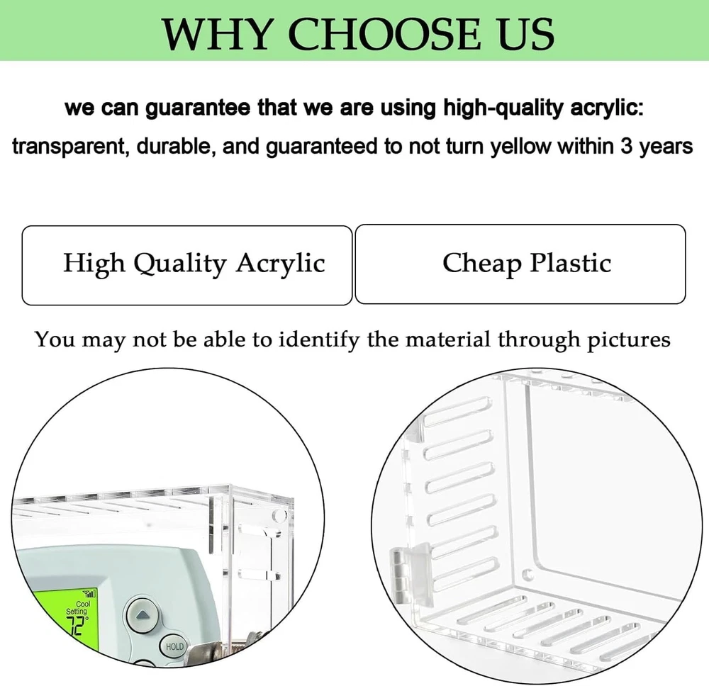 Model 2 【Note: Must Read Before Purchasing】This thermostat lock box is designed to accommodate a wide range of thermostat sizes and types. The thermostat cover with an outer diameter of 7.28''*4.72''*2.2'' and an actual usable size of 6.5''*4.72''*2.2''(MAKE SURE YOUR THERMOSTAT SMALLER THAN THIS SIZE) 【Superior Protection】Our thermostat lock box with key is designed to prevent tampering, damage, and unauthorized adjustment of your thermostat settings. With its construction and included keys, ensuring your thermostat stays secure and your bills stay in check 【High-Quality Materials】Your thermostat deserves the best protection. Our thermostat cover is made from high-quality material. Not only is it resistant to UV rays, but it also prevents yellowing over time. With its sleek design, your thermostat will always look clean and beautiful 【Easy Installation】 Installing our thermostat guard is a breeze! The open design allows for installation without removing the thermostat from the wall. Whether you prefer a horizontal or vertical orientation, our guard can be easily adjusted to fit your thermostat perfectly 【Widely Application for Energy Control 】Our thermostat lock box isn't just for homes. It can be widely used in various places such as restaurants, offices, churches, schools, and even industrial environments. By keeping control over your energy use, you'll see significant savings while ensuring the temperature remains at the desired level Model 1 Universal Thermostat Lock Box:The thermostat cover with lock measures 7.28x2.48x4.72 inch (LxWxH), fits for: 5.9x4 inch (WxH), or smaller thermostat, suitable for all shapes of thermostats, ensuring optimal protection And safety. Warm reminder: Please confirm the size before purchasing. Superb and Durable Material:The thermostat lock box with key is made of high-quality acrylic material with exquisite workmanship, which has excellent durability, UV resistance, and anti-yellowing properties. It is not easy to be damaged or deformed, and has long-lasting durability and stability. Safeguard Your Thermostat:Lock box for thermostat on wall protects your thermostat from tampering, damage and unauthorized adjustments by children, tenants or the public. Helps to control energy usage to a great extent, helping you avoid high bills and save your home a lot of money. Two Installation Methods:We provide you with two installation methods: screw installation or adhesive installation. Screw mounting provides greater stability. Adhesive installation offers greater flexibility and requires no drilling into the wall. You can choose according to your needs. Multi-scene Applications:Ideal for homes, restaurants, schools, hotels, factories and other occasions to protect the thermostat from tampering, protect the thermostat and extend its service life. The thermostat cover with lock has high transparency, ventilation on all sides and good air permeability, which can prevent temperature detection from being interfered and ensure the accurate performance of the thermostat.