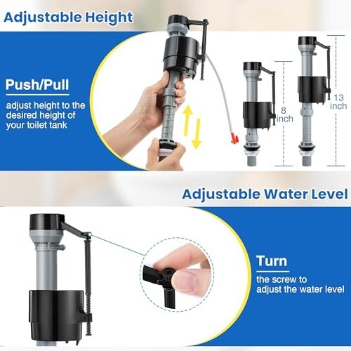 Efficient and Quiet Toilet Valve Replacement Kit Transform your bathroom experience with our high-efficiency toilet valve replacement kit, designed for optimal water control and a quieter home. Featuring a precision water level adjustment screw, this kit allows you to effortlessly manage the water level in your tank, making low flow usage a seamless part of your daily routine. Its adaptable height ranges from 8 inches to 13 inches, ensuring a perfect fit for your toilet tank. Enjoy the peace of a silent fill process that enhances comfort in your home. Our durable and leak-proof toilet flapper is compatible with most toilets featuring a 2-inch flush outlet. Made from high-quality, corrosion-resistant rubber, it stands strong against chlorine and hard water, maintaining its pristine condition over time. Its superior sealing capability effectively prevents leaks, safeguarding your bathroom from unwanted water problems. The stable and adjustable side toilet flush lever is crafted from solid brass with a treated metal surface handle, offering robust load-bearing capacity and resistance to corrosion and rust. Designed for longevity, this side-mounted lever features three length adjustment holes and can be bent to the precise angle needed for your specific toilet tank setup. This comprehensive toilet pump replacement kit includes everything you need: a toilet fill valve replacement kit, a toilet flapper replacement kit, and a toilet lever replacement kit. It is designed to fit most US toilet tanks seamlessly. Enjoy hassle-free installation with our thoughtfully designed toilet float replacement kit. Simply follow the detailed instructions provided to quickly install and start enjoying the enhanced convenience and comfort of a top-quality toilet tank solution.