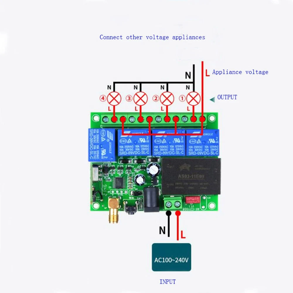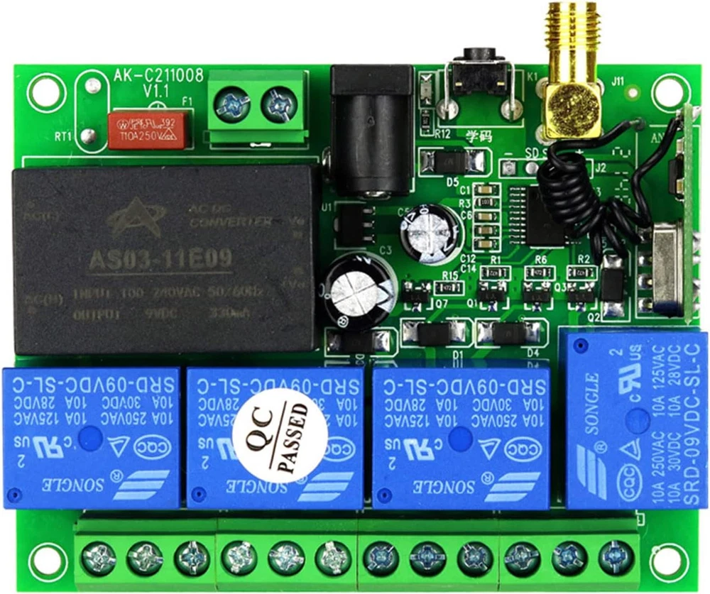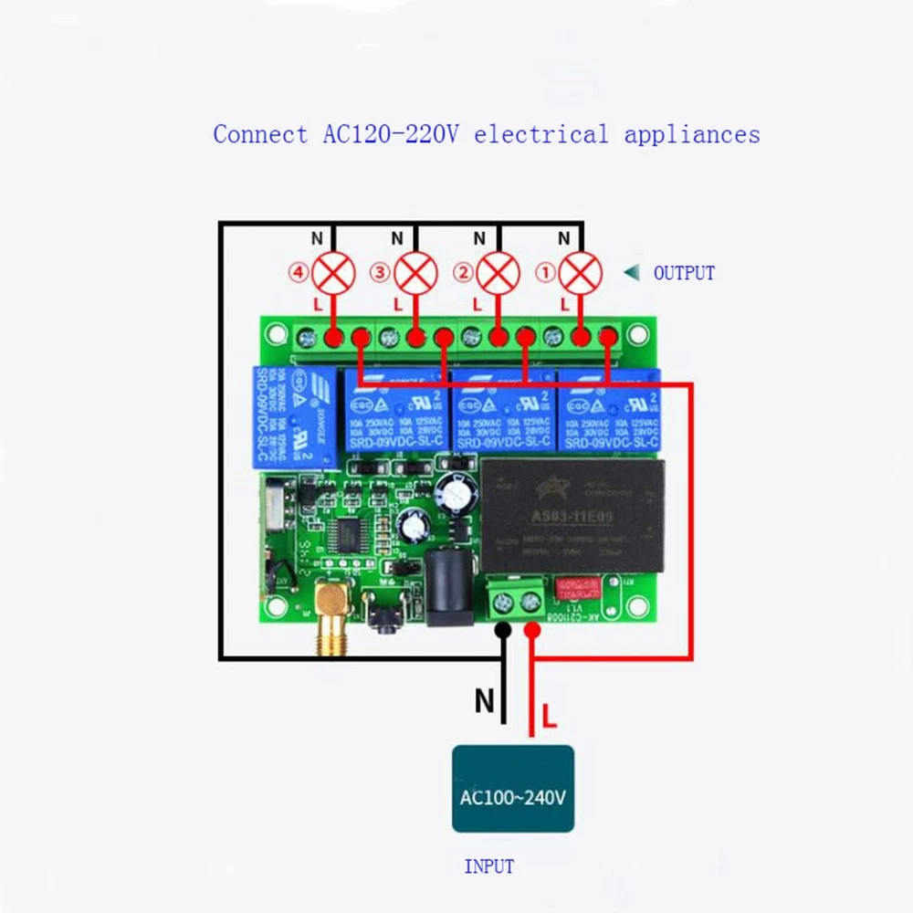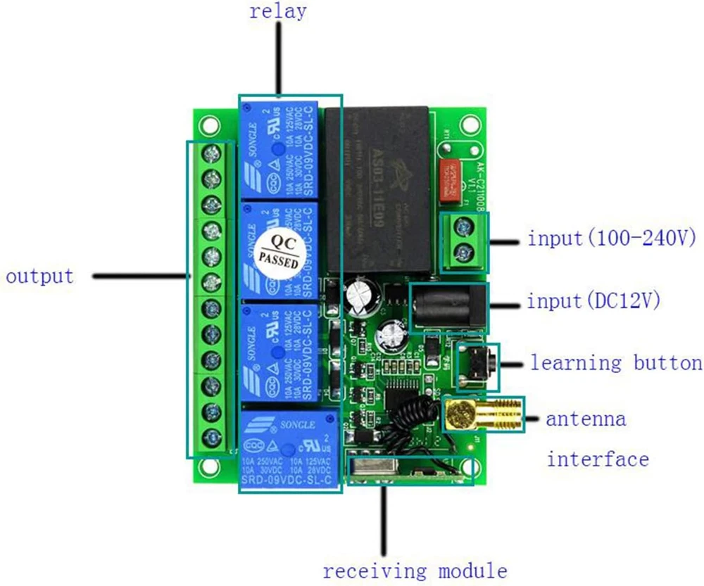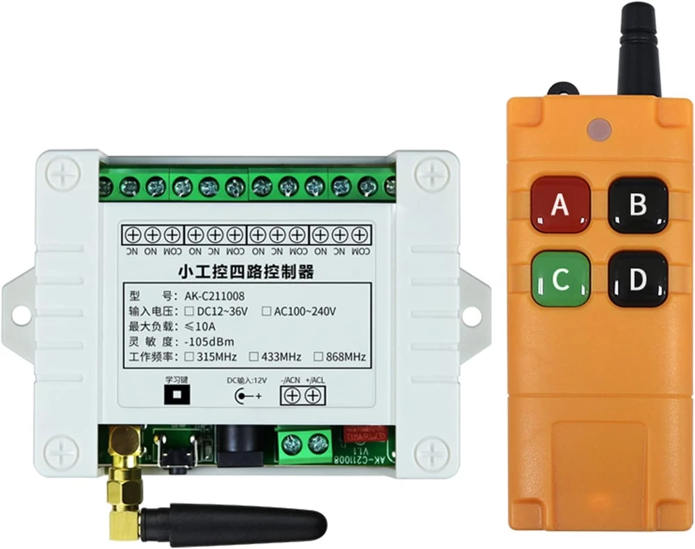 Store New Arrivals Add to Favorite View Feedback Contact Universal Wireless Remote Control AC110V 220V 4CH Relay Radio Controller Receiver Module RF Switch for Gate Garage Opener Dry Contact NO COM NC 110V Receiver Module Switch Gate Garage Opener Description Item model number 03 Item Weight 8.4 ounces Number of Buttons 7 Country of Origin China Batteries 1 9V batteries required. (included) Max Number of Supported Devices 1 Connectivity Technology Radio Frequency Special Feature Universal Package Dimensions 8.62 x 6.69 x 1.93 inches wide voltage input: AC110V-250V, remote distance:300m (in the free field) wireless control, easy to install. The range is about 200-300m in the open air, it can simply pass through walls and so on. But please note: trees, walls or other obstacles will shorten the range.The product has 6 working modes. Signal stability + dry contact: RF remote control uses RF technology and stable signal. The radio receiver is a relay output/potential free, with NO, NC, COM, (Normally open+Normally closed+Common terminal. Wireless control, easy to install. Application scenarios, such as cars, motorcycles; LED lamps / courtyard lights control; electric doors; access control; The product has stable performance, small size and high receiving sensitivity. The product comes with a one-year warranty. If you don't know how to connect the wires, you can and we will assist you. Application+Industrial remote control: such as lampe, pumps, motors, fans, car washing machines, and more.Industrial remote controllers can better meet your needs. delivery 1 x receiver 1 x antenne 1x remote control with battery (If you need more remotes, please let us know/ or You can directly purchase the remote control ASIN: B0BZ76HJDB ) Receiver information Working Voltage: AC110V 220V Current:Standby less than 10mA,Working less than 128mA Working Temperature: -10'C—+60'C Receiver Frequency: 315MHz/433.92MHZ Receiving Sensitivity: -105dB Output State: Switching Value Max Load:10A Relay, Resistive load less than 8A,Inductive load less than 3A Case Size:96* 80 * 29mm Encoding Type: Learning Code Add transmitter by the Learning Button on the receiver explanation working modes Momentary: Press the transmitter button A,the receiver relay A is ON; Release button A ,The receiver relay A is OFF ,The same as B/C/D Toggle: Press the transmitter button A For 1 time ,the receiver relay A is ON; Press button A again,The receiver relay A is OFF ,The same as B/C/D Latched:Press transmitter button A,the receiver relay A is ON,the relay B/C/D is OFF.... Press transmitter button D,the receiver relay D is ON,the relay A/B/C is OFF About Working way: Working way changed by Learning button Momentary: Press the Learning Button 1 times. Relay: Press and hold -> On; Release -> Off. Toggle: Press the Learning Button 2times. Relay: Press -> On; Press same button again -> Off· Latched:Press the Learning Button 3 times. Relay: Press -> On; Press other button -> Off. 2channel Momentary+2channel Latched: Press the Learning Button 4 times. 2channel Momentary+2channel Toggle: Press the Learning Button 5 times. 2channel Toggle+2channel Latched: Press the Learning Button 6 times. About Learning and clearing Method: Learning: Press learning button, the indicator flashes and OFF, loosen finger, press any button of the remote transmitter, indicator flashes three times, meaning learning succeeds.(how many times press the learning button according to the working way you need) Clearning: Hold press learning button about 8 seconds,indicator light flashes several times and ABOUT US We offer the best prices around on high quality products. Our E-store includes media such as books, movies, music and games while offering electronics, toys, sporting apparel, clothing, tools, general home, garden items and more. SHIPPING We are always working hard to ensure your package arrives as soon as possible. Please understand that some factors like weather, high postal traffic, and the performance of shipping companies are outside of our control. We offer free shipping to the lower 48 states and ship within 2 business days of payment, usually sooner. We do not accept P.O. Boxes. Please provide a physical address. For shipping outside of the continental USA, we only use eBay's Global Shipping Program.The item is shipped to KY and then sent to the rest of the world. International customers are responsible for all duties and taxes. Continue to check out in order to calculate costs for shipping the item to your country. Messages regarding eBay's Global Shipping Program MUST be directed at eBay EXCLUSIVELY. RETURNS We offer a 30-Day Return Policy on items which you are not completely satisfied with. You have the option for a full-refund or an exchange of the item. No returns are available on items shipped outside of the USA. PAYMENT We accept PayPal. CONTACT US This page content is yet to come Please ad us to your favorite seller and visit again later Thank You CUSTOMER SATISFACTION We try our very best to make sure every customer is completely satisfied. If there's a problem, message us! We're happy to help. WE ACCEPT Copyright © 2021 AutoDS. | All Rights Reserved