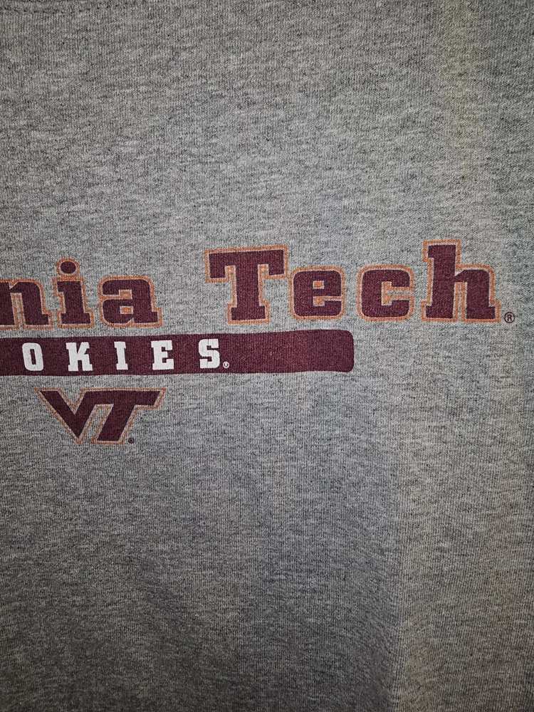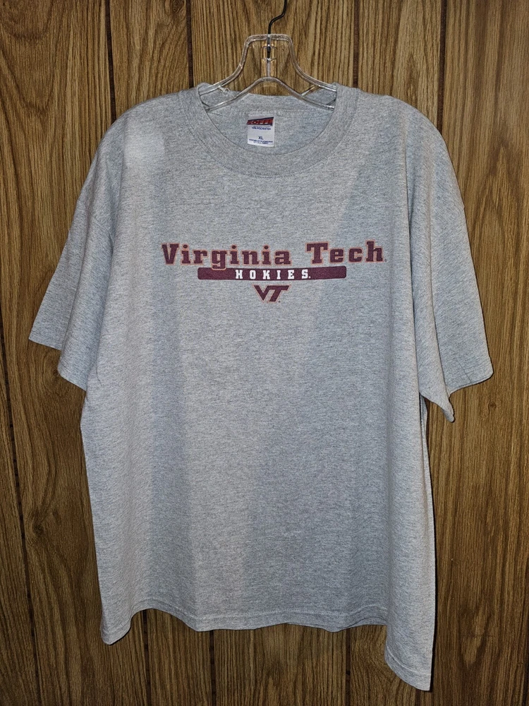 Show your support for the University of Virginia Tech with this older style XL men's gray graphic logo t-shirt. Perfect for any fan of the NCAA team, this t-shirt features the team's logo prominently displayed on the front. The shirt is made from high-quality materials and is designed to be comfortable and durable. Whether you're wearing it to a game or just around town, this t-shirt is sure to make a statement. It's available in size XL and comes in a stylish gray color. Order yours today and show your pride for the Virginia Tech Hokies!