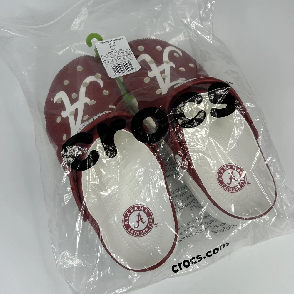 UK Shoe Size: 9 Theme: College, University of Alabama, University, Crimson Tide Model: Classic Croc Style: Clog Brand: Crocs Occasion: Activewear, Casual, Travel Vintage: No Character: Al the elephant Department: Unisex Adults Color: Crimson Red Upper Material: Synthetic Type: Casual US Shoe Size: 10 EU Shoe Size: 43 Features: Ankle Strap, Breathable, Comfort Accents: Logo