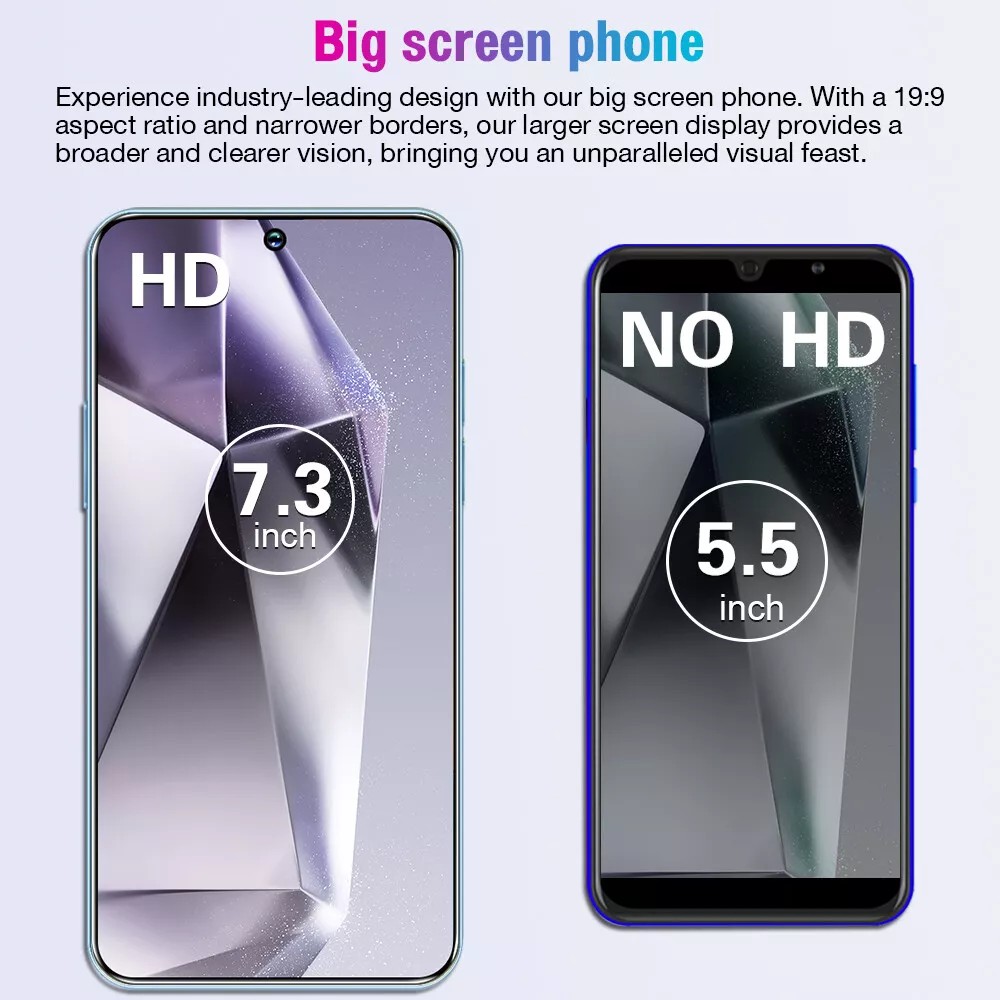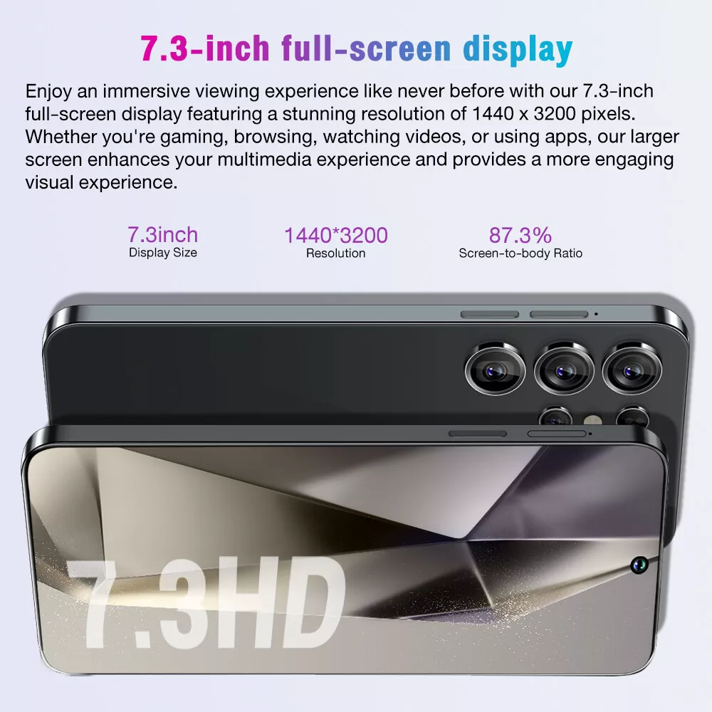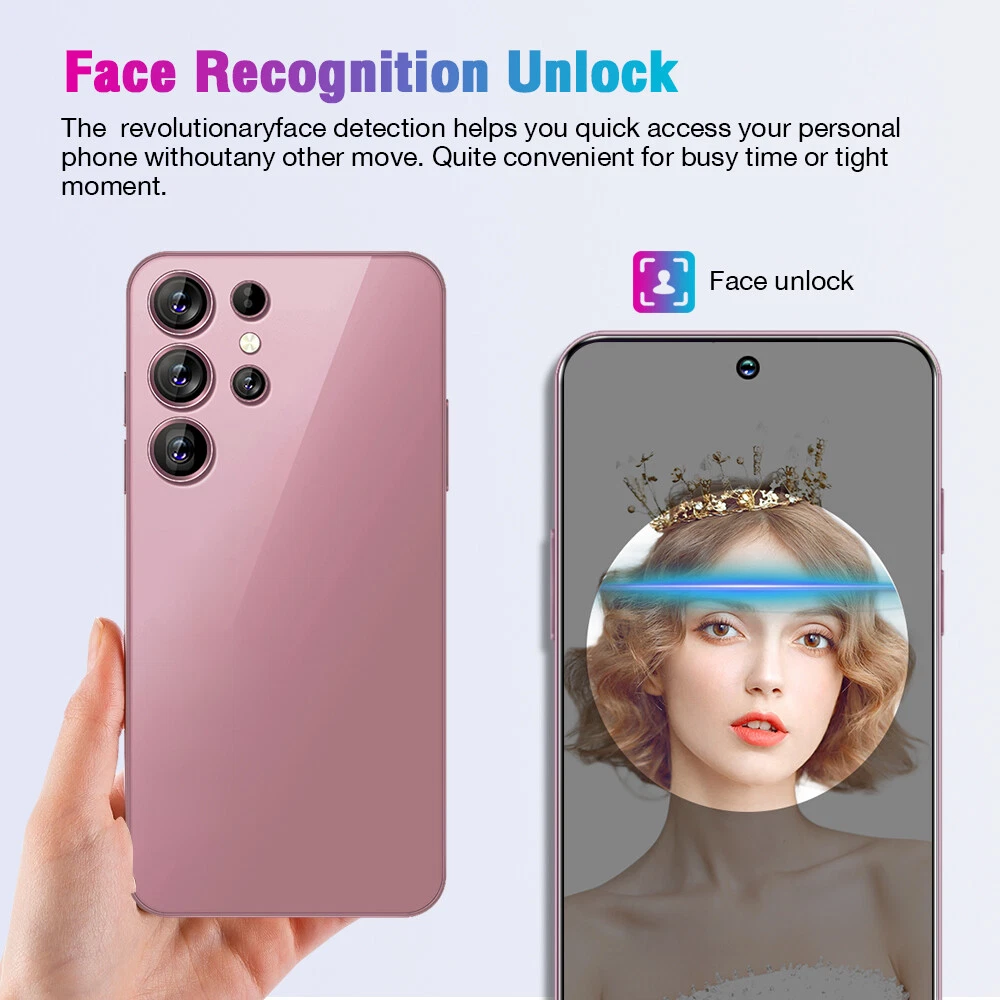 Unlocked 7.3" S24 Ultra 5G Smartphone Android Cell Phone Dual SIM Mobile Phones Factory direct sales, better quality but lower price is our target and mission! Features : - 7.3inch Dewdrop Display The S24Ultra delivers the viewing experience you always wanted, With a massive 93% screen-to-body ratio on a 7.3 "inch screen . - 50 MP Front Camera Clear and Stylish Selfie The S24Ultra world-leading 50 MP front camera turns your every self i e into a work of art e xperience greater brightness, color vibrancy, clarity and dynamic range. E ven in the dimmest light, w henever you need it , your S24Ultra is right there with you, capturing every moment with crystal-clear precision, Turn your selfies into masterpieces and shine in every photo . - 108MP Rear HD camera The S24Ultra features a 108 MP camera combination. The main camera sports a large f/1.8 aperture and 1.28um pixels, This strong combination boosts photo-sensitivity in backlight or low light, Just point and shoot, and S24Ultra will make sure your pictures remain clear and bright . - Face Access The S24Ultra also supports facial recognition u pon activation, S24Ultra scans your facial features and unlocks instantaneously a ccessing your phone has never been so easy, or so fun . - Powerful Performance The Snapdragon 8 gen2 mobile platform with 10mm process technology makes young people who love the young and other popular games. The game is on and lower . - Android 1 3 .0 The new interactive design makes the operation simple and simple, the use of the mobile phone is so simple and straightforward, everything is handy . - Dual SIM card supports TF card Dual card dual standby, card slot does not distinguish between the main and the deputy, supporting the worlds 50 major communication carrier networks Specification: 1.Model No.: S24Ultra 2.Platform : Snapdragon 8 gen2 , Deca Core (Latest 10 Core) 3.Standby: Dual sim dual standby 4.Screen: 7.3 HD+ Full Display 1440*3200 5.Speaker: 1511 Box Speaker 6.Frequency: GSM850/900/1800/1900MHz, 3G:WCDMA850/ 1700/ 1900/2100MHz *4G: TDD(B38\B40\B41 ), FDD (B1\2\3\4\5\7\8\20\28A\28B) * 5G 7.Vibration: Support 8.Colors: B lack /Rose Gold/Blue 9.Memory: 4 GB RAM+ 64G B ROM 10.Multi Media: MP3/MP4/3GP/FM Radio/Bluetooth 11.Camera: 50 MP+ 108 MP 12.Multi Function: Full screen, Face recognition, Dual SIM, OTG, Wi-Fi , GPS, Gravity Sensor, Alarm ,Calendar ,Calculator ,Audio recorder ,Video recorder, WAP/MMS/GPR S , Image viewer,E-Book,World clock,Tasks card , rear flash 13.Languages: Muti-language support 14.Others: Android OS 1 3 .0 System 15.Battery: 80 00 mA h Lithium-ion battery 16.Ultra unibody 17.TypeC input Package Included: 1 x Smartphone, 1 x Charger Adapter, 1 x Headphones, 1 x User Manual , 1 x Phone case , 1 x Protection film 1x OTG Attention: *In terms of memory and capacity, the actual available capacity will be reduced and different due to many factors: because the operating system occupies part of the memory (RAM), the actual available space is less than the marked memory capacity; due to the installation of the operating system and pre-installed programs occupy part of the flash memory (ROM), and the actual available storage space is less than the indicated flash memory capacity. *In terms of charging, data such as speed and duration are all our laboratory data, and the actual situation may vary slightly depending on the version of the test software and the specific test environment. In the end, the actual usage time shall prevail. *When the phone is completely out of power and automatically shuts down, you need to charge your phone for more than 10 minutes to boot. It is recommended to charge when the battery is less than 20% charged. *The screen pictures and product description display pictures provided on this website are all schematic diagrams for reference, and the actual situation shall prevail in kind. *Product pictures, models, data, functions, performance, specifications, user interface and other product information are for reference only. We may improve the above content. For specific information, please refer to the actual product and product manual. remove Unless otherwise specified, the data involved in this website are the results of our internal tests, and the comparisons involved are all compared with our products. *The general mobile phones compared on the page are our own mobile phones. Unless otherwise specified, the product site provided.