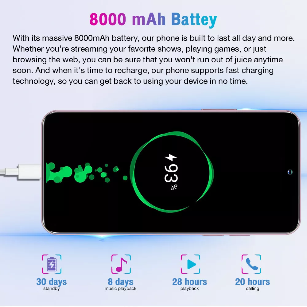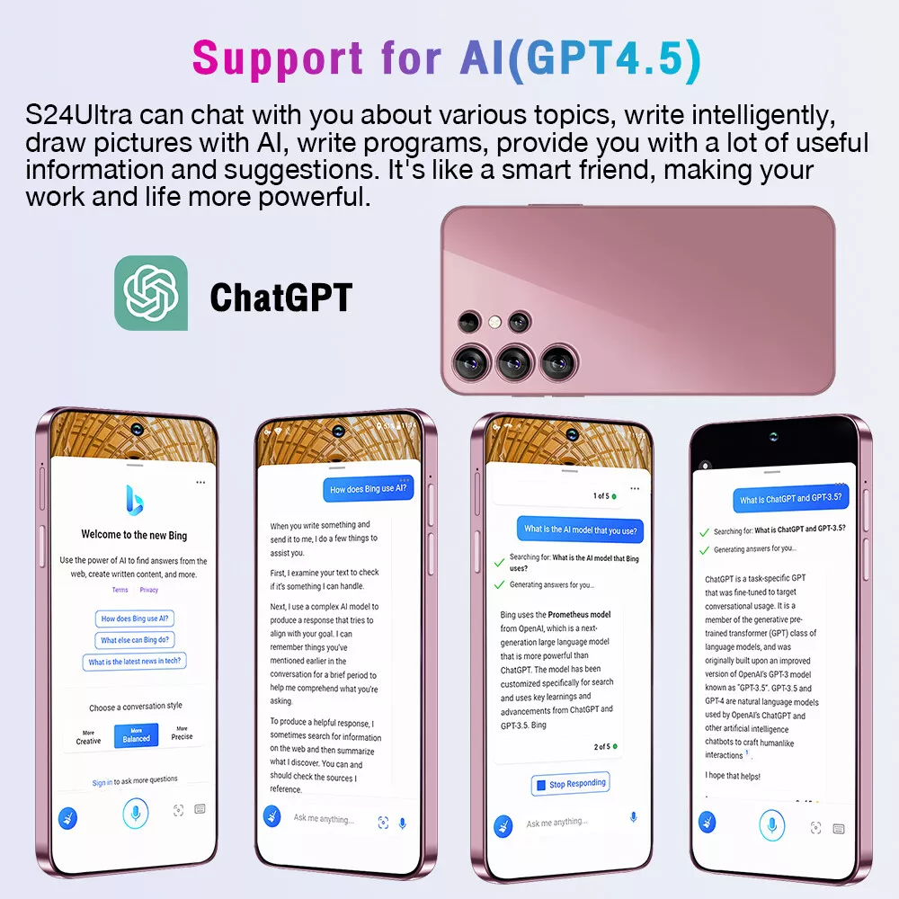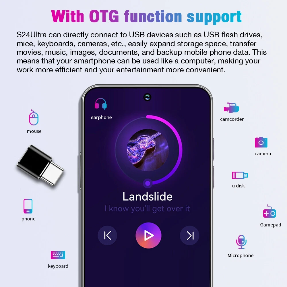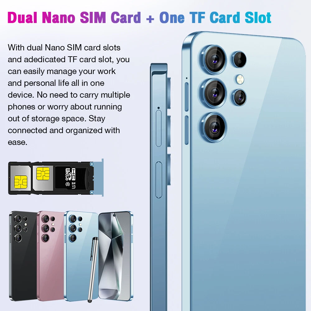 Unlocked 7.3" S24 Ultra 5G Smartphone Android Cell Phone Dual SIM Mobile Phones Factory direct sales, better quality but lower price is our target and mission! Features : - 7.3inch Dewdrop Display The S24Ultra delivers the viewing experience you always wanted, With a massive 93% screen-to-body ratio on a 7.3 "inch screen . - 50 MP Front Camera Clear and Stylish Selfie The S24Ultra world-leading 50 MP front camera turns your every self i e into a work of art e xperience greater brightness, color vibrancy, clarity and dynamic range. E ven in the dimmest light, w henever you need it , your S24Ultra is right there with you, capturing every moment with crystal-clear precision, Turn your selfies into masterpieces and shine in every photo . - 108MP Rear HD camera The S24Ultra features a 108 MP camera combination. The main camera sports a large f/1.8 aperture and 1.28um pixels, This strong combination boosts photo-sensitivity in backlight or low light, Just point and shoot, and S24Ultra will make sure your pictures remain clear and bright . - Face Access The S24Ultra also supports facial recognition u pon activation, S24Ultra scans your facial features and unlocks instantaneously a ccessing your phone has never been so easy, or so fun . - Powerful Performance The Snapdragon 8 gen2 mobile platform with 10mm process technology makes young people who love the young and other popular games. The game is on and lower . - Android 1 3 .0 The new interactive design makes the operation simple and simple, the use of the mobile phone is so simple and straightforward, everything is handy . - Dual SIM card supports TF card Dual card dual standby, card slot does not distinguish between the main and the deputy, supporting the worlds 50 major communication carrier networks Specification: 1.Model No.: S24Ultra 2.Platform : Snapdragon 8 gen2 , Deca Core (Latest 10 Core) 3.Standby: Dual sim dual standby 4.Screen: 7.3 HD+ Full Display 1440*3200 5.Speaker: 1511 Box Speaker 6.Frequency: GSM850/900/1800/1900MHz, 3G:WCDMA850/ 1700/ 1900/2100MHz *4G: TDD(B38\B40\B41 ), FDD (B1\2\3\4\5\7\8\20\28A\28B) * 5G 7.Vibration: Support 8.Colors: B lack /Rose Gold/Blue 9.Memory: 4 GB RAM+ 64G B ROM 10.Multi Media: MP3/MP4/3GP/FM Radio/Bluetooth 11.Camera: 50 MP+ 108 MP 12.Multi Function: Full screen, Face recognition, Dual SIM, OTG, Wi-Fi , GPS, Gravity Sensor, Alarm ,Calendar ,Calculator ,Audio recorder ,Video recorder, WAP/MMS/GPR S , Image viewer,E-Book,World clock,Tasks card , rear flash 13.Languages: Muti-language support 14.Others: Android OS 1 3 .0 System 15.Battery: 80 00 mA h Lithium-ion battery 16.Ultra unibody 17.TypeC input Package Included: 1 x Smartphone, 1 x Charger Adapter, 1 x Headphones, 1 x User Manual , 1 x Phone case , 1 x Protection film 1x OTG Attention: *In terms of memory and capacity, the actual available capacity will be reduced and different due to many factors: because the operating system occupies part of the memory (RAM), the actual available space is less than the marked memory capacity; due to the installation of the operating system and pre-installed programs occupy part of the flash memory (ROM), and the actual available storage space is less than the indicated flash memory capacity. *In terms of charging, data such as speed and duration are all our laboratory data, and the actual situation may vary slightly depending on the version of the test software and the specific test environment. In the end, the actual usage time shall prevail. *When the phone is completely out of power and automatically shuts down, you need to charge your phone for more than 10 minutes to boot. It is recommended to charge when the battery is less than 20% charged. *The screen pictures and product description display pictures provided on this website are all schematic diagrams for reference, and the actual situation shall prevail in kind. *Product pictures, models, data, functions, performance, specifications, user interface and other product information are for reference only. We may improve the above content. For specific information, please refer to the actual product and product manual. remove Unless otherwise specified, the data involved in this website are the results of our internal tests, and the comparisons involved are all compared with our products. *The general mobile phones compared on the page are our own mobile phones. Unless otherwise specified, the product site provided.