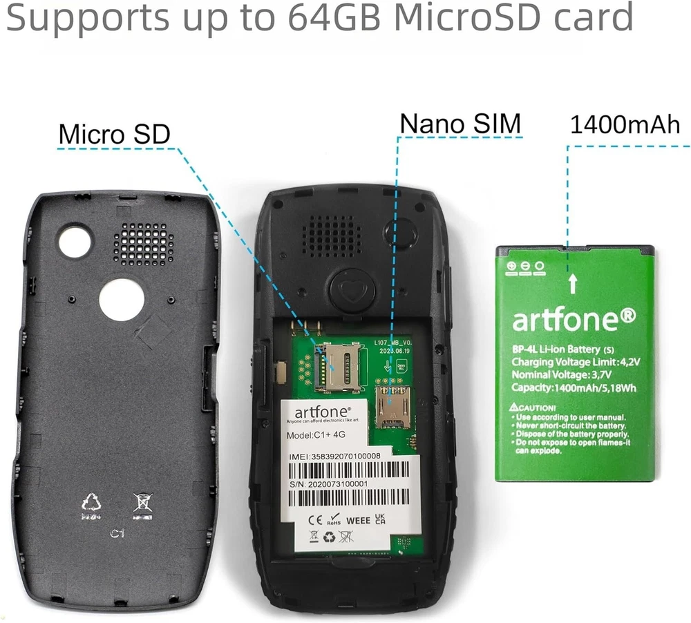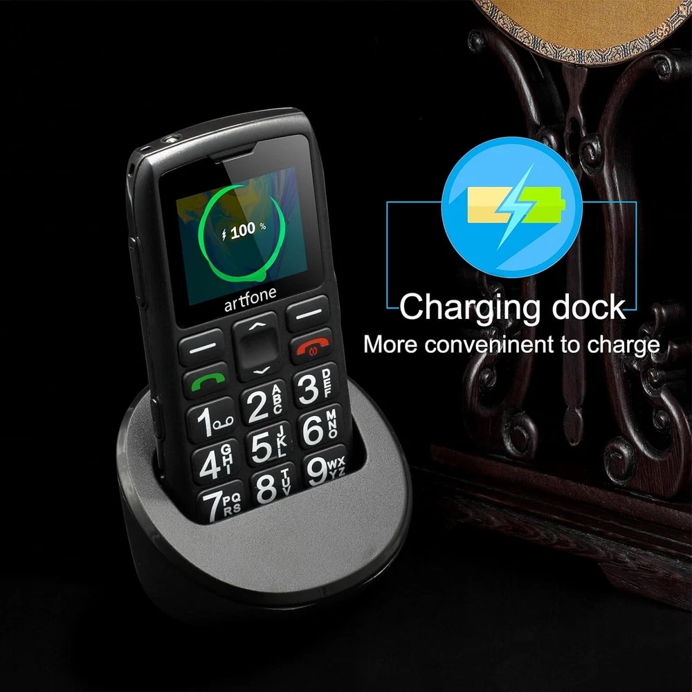 Why Choose Artfone C1+ 4G, SOS Button Phone? If you are looking for a simple, easy-to-use, and reliable phone for yourself or your loved ones, you should consider the Artfone C1+ 4G phone. This phone is specially designed for seniors, kids, and visually impaired people who need a phone that can make calls, send texts, and perform basic functions without any hassle. The Artfone C1+ 4G, SOS button phone has many features that make it stand out from other similar products on the market. Here are some of them: Unlocked to T-Mobile, MetroPCS, SpeedTalk, Tello and RedPocket GSMT 4G Nano SIM Card. Please note that this phone is NOT compatible with AT&T, Cricket or with any CDMA Networks like Verizon, Sprint, and Boost Mobile. Product specifications: Chipset: Spreadtrum T107 CPU frequency: 1000MHz Display: 1.77-inch QVGA Battery capacity: 1400 mAh Standby time: 240-300 hours Headphone jack: 3.5 mm Card slots: Single standard SIM card + 1 SD card Micro SD Card: Support (expands up to 32GB) Speaker: Yes Headphone jack: 3.5 mm socket Flash memory: 128 + 48 MB 4G bands:FDD B2/4/5/12/13/17/26/66+TDD B41 Support languages: English, German, French, Italian, Spanish, Polish, Dutch, Czech, etc. Functions: Flashlight, SOS button, support headphones (not included) Packing included: 1 x Mobile phone 1 x Charging station 1 x USB charging cable 1 x Instruction 1 x Charger Supports 4G Nano SIM Card and Report the Real-time You can use 4G nano SIM card from carrier, and enjoy fast and stable connectivity wherever you go. You can also press and hold the volume + key to hear the time in real time, which is very convenient for those who have difficulty reading the screen. Backlit Large Buttons, Large Font and Large Icon Software One of the most common problems that seniors, kids, and visually impaired people face when using a phone is the difficulty of seeing and pressing the buttons, and reading the text and icons on the screen. The Artfone C1+ 4G phone solves this problem by having backlit large buttons that are easy to see and press, even in the dark. The phone also has large font and large icon software that makes the menu and interface clear and simple to navigate. You can adjust the font size and contrast according to your preference and comfort. AAC Receiver, 2030 Large Speaker Box Another common problem that seniors, kids, and visually impaired people face when using a phone is the poor sound quality and volume of the calls. The Artfone C1+ 4G phone solves this problem by having an AAC receiver and a 2030 large speaker box, similar to the iphone’s AAC receiver, that ensure loud and clear calls every time. The AAC receiver reduces the background noise and enhances the voice clarity, while the 2030 large speaker box amplifies the sound and delivers rich and crisp audio. You can also use headphones (not included) to listen to the calls privately. Multifunctional, Built-in Audio, Video, Bluetooth, FM Audio, etc. The Artfone C1+ 4G button phone is not just a phone, but also a multifunctional device that can entertain and assist you in various ways. The phone has built-in audio and video players that can play your favorite songs and videos from the micro SD card (not included, expands up to 32GB). The phone also has Bluetooth and FM audio functions that allow you to connect to other devices and listen to the radio wirelessly. The phone also has a calculator, an alarm clock, a calendar, and a flashlight that can help you with your daily tasks. The phone can store up to 100 phone book entries, which is very convenient for keeping in touch with your family and friends. High-end Chip T107, Stable Quality and Performance The Artfone C1+ 4G phone is powered by a high-end chip T107, which not only improves the phone’s network signal, but also makes the phone stable in quality and performance. The phone does not malfunction or freeze during operation, and can handle multiple tasks smoothly and efficiently. The phone also has 128 + 48 MB of flash memory, which is enough for storing your basic data and files. High-quality Lithium Battery, Long-lasting Power The Artfone C1+ 4G phone has a high-quality lithium battery that provides long-lasting power for your phone. The improved 1000 mAh battery has a higher battery capacity than any similar product, and can support uninterrupted talk time of 4-5 hours and standby time of 200 hours (8-10 days). The phone also has two charging methods, one is to use the USB cable alone, and the other is to use the charging base. The charging base is very convenient and safe to use, as you just need to slide the phone into the charger and it will start charging automatically.