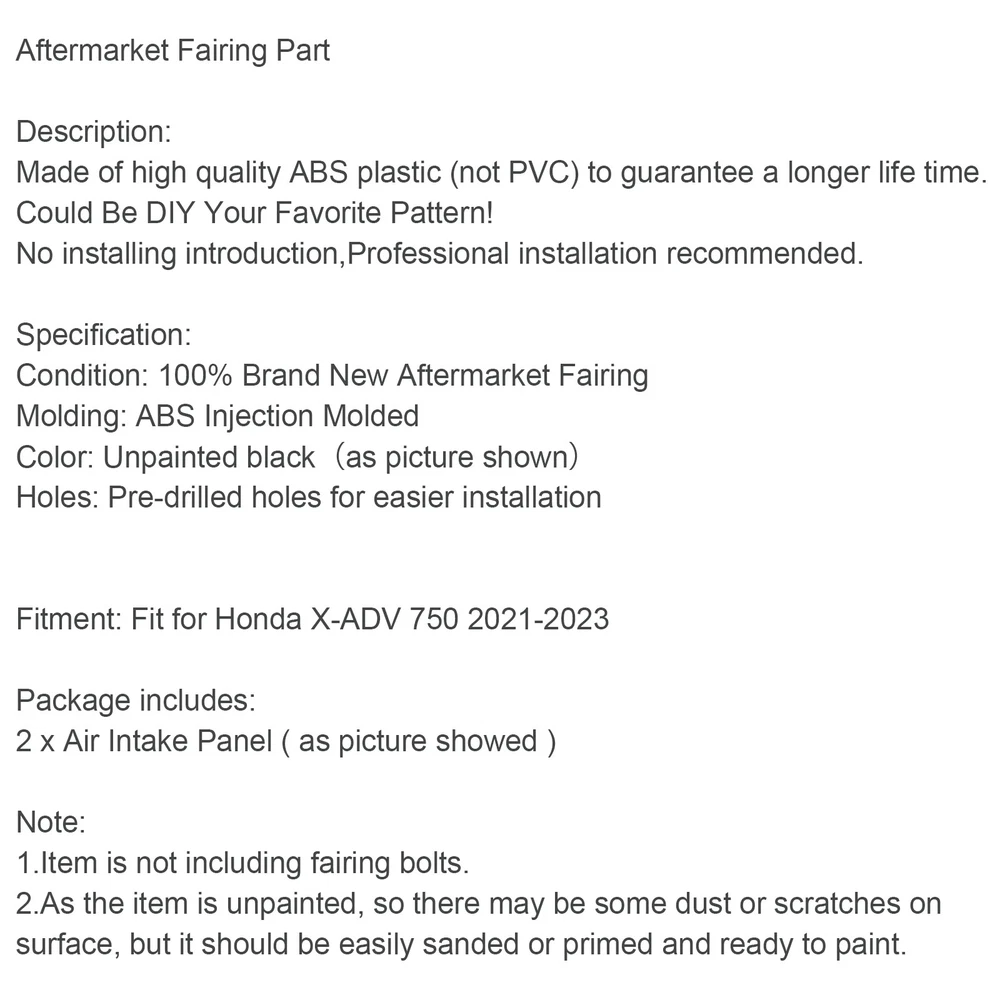 You may also like Rear Turn Signals Lens Fits Kawasaki Concours 08-10 ZX14R 06-10 ZX10R 06-07 S 36.85 USD Free shipping Front Axle Fork Protect Wheel Slider C-Chrome Fit For Bmw R Nine T R9T 2020-2021 28.85 USD Free shipping Lower Driver Seat Frame Cover Fairing For Suzuki GSXS GSX-S750 2017-2021 Blue 121.85 USD Free shipping 10mm Billet Swingarm Spools Sliders For Kawasaki Ninja 250R 1000 ZX 6R ZX10R Red 21.85 USD Free shipping CNC Frame Hole Plug Protector Titanium Fit for Yamaha XP 530 T-Max 530 2005-2016 12.85 USD Free shipping Upper Headlight Fairing Stay Bracket Cowling Fit for Suzuki GSX-R 600 750 K4 K5 67.85 USD Free shipping Injection ABS Bodywork Fairing Kit For Kawasaki VERSYS 650 KLE 2022-2024 02# 556.85 USD Free shipping Front Headlight Guard Cover Protector Acrylic Fit For Yamaha Tenere 700 19-23 46.85 USD Free shipping 2x10mm CNC Motorcycle Swingarm Spools Slider For KAWASAKI ZX10R Z800 Z1000 UE OG 20.85 USD Free shipping Front Nose Fairing Beak Fender Cover For BMW R1200GS / ADV 2014-2018 Copper 229.85 USD Free shipping Silver Speedometer Trim Bezel Cover Fit for BMW R Nine T Scrambler Urban 17-21 15.85 USD Free shipping Front Headlight Guard Cover Grille Black Fit For Vespa Sprint 150 2016-2021 17 21.85 USD Free shipping Aftermarket Fairing Part Description: Made of high quality ABS plastic (not PVC) to guarantee a longer life time. Could Be DIY Your Favorite Pattern! No installing introduction,Professional installation recommended. Specification: Condition: 100% Brand New Aftermarket Fairing Molding: ABS Injection Molded Color: Unpainted black(as picture shown) Holes: Pre-drilled holes for easier installation Fitment: Fit for Honda X-ADV 750 2021-2023 Package includes: 2 x Air Intake Panel ( as picture showed ) Note: 1.Item is not including fairing bolts. 2.As the item is unpainted, so there may be some dust or scratches on surface, but it should be easily sanded or primed and ready to paint. -About US Founded in 2012, VIPJQ have professional development and sales, and are involved in various products, providing customers with various high-quality products. Since its establishment, VIPJQ has always adhered to the service concept of "customer first" and the management concept of "pursuit of quality", and is committed to providing customers with high-quality original designs. We commit to provide you the best innovative, quality products & professional services with competitive prices. We value every customer, and we look forward to providing solutions for your business needs to help your business achieve its goals, please contact us immediately! We are all about you! We are a Japanese seller,but with large warehouse in USA. We are profesional on Auto Parts,Car Parts,Motorcycle Parts,3C,other hot sale items and so on. We aim to provide to customers high quality product and best service. -About Shipment&Returns The item usually will be dispatched within 3 days after you ordered.All are free shipping. And it usually takes 3-10 working days to delivery depends on buyers' address or other majeure on the way. If you are not satisfied with the items and want to return the item,we hope you could message us first,we will give you the return details, we think we could give you the best service to save your time and money.Thank you. -About Feedback&Customer Service If you are enjoy your shopping here,not only enjoy the items but also the service,we are appreciate you could give us a 5-star feedback. If you are not satisfied with the item,before you give us the negative feedback,we hope we could give you the best solution through our commutication. We think we could do it if you give us the chance.Thank you.