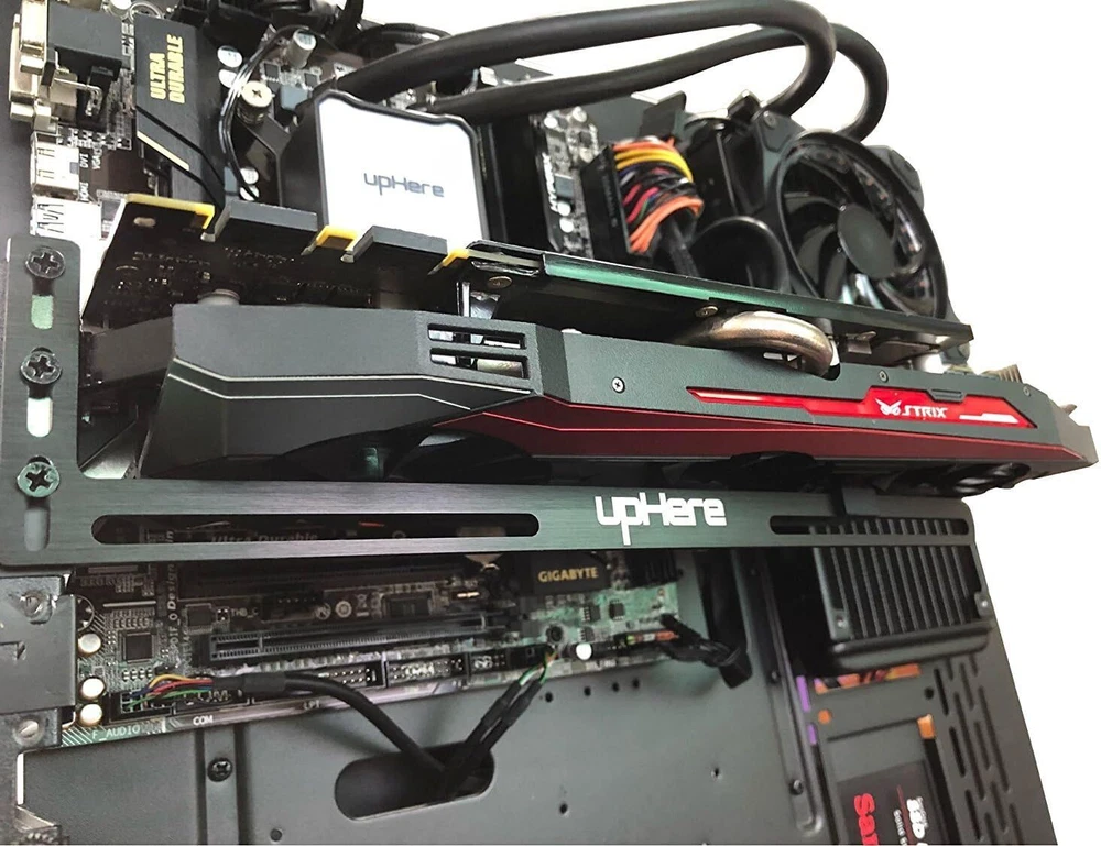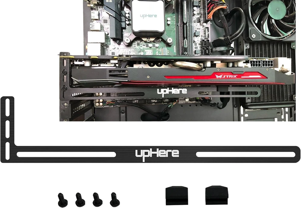 upHere Graphics Card GPU Brace Support Video Sag GL05 Black Holder Product Details Finish Type: Black Item Depth: 28 centimeters Mounting Type: Tabletop Mount Manufacturer: upHere Chipset Brand: NVIDIA Color: GL05 Black GPU Holder Brand: upHere Material: Aluminum Item dimensions L x W x H: 11.02 x 0.47 x 2.44 inches Item Weight: 0.07 Kilograms Simple and Convenient adjustment method.Compatible with almost motherboards and cases. Sturdy GPU Stand Bracket Kit.Prevents GPUs from bending and sagging after long period of use. Contains two kinds of sliding rubber pads,suitable for different cooling fan spacing of GPU. Low-key matt black aesthetic that improves the look of your PC.Low profile for single or dual setups. Showing the details of the workmanship. It is a small graphics card support stand with three complex production process.