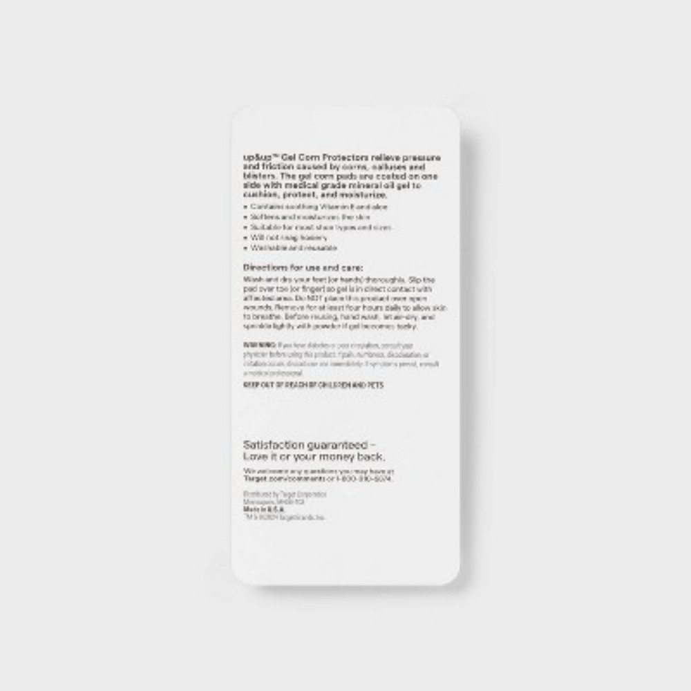 Description If corns are causing you pain whenever you spend time on your feet, help cushion and protect them from shoe pressure with up&up™ Gel Corn Protectors. Made with gel pads to reduce friction and soft, stretchy design that fits over your toe without using adhesive, this pack of gel corn protector sleeves can help you get back to focusing on the workday or enjoying a night out by reducing irritation and pressure. Plus, the gel contains mineral oil to help soften corns and moisturize skin. We believe making smart choices for the people, places, and pets in your life should be easy and affordable. And, having quality you can trust should be a given. That’s why you can count on our promise – caring for your everyday in every way. Satisfaction guaranteed – Love it or your money back. highlights Packaging may vary. Same trusted quality Gel corn protectors cushion corns against pressure and friction Soft and stretchy sleeve design stays in place without adhesive Specially formulated gel contains mineral oil to moisturize and soften skin If you’re not satisfied with any Target Owned Brand item, return it within one year with a receipt for an exchange or a refund Allergens & Warnings: WARNING: If you have diabetes or poor circulation, consult your physician before using this product. If pain, numbness, discoloration or irritation occurs, discontinue use immediately., KEEP OUT OF REACH OF CHILDREN AND PETS