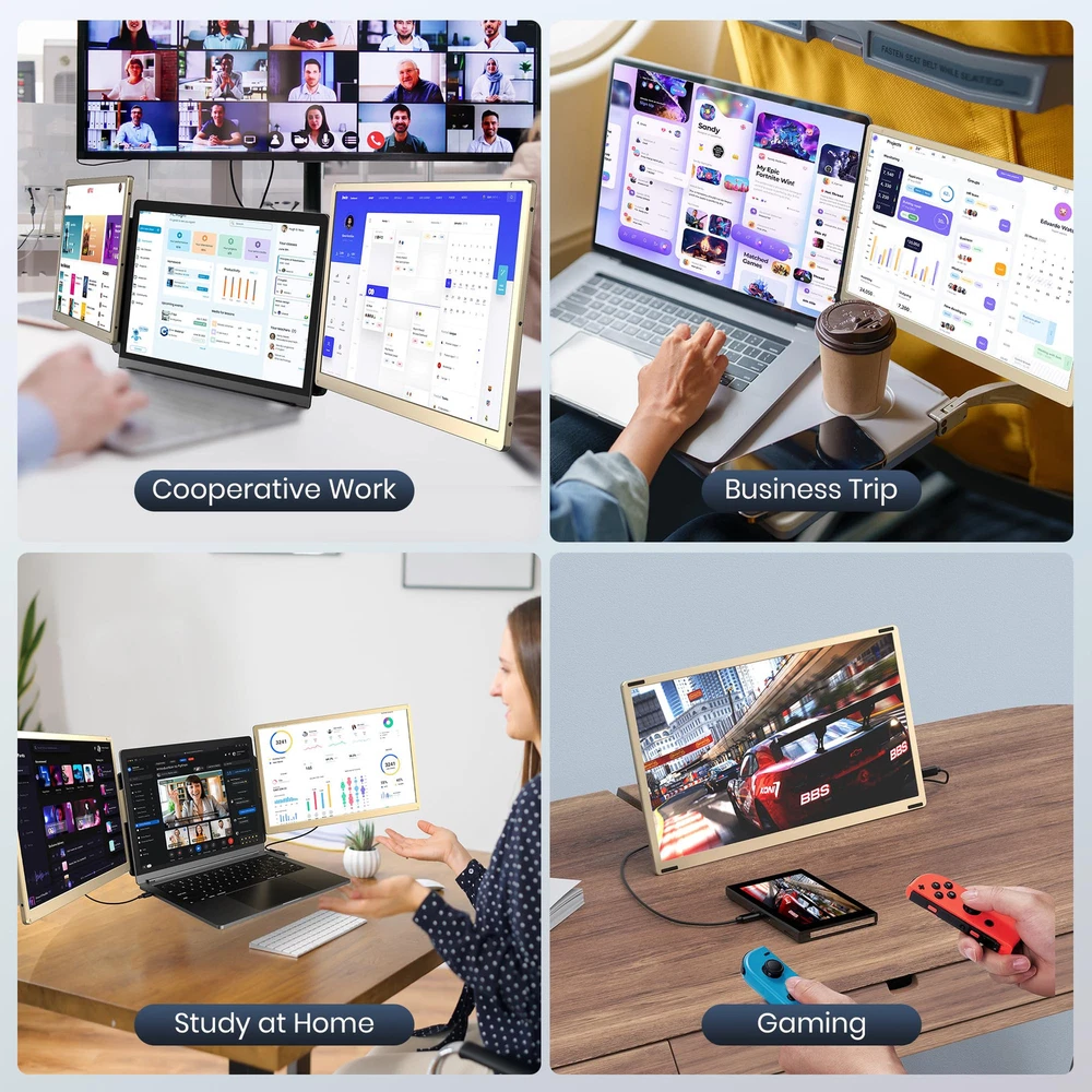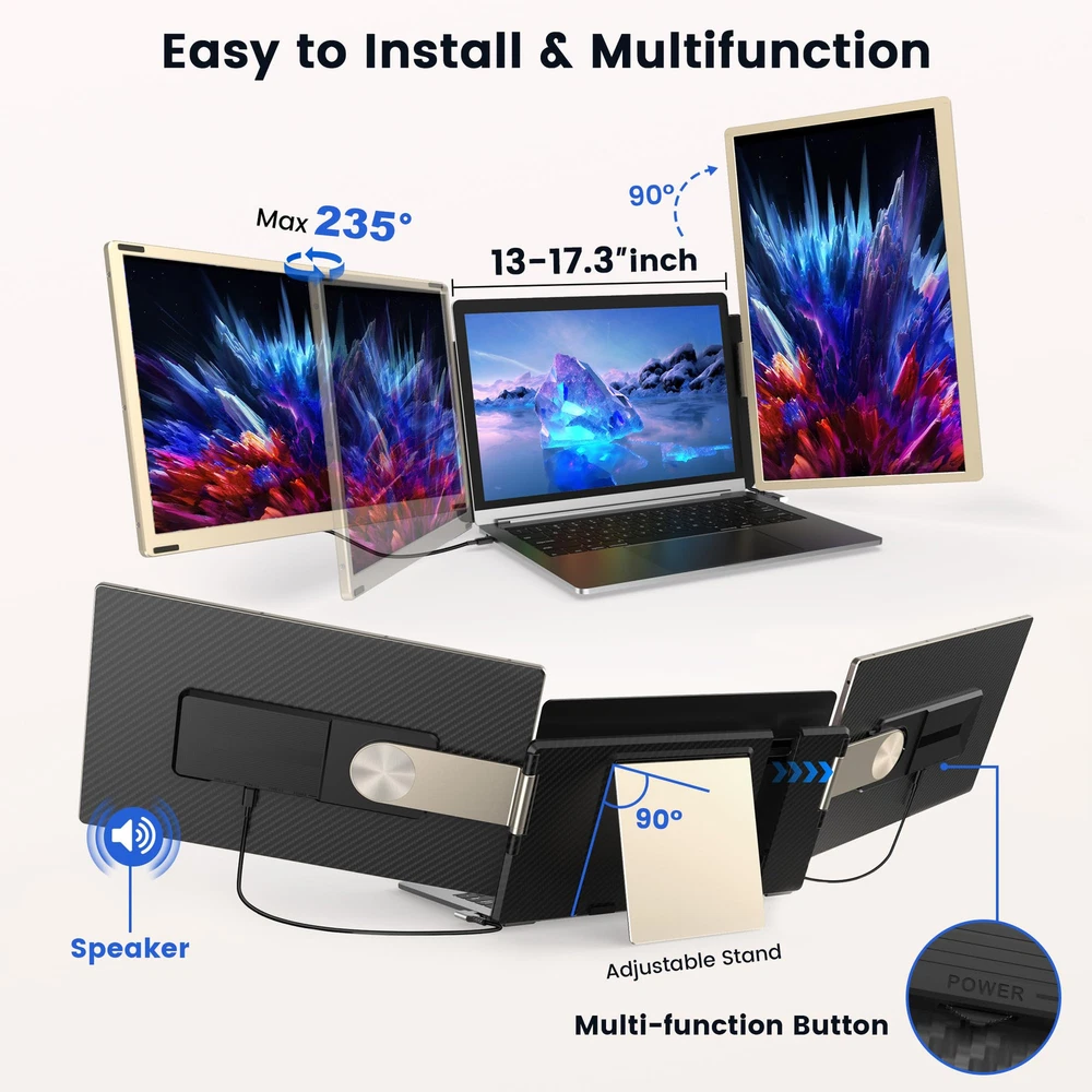 New upgraded laptop monitor extender:Made of aluminum alloy and PC material, this new generation laptop screen extender is durable and drop-proof; and the upgraded magnetic structure makes it more stable. A variety of screen combinations and its detachable screens can meet all your needs, allowing you to entertain easily and work conveniently. Perfect for mobile office, remote workers, IT, gamers, stock traders, programmers and more 1080P IPS FHD quality:The triple portable monitor laptop uses 15.6-inch FHD 1080P IPS screen, providing you higher image quality, brighter screen and more vivid colors. With the built in speakers, you can enjoy a better viewing experience. At the same time, the low-blue light design portable display has anti-glare and flicker-free functions, which provides eye protection 300% Improve work efficiency:15.6" Portable laptop screen triple monitor with 2 additional detachable screens, supports 235° horizontal rotation and 90° vertical rotation, horizontal mode, portrait mode, dual screen display and other combinations to provide you a variety of viewing angles, enables you to open multiple windows at the same time. Working on different screens, video conferencing, watching movies, etc. No need to switch back and forth on one screen, improve productivity and save your time Plug and Play, no driver required:This is a laptop triple screen extender for 13.3"-17.3" laptops, whether you choose a USB-C, USB-A or HDMI connection, simply plug in the laptop screen extender and start your daily use without drivers. (Please note: When using the HDMI cable, connect an additional USB-A to USB-C cable on the same screen extender for power supply) Broad compatibility and Christmas gift: Laptop screen extender supports a variety of devices and operating systems, and this triple screen laptop monitor extender is compatible with Windows, Mac (does not support M1/M2/M3 chip), Chrome, Android, Linux, Dex other devices, please read the instructions carefully before use. If you have any questions, feel free to contact us and we will get back to you within 24 hours
