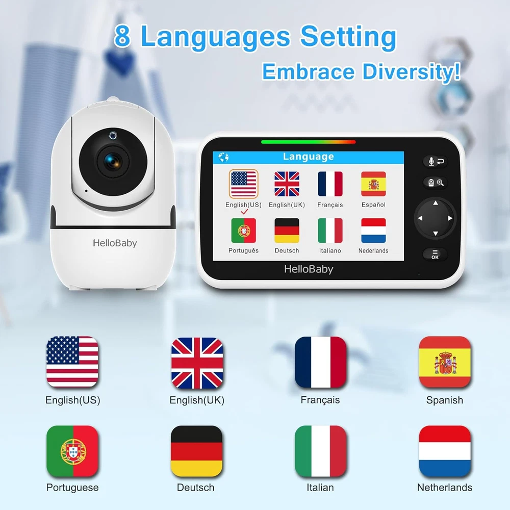 Remote 355° Pan and Tilt Baby Monitor & 5" Color Display: Enjoy a 5" Big Screen on this baby camera monitor. Remote control camera rotate 355° in horizontal and 120° vertical gives you a larger view of your baby's room. 2X zoom function ensures clear visuals. Noiseless camera rotation for a peaceful environment. Infrared Night Vision & 2-Way Audio Video Baby Monitoring: Crisp night vision gives you a clear view of your little one as they snooze, even in low-light conditions. We are the first brand to adopt the invisible infrared LED baby monitor, you can have a clear video feed at night without disrupting your little baby. Easy Set up & Safe Baby Monitor No WiFi Needed: This is a non-wifi video baby monitor. Adopted advanced 2.4GHz FHSS and digital encryption technology. The data transferred between the camera and monitor is so fast, and you don’t need to worry about hacking risks. Believe me, your baby is safe. Bonus surprise: No subscription fees! Smart Baby Monitor Features: The crystal clear Two-Way Audio feature allows conversation both ends as clear as if you were in the same room with your little one. Room Temperature Monitor and Alert, Night vision, 8 Lullabies, Sound Level LED Indicator, Audio only Saving Power Mode, Tabletop or Wall Mounting Options, Multi-Camera Expandability (up to 4 cameras), Date/Time on the Screen, ideal for baby register, baby shower, new parent. Selling #1 Baby Monitor, 100% Customer Satisfaction Guaranteed: The Most worthwhile video baby monitors, great for friends, new moms, baby registry! We provide the same assurance for presents! If you need "Extra cameras for HB6550", just get 2cams-HB6550 or contact the seller for the right camera. Contact us anytime for any questions or concerns! Product Description Some updates on HB6550 2024 Listened to the feed-back from millions of parents, we have made some updates to our HB6550 video baby monitors. Here are the key improvements: Extended Battery Life: Enjoy 16 hours in Video Mode and 30 hours in Voice Mode! 2000mAh to 3500mAh. Enhanced Night Vision Picture Quality Added an Antenna, Lift up the ANTENNA for an Excellent Signal Easier to be Installed: original one - with the hole at the bottom of camera; new one - without the hole (mounting screws included, the upgraded version makes mounting to the wall easier!). Our wall mounting shelf(not included) works with all HelloBaby baby cameras. We work hard, we value your ideas and are committed to continuous improvement. Thanks for your support! However, please note that this update makes the camera incompatible with your previous one . If you require additional cameras compatible with your previous HB6550, please contact the seller , and we will be happy to provide you an extra camera with dis-counts or a free update. Feel free to reach out if you have any questions or need further assistance. Hope HelloBaby baby monitor HB6550 can give you peace of mind!! Need help matching multiple HB6550 cameras? Directly contact the seller on amazon! 5'' Large Screen of HelloBaby Video Baby Monitor PTZ (Pan-Tilt-Zoom) HelloBaby NO WiFI Baby Monitor with 5 inch screen is Easy to Set up. This baby camera monitor not only Saves Energy and Power, it can also run fast and start up only in 3-4 Seconds. By pressing the "on/off" button, you can Remotely take care of your child, Relieving the Pressure on parents and enabling you to do more while taking care of your child. Remote Pan/Tilt/Zoom (PTZ) baby monitor, your baby's safety is our top priority. Some details maybe not noticed by you, but babies can feel. 1.Speaker on the baby unit is on the back, avoids loud noises frightening infant, while they can enjoy soft lullabies; 2.Compared with other nightvision monitors, this one adopted International Advanced Lightless Night Vision Lamp, less fear of your child; 3. The first low emf baby monitors; 4. Silent rotation. More surprise, just get it! Key Features EOX Mode (last 30 hours) Remote Pan / Tilt/ Zoom Camera Invisible IR Night Vision Two-way Talk Back and 8 Lullabies Expandable up to 4 Cameras and No WiFi Time Showing & Feeding Alarm Temperature Monitor and Outrange Alarm Temperature Alert & 8 Peaceful Lullabies - Temperature sensor always ensure the baby room or nursery is at a comfortable temperature, and alert you when temp exceeds the range you set. - Baby monitor comes with 8 cute lullabies to help soothe your fussy baby and make it easy to get to bedtime. Crisp Two-Way Audio Baby Monitor The built-in microphone and speaker give you direct communication to your baby, even if you’re elsewhere in the home. 1. Always hear what is going on in the nursery; 2. Refer to point 8.2 on the manual to adjust the volume; (3 step, 2 seconds). 3. No static or interference! Long Long Range Baby Monitor Get a clear and stable live-stream from anywhere in your home with wireless range coverage. Keep an eye on my infant from different rooms! Note: Supports 1000ft max. in an open area. Extend the antenna on the screen to have a great signal. Connect Up to 4 Cameras, HB6550-2 is available now! This expandable baby monitor system can monitor multiple rooms with up to 4 cameras. 1. Could not compatible with other models; 2. For the update, contact the seller for your right cameras; 3. Go to our store for "HB6550 with 2 cameras", "HB6550 with 3 cameras", "HB6550 with 4 cameras". Hacking Free Video Baby Monitor No WiFi No App Needed Plug in, and give you peace of mind! 1. So easy! Easy to use, easy to set up, no app downloading, no subscriptions! 2. Easy to set up, just plug in the camera and go; 3. Make sure your privacy, no one can watch you and/or your baby but you; 4. Adopted advanced Frequency-Hopping Encryption Technology (FHSS), lower latency! Auto-on Screen in VOX Mode (Sound Activated Baby Monitor) VOX--Light up the screen whenever your baby cries, sighs or make any noise. Anxiety reliever! 1. 3 sitivity level or disable the VOX/ECO function to keep the screen on. 2. Saving power(up t