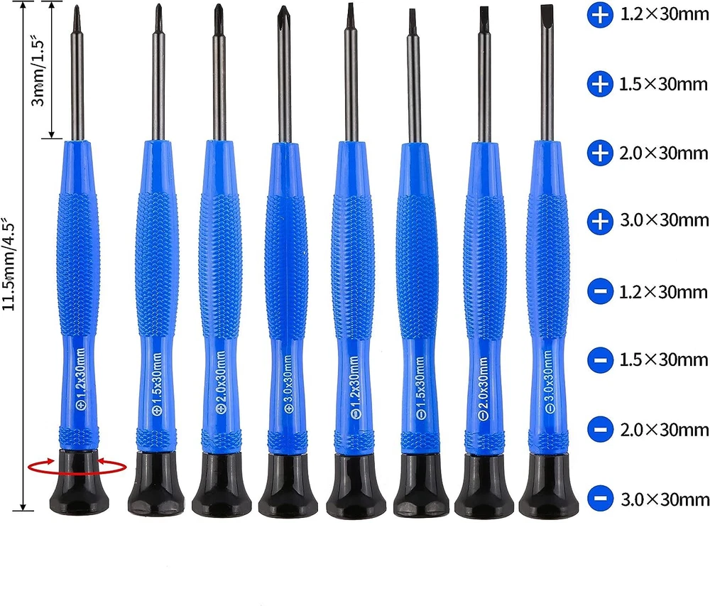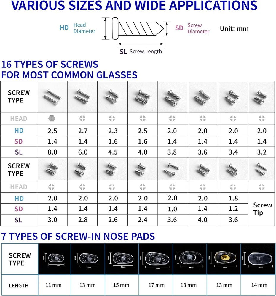 πŸ’œ Complete & Exquisite Eyeglass Repair Kit: Our eye glass repairing kit includes 4pcs Phillips and 4pcs Flathead magnetic screwdrivers, 16 sizes of tiny eyeglass screws, 14 pairs of eyeglass nose pads(7 different sizes), 1 curved tweezer, 1 micro screwdriver, washers, nuts, screw caps, cleaning cloth and screw box for glasses repair. With this glasses repair kit, you can repair your glasses everywhere whether you want to change nose pad or your glasses screws are aging or missing. 🧑 Useful & Comfortable Precision Magnetic Screwdriver Set: We have PH0000/1.2, PH000/1.5, PH00/2.0, PH0/3.0 Phillips screwdriver set and 1.2mm, 1.5mm, 2.0mm, 3.0mm Flathead screwdriver set in our glasses repair kit that are great for tiny screws. πŸ’› Multi-functional Keychain Screwdriver: The 3 in 1 keychain screwdriver includes Phillips and Flathead screwdriver and nut holder, which is designed for eyeglasses repair, but you can also attach it to your key chain for standy applications. πŸ’š Various Nose Pads & Screws : Our eyeglass repair kit is also equipped with 11/13/15/17mm different nose pads. You can choose according to your needs. Besides, 16 sizes of tiny screws can also meet your requirement. You can use the curved tweezer included in this kit to grip these tiny screws. And they are all included in our screw box, which is quite convenient to collect and carry. πŸ’™ Widely Applications: The Phillip and Flathead screwdriver covers a wide range of works and repairs in our daily life. This repair tool kit can used for eyeglass, sunglasses, watches, clocks and those small electronics with tiny screws. Product Description Flexible with Swivel Cap It is equipped with flexible swivel cap, which is convenient to hold in hand and freely turn with swivel cap, good for long time use. Complete Screwdriver Set Our eye glass repairing kit includes 4pcs Phillips and 4pcs Flathead screwdriver, which are PH0000/1.2, PH000/1.5, PH00/2.0, PH0/3.0 Phillips screwdriver set and 1.2mm, 1.5mm, 2.0mm, 3.0mm Flathead screwdriver set. Non-slip Handles The handle of the screwdriver set is made of plastic, which is non-slip when using. You don't need to worry about falling it down easily.