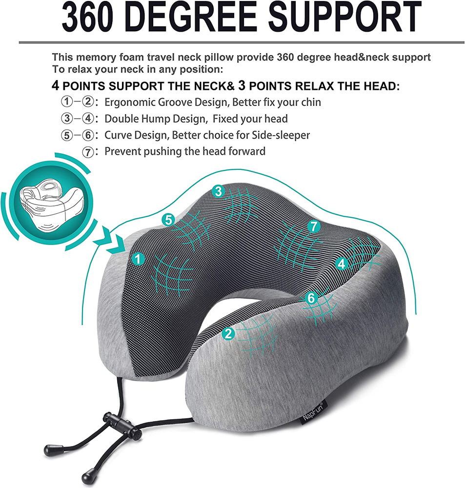 PERFECT CHIN SUPPORT TRAVEL NECK PILLOW - This airplane pillow can better wrap your neck and free your chin, prevents the head from falling forward, relieves neck pain during travel. BEST NECK PILLOW FOR TRAVELING - Unlike other travel pillows, This flight pillow can provide perfect support to protect the neck when you are sitting in the airplane, car, train, or bus. PREMIUM MEMORY FOAM - napfun ERGONOMOR travel pillow was made of high quality memory foam with 5 seconds return technology, comfort and durable. REAL PORTABLE PLANE PILLOW - The headrest pillow was designed for portability and comfort. It comes with a portable travel bag that allows the travel pillow to compress down to a smaller size. LIFETIME REPLACEMENT GUARANTEE - If you have any problems, we promise to offer you a prompt and full refund! Product Description The video showcases the product in use. The video guides you through product setup. The video compares multiple products. The video shows the product being unpacked. hero-video Merchant Video napfun devote to making perfect travel pillows by taking suggestions from 30,000 buyers. continuously improve product quality & buyer experience. napfun creates the best shopping experience & product usage experience for each buyer, with the best quality products & a professional after-sales team. Series 3 Simple Sets Series 3 Simple Sets comes with: Travel Pillow Travel Bag Series 3 Luxury Sets Series 3 Luxury Sets come with Series 3 Simple Sets (Travel Pillow + Travel Bag) Sleep Mask Earplugs Super-soft eye Mask NAPFUN eye mask was made of super soft material, with zero pressure on your eyes Memory Foam Earplugs NAPFUN earplugs contain micron-level air permeation holes inside, providing strong sound absorption. 1 Series 3 Simple Sets 2 Series 3 Luxury Sets 3 Super-soft eye Mask 4 Memory Foam Earplugs Find Your Style What You Get Please open the Black travel bag and check out the items inside. First-use Tutorial Please follow the steps after receiving product How to store After use? Find Your Size Find Your Size by Adjusting the string closure. 1 What You Get 2 First-use Tutorial 3 How to store 4 Find Your Size How should I use the pillow properly after receiving it for the first time? The product is sealed in a travel bag, so it can not be ventilated in transit; consumers who are particularly sensitive to the smell are advised to put the pillow in the vent for 24-72 hours before use. What are the dimension differences between the Small and Medium versions? Our napfun Pillow comes in one small size and is recommended for a Weight of 90-140 LB. Our NAPFUN Pillow Medium size is designed for a Weight of 120-200LB. NAPFUN Pillow SMALL: 9.65 x 9.65 x 4.33 inches NAPFUN Pillow MEDIUM: 10 x 10 x 4 inches When I receive travel pillow set, what parts are in the package? Series 3 Simple Sets(1 x premium high-elasticity memory foam travel pillow, Pillow in the Travel Bag ) Series 3 Luxury Sets (1 x premium high-elasticity memory foam travel pillow, 1 x Stripe Sleep Mask, 1 x pair of earplugs; All in the Travel Bag) What should I do if I have some questions or problems with the product after purchase or want to consult? If you have any questions about the product or need after-sales service, please cont act us via email from the NAPFUN after-sales team and we'll provide a re fund or exchange! What should I do if I don't like the travel pillow after I buy it? Try out our Travel pillow for 60 Days(from Order Time), and if during that time you don't love it, we will give you a full r efund with no questions asked.