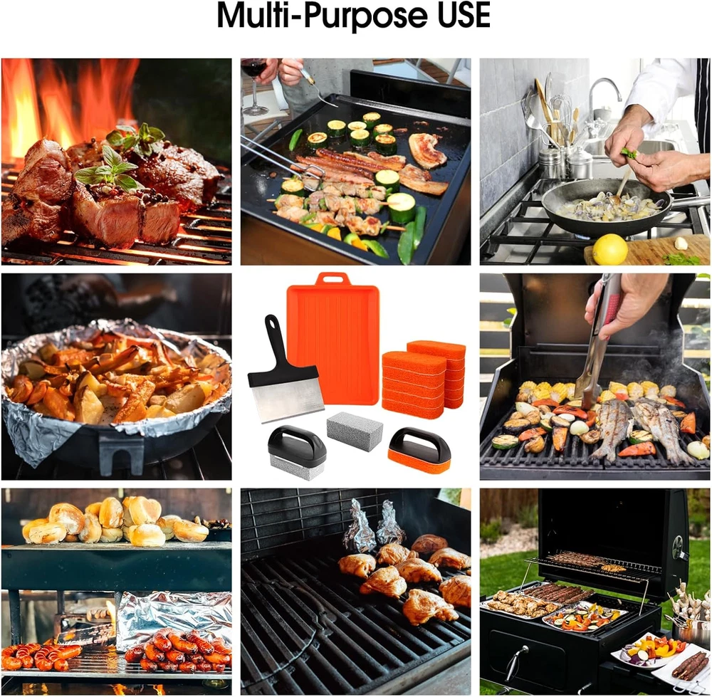 Store New Arrivals Add to Favorite View Feedback Upgraded Griddle Cleaning Kit for Blackstone 18 Pieces Flat Top Grill Accessories Cleaner Tool Set with Scraper, Heat-Resistant Silicone Spatula Mat with Hanger, Grill Brick, Scouring Pads Description Item model number GCK18 Manufacturer KTUOPEE Style 18Pcs Griddle Cleaning Kit Number of Pieces 18 Product Dimensions 7.95 x 4 x 10.94 inches Material Polyester, Pumice Stone, Silicone Country of Origin China Item dimensions L x W x H 7.95 x 4 x 10.94 inches Is Dishwasher Safe No Item Weight 2.66 pounds Handle Material Plastic Grill Surface Compatibility GRILLE Grill Compatibility GENERAL_GRIDDLE Brand KTUOPEE Included Components Griddle Scraper, Silicone Spatula Mat, Grill Brick, scouring pads Professional Cleaning Kit - By using our's griddle / grill cleaning kit can quick clean grease, stains, food residue on the griddle top. This grill / griddle cleaner tool make your griddle gleaming in a short time with less effort and without any scratches. This amazing flat top grill cleaner set includes 1 griddle scraper, 12 scouring pads with 1 handle, 2 grill bricks with 1 handle,1 silicone spatula mat, which makes our griddle accessories kit for you. Silicone Spatula Mat - A must have if you have a flat top griddle, Keeping your surfaces clean while griddling, whether your countertop or griddle side shelf, has never been easier with it. It's made of premium quality Silicone,this kitchen spatula rest is Non-toxic and heat resistant, which allows you place a piping hot spatula on it and won't melt or damage. It's also easy to clean, and features a built-in hanger, so you can hang the mat up for storage, or by your griddle for your convenience. Griddle Stone with Handle - Our's grill stone cleaning block are made of natural ecological Pumice Stone, this grill cleaning brick can be used to remove residue, stains and dirt on the grill, it's safer than traditional wire grill brush, no loose wire falling off, safe, fast and effective cleaning, also good on cast iron, pot, stainless steel flat Top griddles. Scouring Pads with Upgraded Handle - Whatever hot or cold surface,the scouring pads with handle holder can keep your hands away from the heat, designed to clean griddle tops, easy to install and remove. Scouring pads are made from 100% polyester, they are great for cleaning kitchen, oven, cast iron skillet, stove, cooktop, frying pan, pots and pans. Multipurpose Griddle Scraper - The grill scraper fits for quick and easy scraping the bits off the skillet, Barbecue turners helps with flipping the food. Heavy BBQ scraper can be used to chop food as well. you will find a wide variety of uses for it throughout the outdoor barbecue area. BBQ Lover - Looking for a great present idea for that special someone? This griddle cleaning kit is the addition to any backyard kitchen, we have provided beautiful packaging for it, which can be used for those who make delicious food for you. Product Description KTUOPEE 18 Pieces Griddle Cleaning Kit 18 Pieces Griddle Cleaning Kit helps you to deep clean your dirty griddle Surface top. The Silicone Spatula Mat can keep your side shelf clean, the Griddle Scraper to remove debris, cooked-on food; 12Pcs Scour Pads with Handle designed to clean griddle tops, wet or dry, the replaceable pads resist clogging and rinse clean; 2Pcs griddle stone with handle, which is designed to clean griddle or grill grates and help remove cooked-on grime., Can be used on hot or cold surfaces. With this grill cleaning kit,you no longer spend a lot of time on cleaning griddle, and you can enjoy a pleasant barbecue time with your family and friends, forget about cleaning troubles. A must have if you have a flat top griddle Heat-Resistant Silicone Spatula Mat with Hanger Made with 100% silicone. Protects countertops or griddle shelves from grimy spatulas, knives, and tongs. Heat resistance allows you place a piping hot spatula on it and won't melt or damage. Features a built-in hanger for storage or accessibility at the griddle. Easy to clean for your convenience. ABOUT US We offer the best prices around on high quality products. Our E-store includes media such as books, movies, music and games while offering electronics, toys, sporting apparel, clothing, tools, general home, garden items and more. SHIPPING We are always working hard to ensure your package arrives as soon as possible. Please understand that some factors like weather, high postal traffic, and the performance of shipping companies are outside of our control. We offer free shipping to the lower 48 states and ship within 2 business days of payment, usually sooner. We do not accept P.O. Boxes. Please provide a physical address. RETURNS We offer a 30-Day Return Policy on items which you are not completely satisfied with. You have the option for a full-refund or an exchange of the item. No returns are available on items shipped outside of the USA. PAYMENT We accept PayPal. CONTACT US This page content is yet to come Please ad us to your favorite seller and visit again later Thank You
