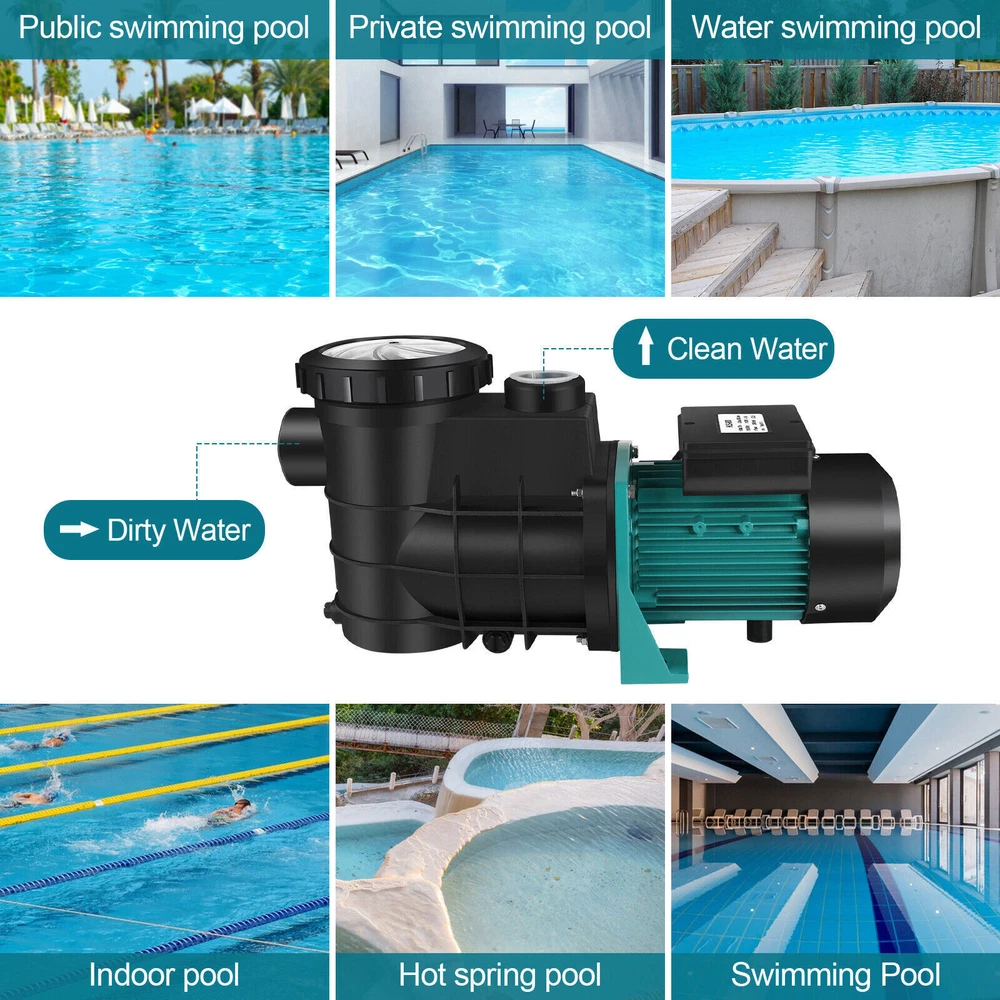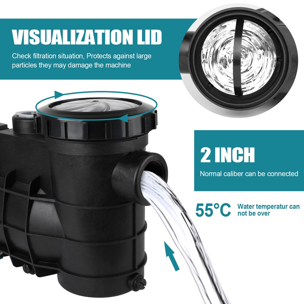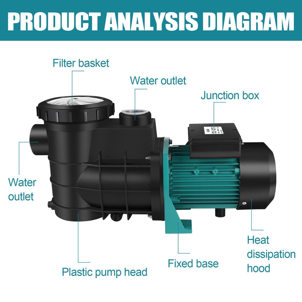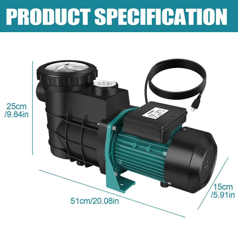 Upgraded 1.5HP Swimming Pool Pump Motor Hayward In/Above Ground Pool Pump FAST About us: High efficiency & Low Noise: This swimming pool pump is made with heavy-duty, corrosion-proof construction. The stainless steel motor shaft is constructed with a reinforced thermoplastic body for longer life and durability. Advanced engineering provides high efficiency and minimal noise. This wonderful swimming pool pump will surely keep your above ground and inground pools clean. POWERFUL PUMP: This pool pump is quiped With IP55 1100W electric motor,high efficiency Impeller maximize flow and reduce noise,offers dependable performance, energy efficiency and quiet operation.Copper wire motor provides not only a more efficient, stable and safe operation, but also has a longer service life compared to ordinary motors. The powerful flow can achieve 6500 GPH and the maximum head lift can reach 51 ft. Specification: Type:Swimming Pool Pump Material:ABS Color:Black Rated voltage: 110v Rated frequency: 50Hz Horse Power:2HP Flow rate: 18000L/H Lift: 51ft/15.54m Waterproof:IP55 IP Rating Suitable For:In Ground Pools&Above Ground Please connect only to a grounding type receptacle protected by a ground-fault circuit-interrupter (GFCI). To reduce the risk of electric shock, install at least 10 feet from the inside walls of a pool. Do not use an extension cord. This pump is for use with permanently installed pools only-Do not use with storable pools. About the item: 1.Warm Tips: When pumping water: The pump head is filled with water; the pump head transparent cover is tightened; the water pumpinlet and outlet joints are installed, and the raw material belts are tightened when the pipes are installed to prevent air leakage at the joints of the pipes. Before pumping:The pump head should be filled with water. Inlet and outlet joints wrapped around the raw material tape, beware of leaks. Tightening when installing the inlet and outlet, beware of leaks. The pump head transparent cover is tightened to prevent air leakage and water seepage 2,Pump motor trip Causes: 1,The water pump motor enters water or pump operating environment is excessively humid, and causing the motor to short-circuit and burn. 2,The pump prevents the inlet from entering the water and burns the motor 3,There is Water in The Pump Causes: Our company carries out a full inspection (pumping) of the water pump, and it might result in some package still leave some water in it, It is normal. 4,The Pump stop working suddenly Causes: Our company's products are equipped with temperature protection device, when the motor temperature is too high, the temperature protection device will start, It will stop pump working, if the motor is shut down in the normal operation process , generally there is foreign matter inhalation in the pump, resulting in the impeller stuck, motor temperature rise , pump stop working. Solution: Clean up the waste inside the filter Payment Delivery details Warranty & Return About us Contact us Payment 1. We accept payment via Paypay only. 2. All payments must be prepaid. Delivery details 1. Items are generally shipped out within 24-48 hours after your payment has been cleared (Sat. & Sun. excluded.) 2. Orders from the United States will all be shipped out via USPS and FedEx. The shipment usually takes 3-7 business days( Exclude public holiday), if you need the item urgently, please contact us for detail before purchase. 3. We ship to US ONLY and do not support Collection. 4. All items will be shipped to buyer's paypal address. Please check your paypal address before place the order. 5. We are not responsible for wrong or undeliverable address. We reserve the right to charge the shipping fee again for returned items due to wrong address. Warranty & Return 1. We provide 30 days money back on non-defective, undamaged, unused and resalable products. Product is not eligible for refund after the 30-day refund period has expired. 2. Our warranty does not extended to any products that are physically damaged or that are not under normal operating conditions as a result of misuse or improper installation on the buyer/user's part. 3. For all returned products, Please contact us for the returning address and Pls no return case. 4. In all cases, buyers pay shipping fees at their own cost to return products for exchange or refund. We will be responsible for the postage of replacements. Refund will be made upon receipt of the returned item. About us We are a store, mainly run laptop accessory. Such as battery , ac adapter etc. All item passed FCC / CE / ROHS certificates. Help buyer reduce the risk of damage, fire, dangerours mostly. We work with a good quality OEM supplier and factory. Help you and us save money greatly. Contact us Currently, our after-sale workmate good at English. it is better send eBay message in English. You will get our most effetive feedback in time. If you have any question, just send a eBay message is a best solve way between us. If you satifaction our service, leave 5 stars and postifive feedback at our store. It will help our small store development greatly. We will very appreciated for your doing.