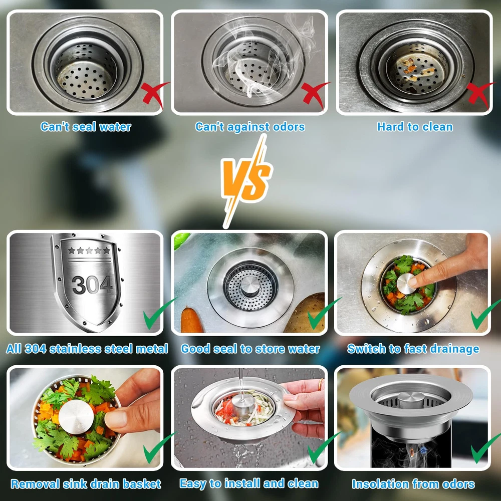 【3-in-1 Functionality】 Elevate your kitchen experience with our new innovative 3-in-1 All Metal 304 Stainless Steel kitchen sink drain strainer. With a pop-up device, this kitchen sink drain strainer combines 3 in 1 functions, as kichen sink stopper to store water, as kichen sink strainer to drain water and catch food waste, as sink plug to isolate ordors and insects to streamline your daily tasks with unmatched efficiency and durability. Bid farewell to clogged drains as the efficient food catcher ensures smooth drainage for a hassle-free experience. 【Upgraded All metal Structure】Crafted with premium 304 stainless steel, our kitchen sink stopper is long-lasting and rust-proof with stainless steel body, food catcher basket and built-in brass bounce core device. The new generation sink strainer basket is upgraded to SUS304 material, ensuring long-lasting performance and saving you money on replacements and reducing plastic waste. 【Stylish Pop-Up Design】Featuring an upgraded one-piece spring-loaded design, our pop-up kitchen sink drain stopper allows for effortless switching between sink drain strainer and sink stopper with just one press, adding a touch of modern style to your kitchen sink. And the upgraded brass bounce core device offers exceptional resistance to corrosion, scratches, and high temperatures. 【Universal US Standard Sink Size】This sink stopper kitchen drain is universal use for US 3-1/2 inch kitchen drain holes, suitable for the width 2.95"-3.42", depth>>1.46" of the sink drain opening. Before purchasing, be sure to measure the inside diameter and depth of your sink drain for a perfect fit. 【Easy to Install and Clean】The sink strainer kitchen drain is easy to install without any tools. The upgraded removal stainless steel kitchen sink strainer basket that filters kitchen food leftovers without clogging is easy to clean, and saving you time and effort, ensuring a fresh and clean kitchen environment.