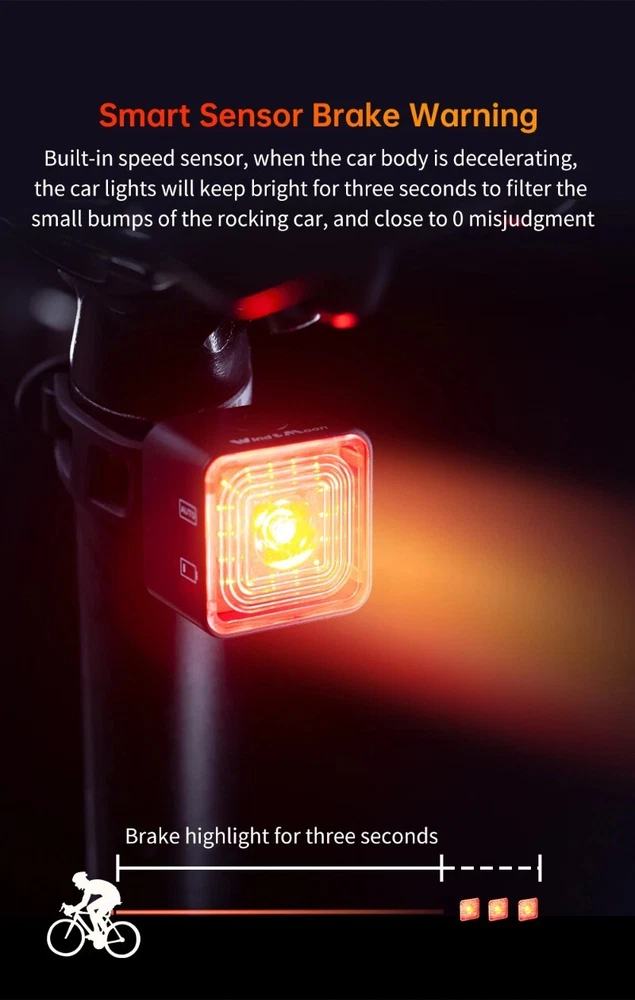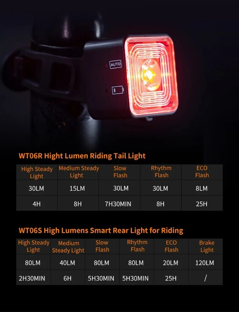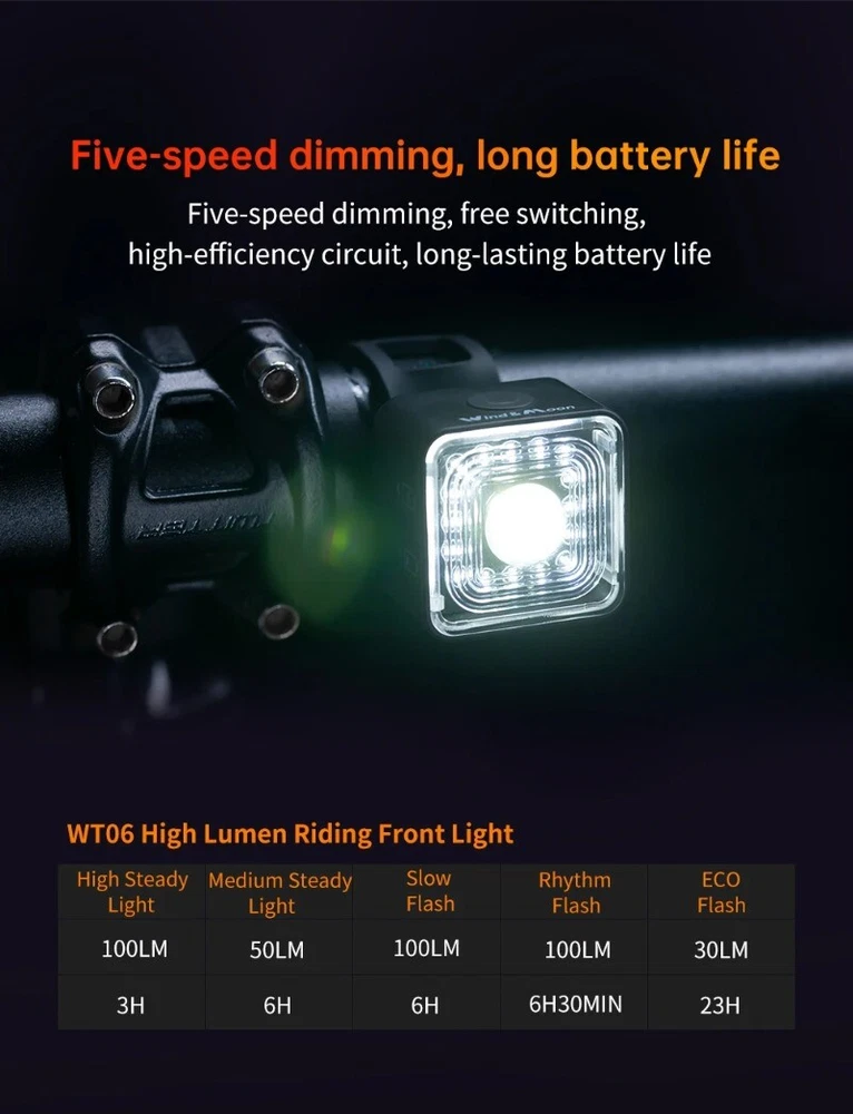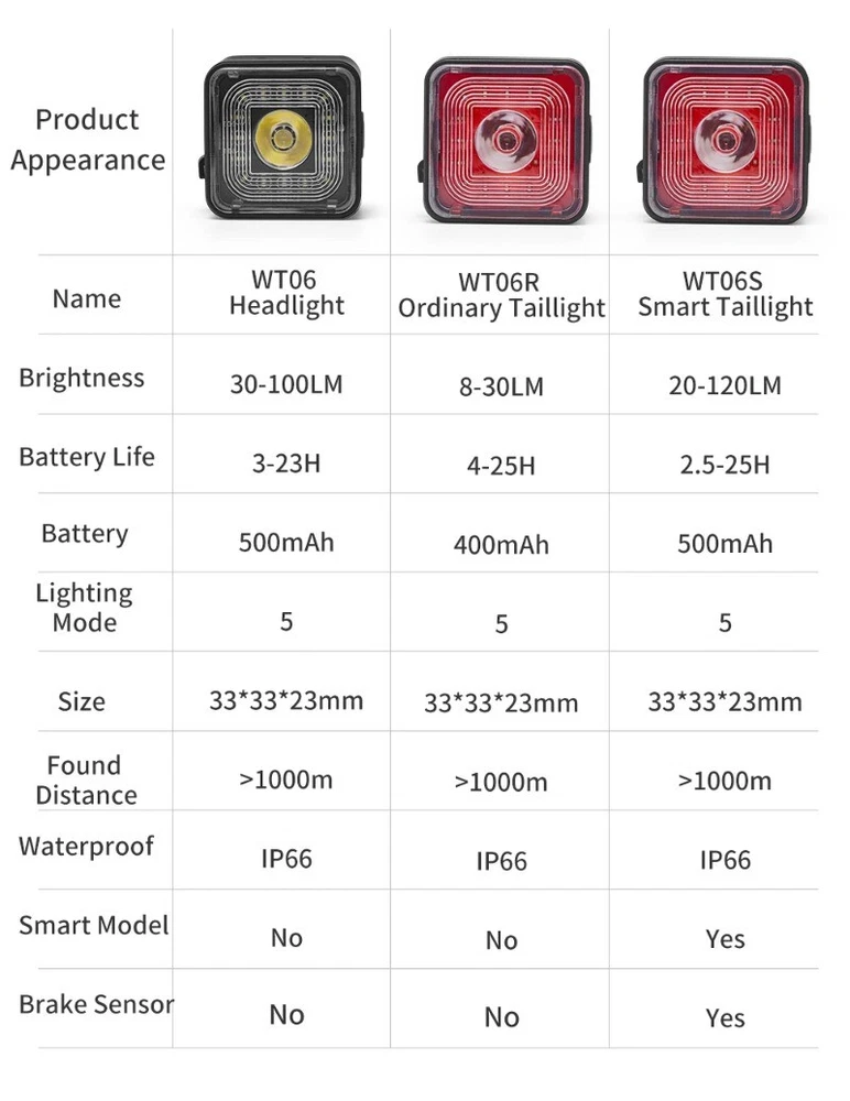 Wind&Moon Headlight Taillight Bike Modified Part Bicycle Accessories Lighting Kit Brake Sensing Lights Cycling Fitting Description: ABS Material: The cycling lamps kit comes with the adoption of high class shell material, not easy to deform or break. USB Charging: The lamps come with USB charging function, making it convenient and safe. Waterproof Protection: The lamps feature the reliable waterproof protection, making it functional on rainy days. Braking Sensing: The taillight is designed with braking sensing function, making the cycling safer. Compact Size: The lamps are designed in a compact size, which will not take up too much space. Specification: Color: As shown. Material: ABS. Size: Approx. 11.2x3.5x1.8cm/4.4x1.4x0.7in. Lumen: 30-100lm (Front lamp), 20-120lm (taillight). Battery Capacity: WT06 500mAh. WT06R 400mAh, WT06S 500mAh (WT06S is Smart taillights) Waterproof Level: IP66. Package Includes: 1 Piece Lamp.or 2Piece Lamp choosable (with USB Cables).