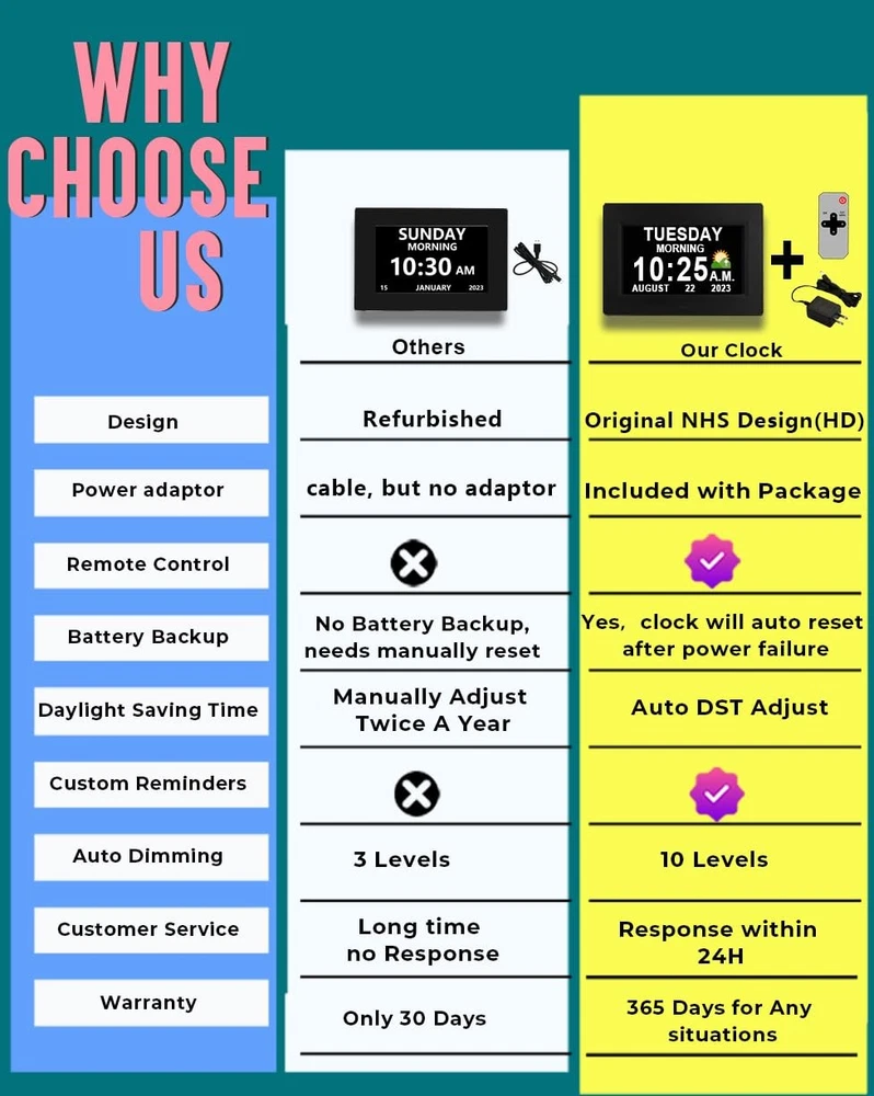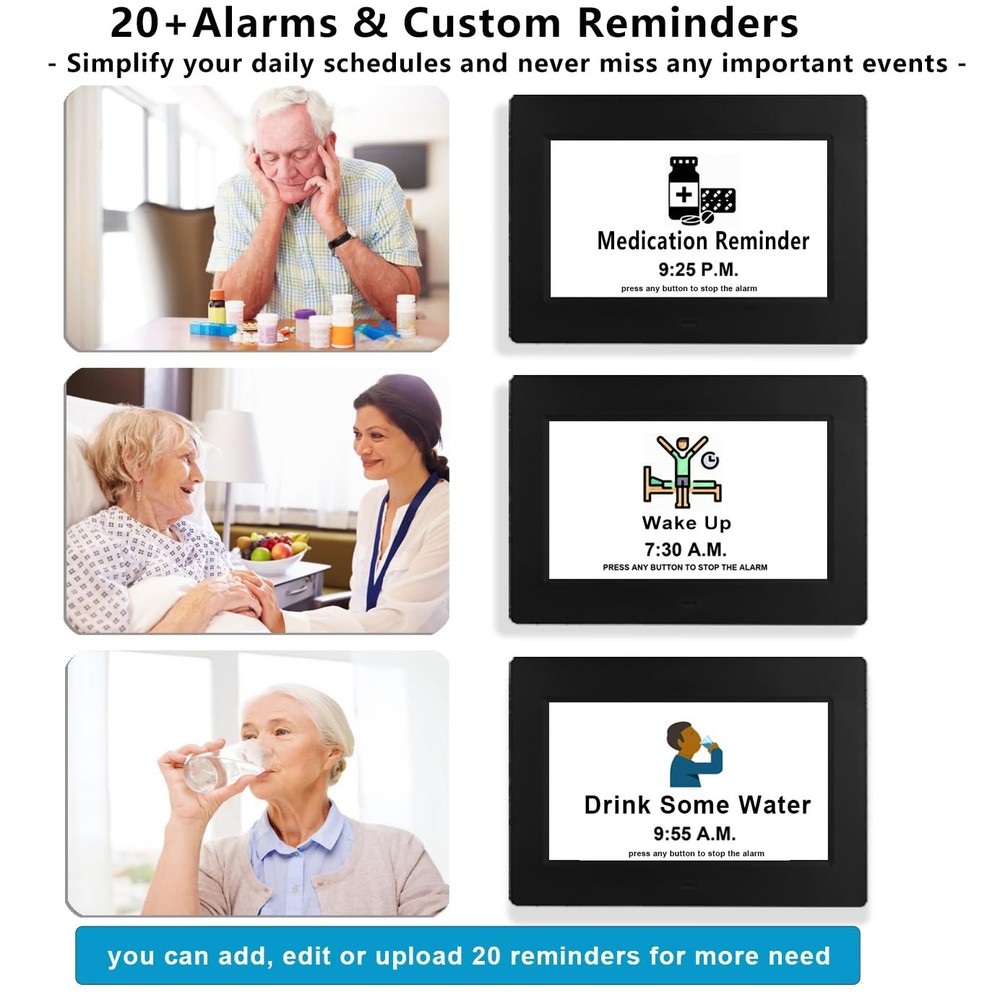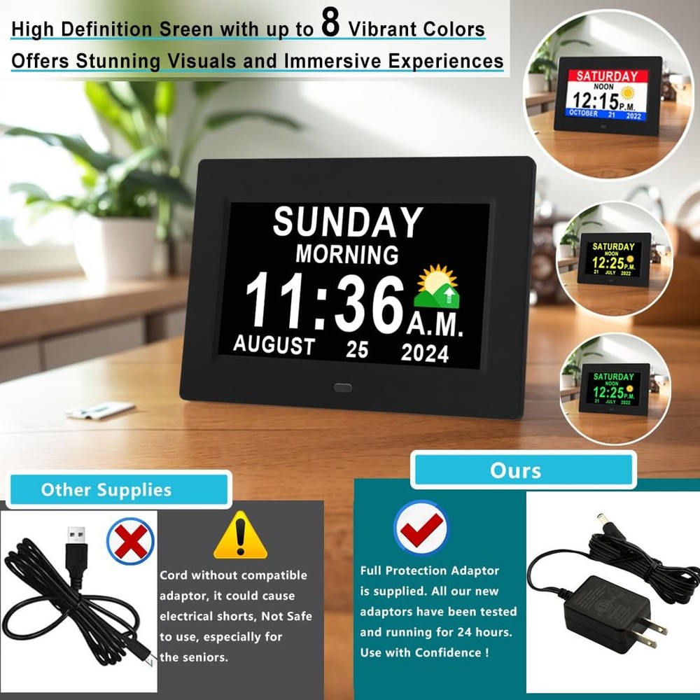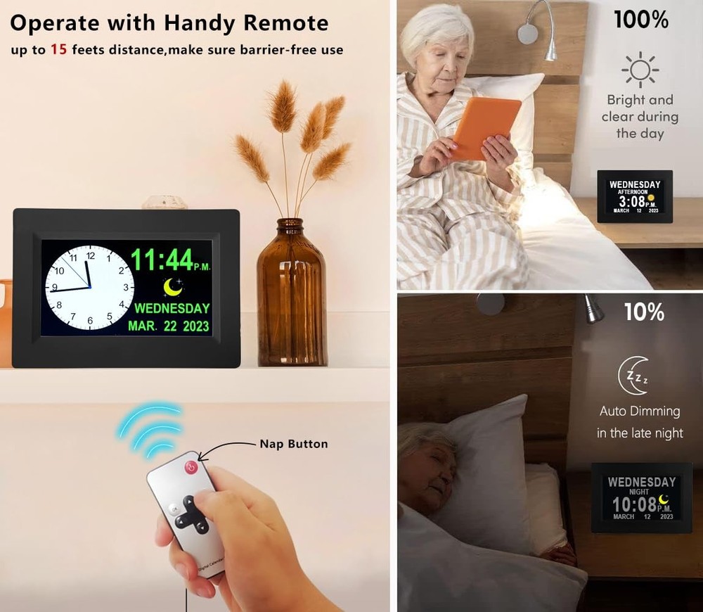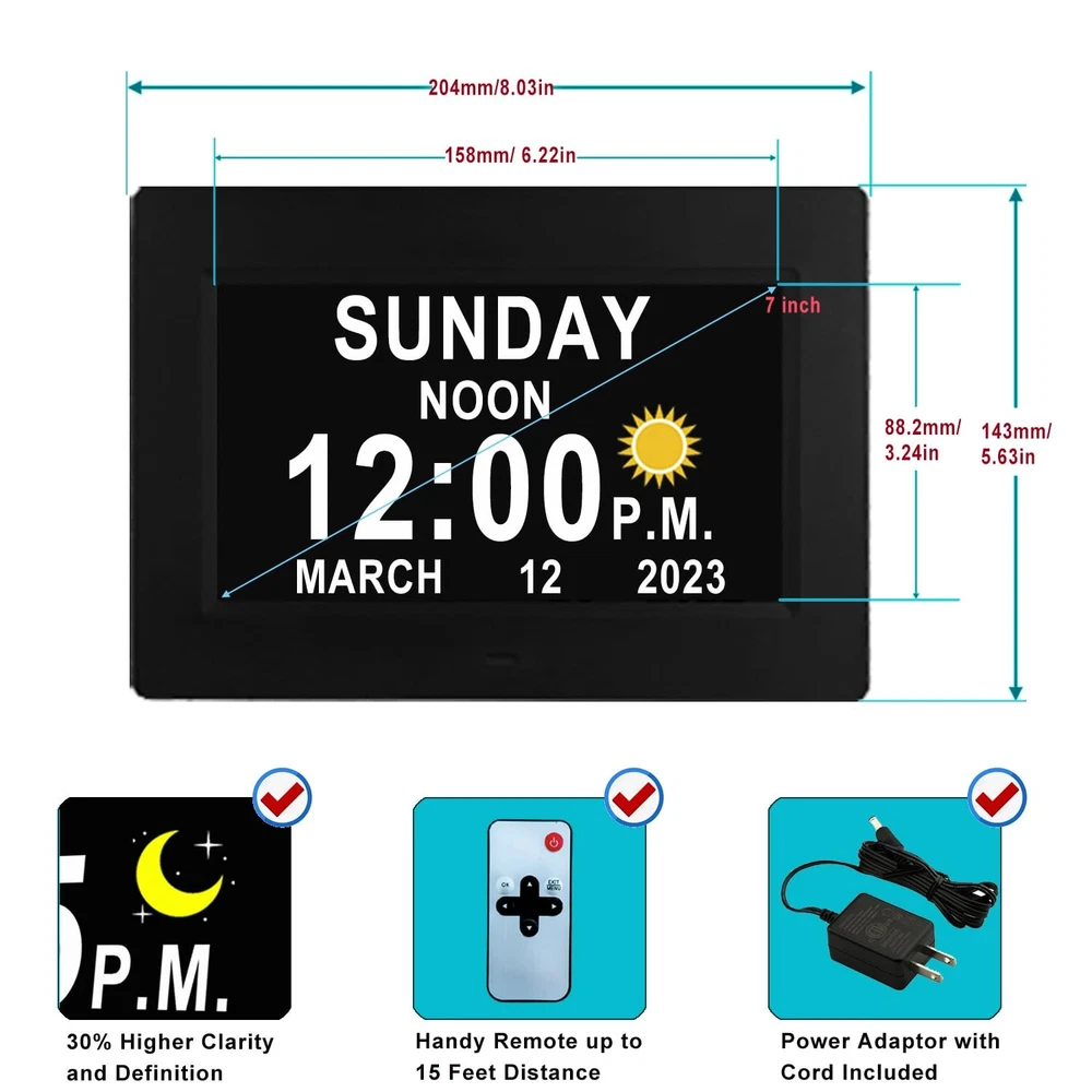 Why do I say this is the best Gifts among the clocks for the elderly parents or school kids? For the seniors, as they grow older, their memory and vision gradually deteriorate, and the blurring of the concept of time will cause them to forget many important days, which will gradually make them anxious. And our clocks are equipped with High-Definition screen (720P) and multi-color letters, which can fully and clearly display the time, year, month and day. It also has 16 daily alarm clocks to alleviate concerns about missing appointments, favorite shows, mealtimes or any other critical event. Helps to relieve their anxiety. Unique Functions and Improved Features : ✔Conviently adjust alarm clock with Remote Control ✔720p HD 178° wide-viewing screen, see it from all sides ✔4 stylish Users Interfaces ✔Standard time and Military time switch (12 hour/24 hour mode) ✔Shows time of day (Morning, Afternoon, Evening, Night, Midnight, Before Dawn) ✔16 Built-in Reminders ✔Adjust reminders separately for each scheduled event. ✔Alarms automatically shut off after 15s/30s/45s/1m/3m/5m (adjustable) ✔DIY Alarms ✔ White, Red, Yellow, Green Text display ✔Customizable dimming levels ✔5 Languages Including English, French, German, Italian, Spanish. ✔Choice of 4 Alarm Modes: Once, Every day, Weekdays only or Weekends only, Off. ✔Instant Startup and Simplified Setup In the Giftbox You Will Find: Day Clock x1 kickstand x1 Remote Control x1 UL certified adapter x1 Day Clock Manual and Guide x1