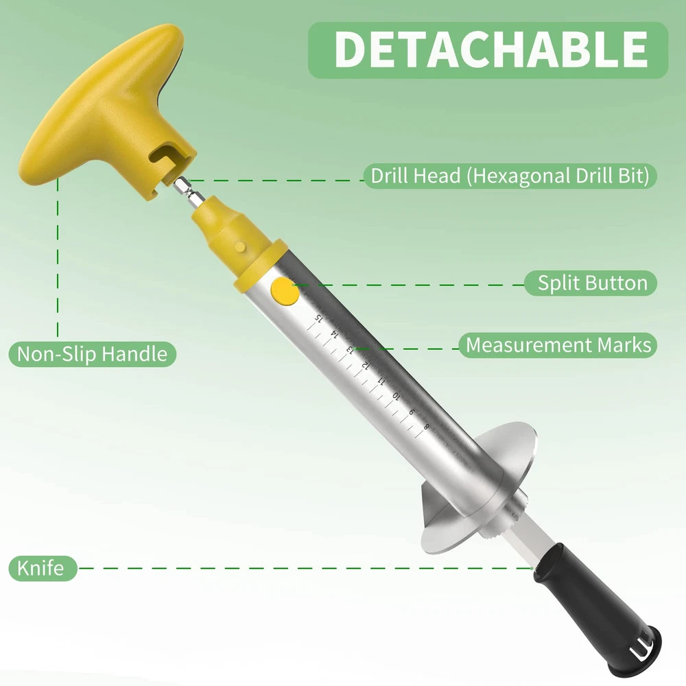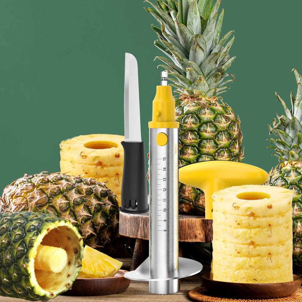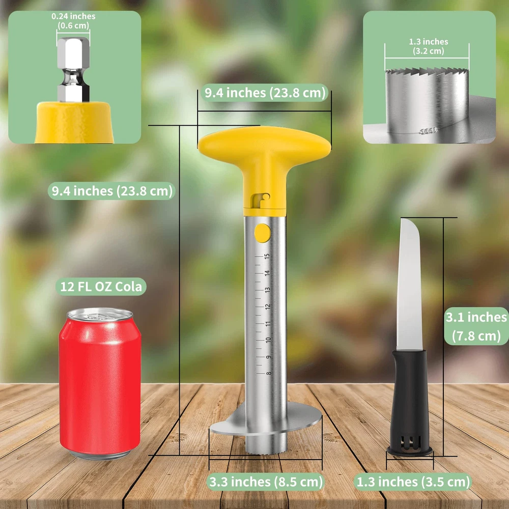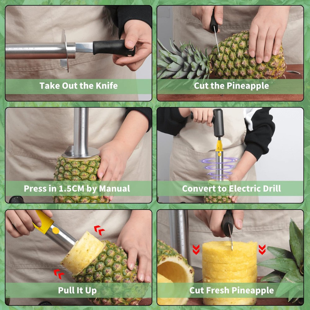 【With Hidden Knife Design】You can use the knife to cut the top part of the pineapple, and also can cut the fresh pineapple after peeling. Easy to carry anywhere, suitable for picnics, camping, outdoor activities, etc. 【Upgrade, Can Be Electric & Manual】Pineapple peeler can be used manually. Most important, pineapple cutter works well use with electric drill (not included), the head of drill size is 6.7 mm, suitable for most electric drills (Hexagonal Drill Bit). Quickly to deal with many fresh pineapple in party or restaurant. 【Peeling a Pineapple within a Few Minutes】Pineapple cutter is super easy to use, just gently twist can makes perfect pineapple rings, 10 times faster than using a knife, it will make you and your family want to eat more fresh pineapple. 【Measure Marks】Convenient to estimate the depth of core removal, prevent the bottom of pineapple from piercing, and keep the whole pineapple shell. The whole pineapple shell can be used to make pineapple rice or drink or sorbet. 【Sturdy and Durable】The pineapple corer is upgraded, with Reinforced Welder, Thicker Blade, Heavier Weight, don't worry about the pineapple corer easy to break, it will last long. 【Ergonomically Comfortable Handle】Allows effortless twisting or pushing cores through the pineapple, etc. Pineapple Corer and Slicer Tool assembly and disassembly are easy to operate. 【Ideal Gift Choice】Great gift for family and friends at Christmas, Thanksgiving, Birthdays, Father's Day, Mother's Day and more.