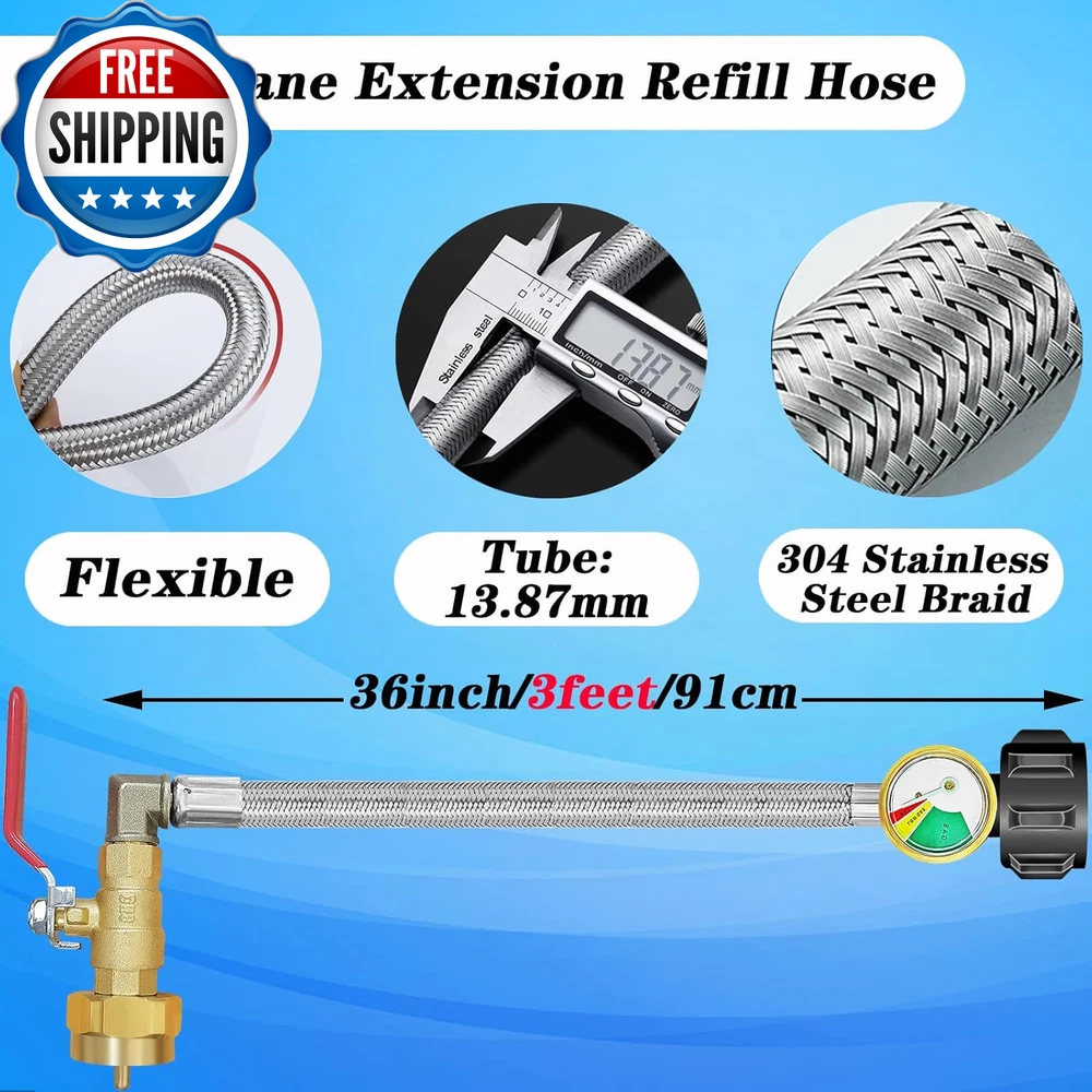 Upgraded Propane Refill Adapter Hose with Gauge and On/Off Valve, 36" Propane Extension Refill Hose Kit, 1LB Propane Filling Hose Set with 1 LB Propane Bottle Cap, Roll Sealing Tape (Stainless Steel) 【Upgraded Propane Refill Adapter Hose】The 36" 1LB propane refill hose upgrade to coloful dial gauge (match with tank gauge level indicator) , which allows you to read and monitor the gas level without necessarily removing the tank, and can detect the leaks. Besides, the 36" propane refill hose upgrade to stainless braided hose with Shut-Off ball Valve. 【How to Use】Step 1: Connect the QCC1 adapter to your big propane tank. Step 2: Open gas for few seconds or it may not work. Step 3: Connect the side of the tank adapter connection with shut-off control valve to your small propane bottle. Step 4: Refill your 1lb bottles with propane from the big propane tank. If you do not want to refill,close the refill valve. So, you can refill the 1lb propane bottle from 20-50Lb propane tank directly without having to move or carry the large tanks easily. 【Product's Standards】The QCC1 Type inlet propane refill adapter hose meets the US CSA certification to ensure safety and durability. And the length of the Upgraded propane refill hose is:3 feet / 36 Inch / 91 cm. Rate pressure of the propane extension refill hose: 350PSI rated high pressure. 【Upgraded Material】The propane extension refill hose is made of stainless braided and the QCC1 male connect, propane tank gauge , gauge, and 1lb bottle tank adapter connection with shut-off control valve is made of premium brass to ensure secure and durable for long-lasting to use. And Anti-aging, anti-corrosion, heat-resistance, air tightness, flexibility features,ensures air tightness and stability. 【Wide Compatibility】The updated propane refill adapter hose can be compatible with camp stoves, heater, portable grill, home applications and so on. Ideal tool set for camping, tailgating, heating needs or having an outdoor cookout. 【Propane Refill Adapter Hose Kit】The propane extension refill hose set comes with 1pcs upgraded 36" stainless braided propane extension hose with coloful dial gauge and on-off control valve, 1pcs 1lb propane bottle cap, 1 roll sealing tape, 1pcs flannelette bag. Upgraded Propane Refill Adapter Hose, 36" Stainless Braided Propane Extension Refill Hose with Gauge, Shut off Valve, 1LB Propane Filling Hose Kit with 1 LB Propane Bottle Cap, Roll Sealing Tape Batteries Required? No Power Source NO Maximum Pressure 350 Pound per Square Inch Color Black Product Dimensions 7.4 x 4 x 0.74 inches Material Stainless Steel Country of Origin China Item Weight 1.32 pounds Shape Round Batteries Included? No Item Length 3 Feet Shipping Fast shipping is very important for us. Our standard US shipping service is FREE. Your order will be shipped within 2-3 business days upon full payment received. Your order will be delivered within 2-3 business days after the handling time. We only ship to the confirmed PayPal address. We reserve the right to cancel any order for any reason at any time. We are not responsible for undeliverable addresses. Returns and payment We offer a 30 days return policy from checkout winning date. We allow only PayPal as payment method FeedBack Your feedback very important to us, after you get your package and you are satisfied with our service please leave us positive feedback If you have any problem with your order / any questions please before leave any type of feedback Please visit our eBay store to check out other items for sale! Thank you for shopping at our store.