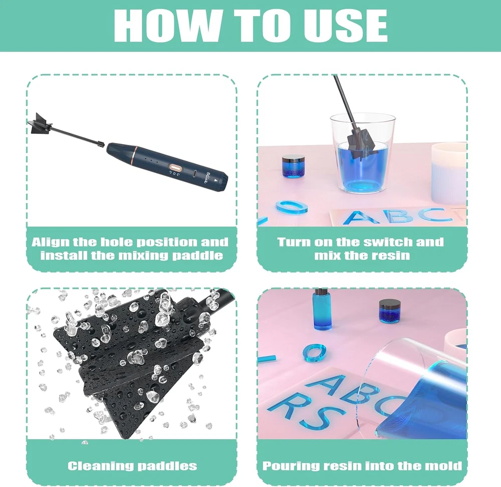 【Epoxy Resin Mixer】Save Your Wrist and Save Your Time, The speed is controlled at 50-300 RPM. Even if the speed reaches the maximum, it will not produce a lot of bubbles 【Upgrade motor and two-way mixing】 The use of a larger torque motor to avoid stirring the more viscous resin caused by the stoppage of work, torque of up to 200, and the use of a larger torque motor. is equipped with forward and reverse modes to meet your mixing needs 【Rechargeable Stirrer】BGick resin mixer tool is rechargeable, 1500mah large-capacity battery, equipped with USB data cable, The red light above is always on when charging, the bottom turns blue after 4-6 hours of charging 【Easy to Clean】with 4 reusable, high quality epoxy mixing paddles and are easy to clean. You can wipe with baby wipes and then wash the paddle with warm water. Or you can peel the epoxy off the paddle after the epoxy has dried 【What You Will Get】1x Rechargeable Electric Resin Mixer, 4 epoxy resin stirring paddles (2*small 2*large), 1x USB Type-C Charging Cable, 1x Instruction Manual Product Description Epoxy Resin Mixer It provides a more convenient, comfortable operating experience when using it, and is great for mixing resins, saving your wrists and reducing more air bubbles. FULL UPGRADE It adopts new high power motor, two-way mixing, stepless speed change, 1500mah battery. The video showcases the product in use. The video guides you through product setup. The video compares multiple products. The video shows the product being unpacked. Multi-scenario application It can not only mix epoxy resins, acrylic resins, pigments, paints, etc., but can also be used as a mixing agent.