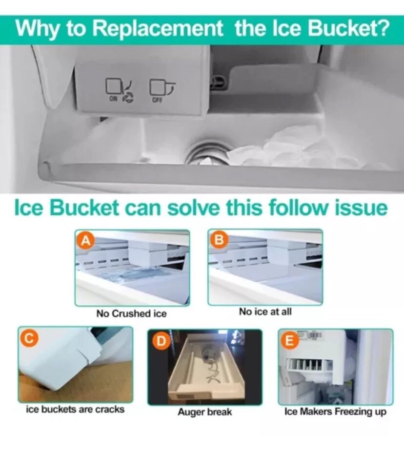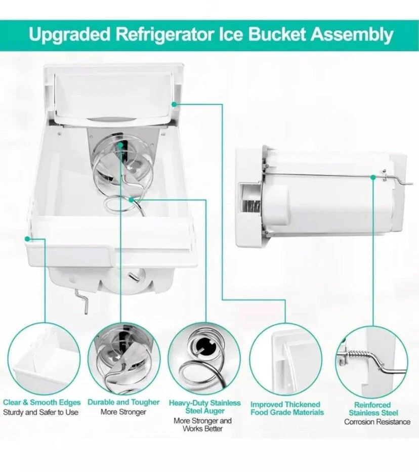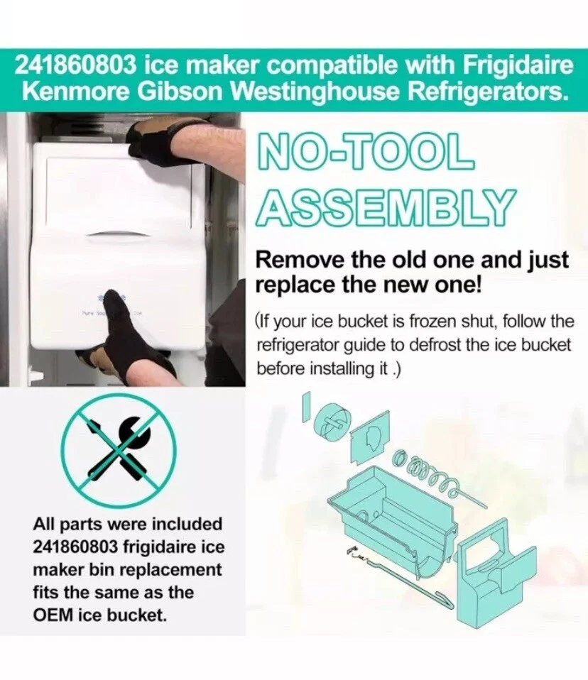 Product Dimensions 19.87"D x 10"W x 12.12"H Capacity 2.4 Gallons Manufacturer Luckman Compatible Refrigerator Models Frigidaire FGUS2647LF0, Frigidaire FGHS2655KE0, Frigidaire FGUS2635LE0, Frigidaire FGUS2637LP0, Frigidaire FGUS2666LE0, Frigidaire FGHS2355KP1, Frigidaire LGHS2655KE0Frigidaire FGUS2647LF0, Frigidaire FGHS2655KE0, Frigidaire FGUS2635LE0, Frigidaire FGUS2637LP0, Fr… See more Material UPGRADED Food Grade Material 【241860812 Ice Maker for Frigidaire Refrigerator】 Upgraded frigidaire ice bucket assembly 241860812 ice container fixes symptoms: A: Ice maker not making ice; B: Ice maker dispenses too little ice C: No ice at all; D: ice buckets are cracks; E: Auger break; F: Ice Makers Freezing up .Note: If the part does not crush ice, the spring under the ice bucket may be too stiff for your model. Please replace the spring from the old ice bucket and it will fix the issue. Size: 19.87"L X 10"W X 12.12"H. 【UPGRADED Food Grade Material-More Strengthen】Upgraded 241860812 Ice Bucket Refrigerator for Frigidaire ice make parts made of environmentally friendly premium thickened food grade materials which is durability, strengthen, pollution-free, safe and exact fit. Our ice maker for frigidaire refrigerator meet OEM standard,high quality Replacement for frigidaire ice maker assembly have good stronger and tougher, let your ice bin bucket works better,each of them has been strictly tested. 【Ice Container And Auger Assembly Easy to Install】241860812 frigidaire ice bin replacement is easy to remove and replace,search for "241860812" on the YouTube to get the installation video and it shows you exactly how to installation. frigidaire ice container and auger assembly. It is located in the ice maker's freezer,The auger arm is made of heavy-duty Stainless steel that rotates