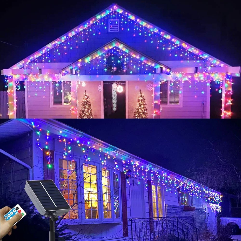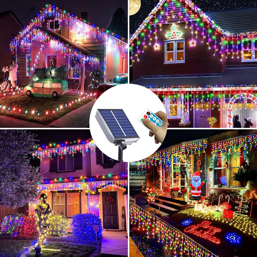 Solar Christmas Lights 【Upgraded Solar Panel】Our upgraded solar panel added power indicate light,this light can display the percentage of power, each cell represents 25% of the power.A USB charging port (5v input) added in the solar panel,you can charge it when cloudy or rainy day.New designed solar panel comes with a clip which allows the solar panel to be clamped to the fence and branches.It's ideal decoration lights for Christmas,Halloween,Thanksgiving,party,garden,patio decor. 【High Quality Christmas Lights】Our 304 Led Iciclelights' leading wire is 16.4ft long, light length is 23ft long with 57 drops.The spacing between drops is 4.7 inch/ 12cm, drop lengths 16 inch- 20 inch- 28 inch, number of light bulbs is 4, 5, and 7 respectively. Classic and beautiful, iciclelights are a popular choice for Christmas and holiday lighting. Roof awnings, overhangs, peaks and windows are popular locations for hanging iciclelights. 【8 Modes & Remote Functions】Not only a functional controller on the solar panel, we also provide a remote controller, which can provide 8 lighting modes,set a 6-hour timer and adjust the brightness using your remote.When you set one of the modes, you don't need to operate any more. When it gets dark, the solar Christmas lights string will automatically work and close according to the previously setting. 【Easy to Use & Energy Saving】best benefit is that it’s all solar powered no electricity and cost bills.without worrying how to plug in lights. Easy to put on, good length to cover the patio, tree branches, Roof, house, porch, yard, balcony, window, Holiday,Christmas Party Decorations. The drops of solar christmas lights lay naturally, they create a professional quality display either hanging on angles or across straight lines. 【IP65 Waterproof & Worry-free Warranty】solar powered is absolutely safe for Children. This Christmas lights are suitable for outdoor & indoor to withstand light rain or water spills.No need to worry of moisture or weather damage or short circuit by heat. If you have any question about product and service, please feel free to contact us, we will do our best to help you in 24 hours.