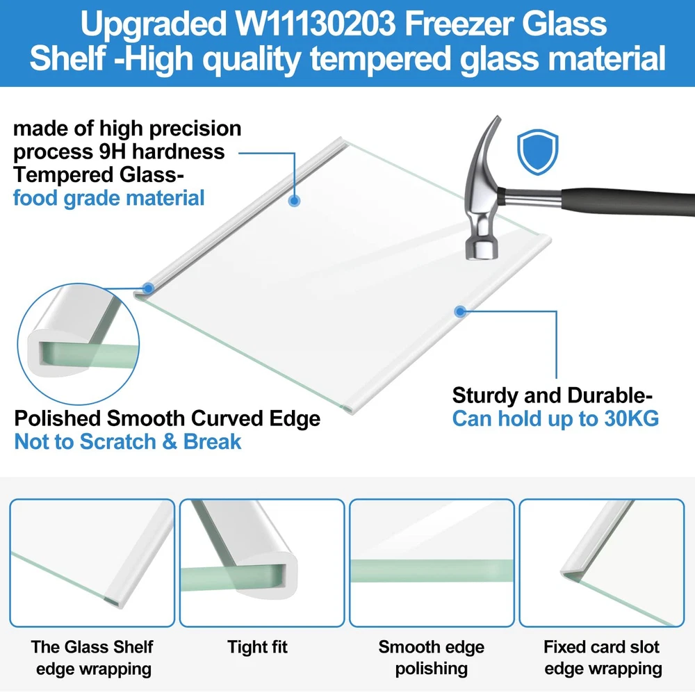 ✅【IMPORTANT NOTE】:Please make sure what is you need before purchase.The size of ARLBA W11130203 Freezer Glass Shelf is 11.7 inches(Length) X 10 inches (Width).Please NOTE that ARLBA W11130203 freezer glass shelf is installed on the freezing side of the Whirlpool refrigerator,located in the second position of the glass Shelf position on the top of the freezer.It is not suitable for the side of the refrigerator.Not suitable for part number W11130202. Please read our homepage and photos in detail ✅【Upgraded material】:ARLBA high-quality W11130203 freezer frame is made of high precision process 9H hardness Tempered Glass,3mm thickness reinforcement glass is reliable for wear resistance of fridge glass shelf,which is durability, strengthen,pollution-free,anti-scratches and scrapes.fridge glass shelf replacement have good bearing performance,can hold up to 30KG,stronger and tougher than ordinary materials.glass Shelf frame on both sides is made of food grade material,it is durable and safe. ✅【W11130203 Glass Shelf Replace Part Numbers】:This W11130203 freezer Glass Shelf replacement replace parts number:W10527849, W10773887, WPW10527849, AP6262440, PS12347522, EAP12347522, 4545866. .Not fit part number W11130202.This W11130203 freezer glass shelf fits on the freezer side of the Whirlpool refrigerator, the 2nd from the Freezer Top Glass Shelf position. It does NOT fit the refrigerator-side. Please check the Glass Shelf size and part number before ordering. ✅【Replace Brands and Models】:ARLBA W11130203 freezer Glass Shelf replacement for whirlpool KitchenAid and Ikea refrigerator freezer shelf parts.Fit models: WRS571CIDM00 WRS571CIDM01 WRS571CIDM02 WRS321CDBM00 WRS571CIDB00 WRS571CIDB01 WRS571CIDB02 WRS571CIDW00 WRS571CIDW01 WRS571CIHB00 WRS571CIHB01 WRS571CIHB02 WRS571CIHB04 WRS571CIHZ00 WRS571CIHZ04 WRS571CIHZ01 WRS571CIHZ02 WRS586FIEM04 WRS571CIHV00 WRS571CIHV01 WRS571CIHV02 WRS571CIHV04 WRS571CIHW00 WRS571CIHW02 WRS571CIHW01 WRS571CIHW04. ✅【Packaging Includes & Warranty】:1 X W11130203 freezer shelf glass for whirlpool refrigerator parts and 1 x fridge mats.( For whatever reason, if you are not satisfied, Please let us know, We will show you our sincere attitude and satisfactory solutions)