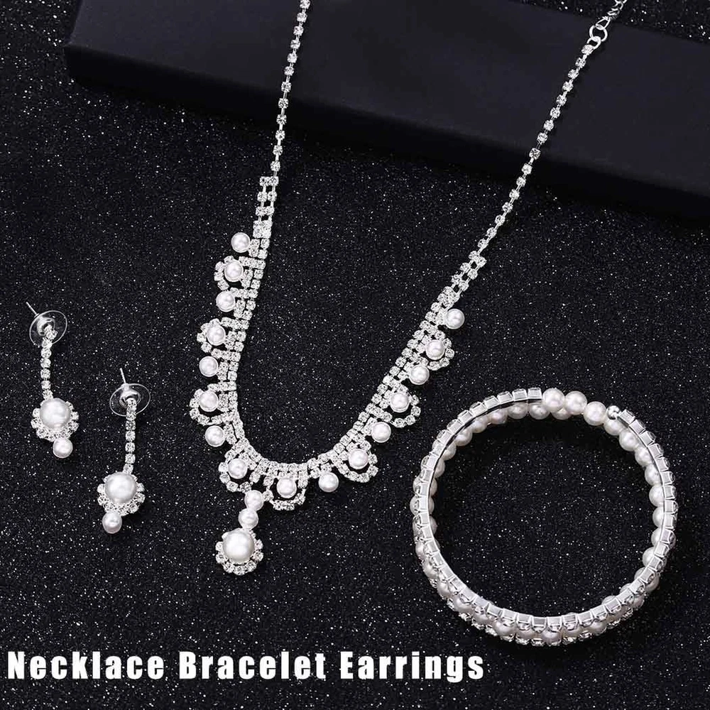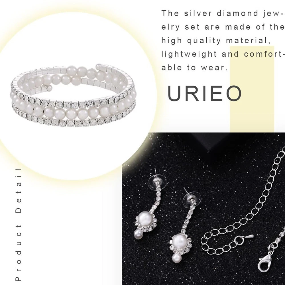 Urieo 3 PCS Pearl Bridal Jewelry Set Silver Rhinestone Necklace Drop Earrings Bangle Bracelet Elegant Costume Wedding Jewelry Accessories Prom Party for Women Bridal Product Details Package Dimensions : 0.1 x 0.1 x 0.1 inches; 0.35 ounces Department : womens Date First Available : February 23, 2024 Manufacturer : Urieo Country of Origin : China Brand, Seller, or Collection Name: Urieo Metal: alloy Material: Metal Gem Type: No Gemstone Clasp: Lobster Clasp Number of stones: 2