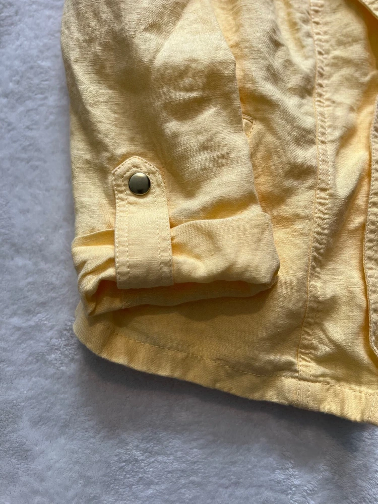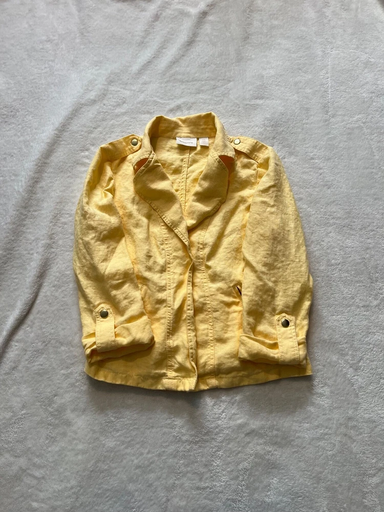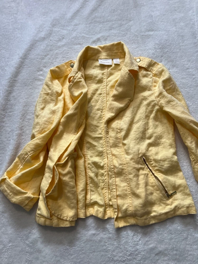 *This is not a new item and does not ship with its original tags. Good condition Size 0 Pockets with zipper closure Long Sleeve Gold accent buttons