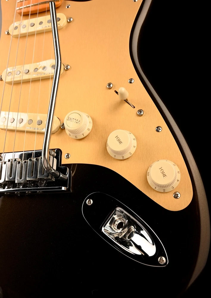 Why go standard when you can go ultra! Here's this Fender American Ultra Stratocaster in the illustrious Texas Tea finish. This one is super clean and super cool. For anyone looking for a deal on an Ultra Strat, especially in this particular finish, this is a great score. This guitar features a unique “Modern D” neck profile with Ultra rolled fingerboard edges for hours of playing comfort, and the tapered neck heel allows easy access to the highest register. A speedy 10”-14” compound-radius fingerboard with 22 medium-jumbo frets means effortless and accurate soloing, while the Ultra Noiseless Vintage pickups and advanced wiring options provide endless tonal possibilities – without hum. The sculpted rear body contours are as beautiful as they are functional and the S-1 switch adds the neck pickup in to any switch position. This versatile, state-of-the-art instrument will inspire you to push your playing to new heights. This guitar is in excellent condition - it's actually never been previously owned and that makes this one a great deal. It's been setup to play perfectly by the techs in our shop and is ready to go. And it comes with its original hardshell case. Alder body with sculpted rear contours Three Ultra Noiseless Vintage Strat single-coil pickups "Modern D"-shaped neck with Ultra satin finish 10"-14" compound-radius fingerboard; 22 medium-jumbo frets Includes premium molded hardshell case Serial # US19099749 Product Specs Model Name: American Ultra Stratocaster®, Maple Fingerboard, Texas Tea Model Number: 0118012790 Series: American Ultra Country of Origin: US Color: Texas Tea Body: Alder Body Finish: Gloss Polyurethane Body Shape: Stratocaster® Neck Material: Maple Neck Shape: Modern "D" Neck Finish: Satin Urethane with Gloss Urethane Headstock Face Neck Shape: Modern "D" Scale Length: 25.5" (648 mm) Fingerboard: Maple Fingerboard Radius: 10" to 14" Compound Radius (254 mm to 355.6 mm) Number of Frets: 22 Fret Size: Medium Jumbo String Nut: Bone Nut Width: 1.685" (42.8 mm) Position Inlays: Black Pearloid Dots Truss Rod: Bi-Flex™ Bridge Pickup: Ultra Noiseless™ Vintage Strat® Middle Pickup: Ultra Noiseless™ Vintage Strat® Neck Pickup: Ultra Noiseless™ Vintage Strat® Controls: Master Volume (with S-1™ Switch), Tone 1. (Neck/Middle Pickups), Tone 2. (Bridge Pickup) Pickup Switching: 5-Position Blade: Position 1. Bridge Pickup Position 2. Bridge and Middle Pickup Position 3. Middle Pickup Position 4. Middle and Neck Pickup Position 5. Neck Pickup Pickup Configuration: SSS Bridge: 2-Point Deluxe Synchronized Tremolo with Pop-In Arm Hardware Finish: Nickel/Chrome Tuning Machines: Deluxe Cast/Sealed Locking Pickguard: 1-Ply Gold Anodized Aluminum Control Knobs: Aged White Soft Touch Knobs Case/Bag: Elite Molded Case Used Fender American Ultra Stratocaster Texas Tea with OHSC - 2 Why go standard when you can go ultra! Here's this Fender American Ultra Stratocaster in the illustrious Texas Tea finish. This one is super clean and super cool. For anyone looking for a deal on an Ultra Strat, especially in this particular finish, this is a great score. This guitar features a unique “Modern D” neck profile with Ultra rolled fingerboard edges for hours of playing comfort, and the tapered neck heel allows easy access to the highest register. A speedy 10”-14” compound-radius fingerboard with 22 medium-jumbo frets means effortless and accurate soloing, while the Ultra Noiseless Vintage pickups and advanced wiring options provide endless tonal possibilities – without hum. The sculpted rear body contours are as beautiful as they are functional and the S-1 switch adds the neck pickup in to any switch position. This versatile, state-of-the-art instrument will inspire you to push your playing to new heights. This guitar is in excellent condition - it's actually never been previously owned and that makes this one a great deal. It's been setup to play perfectly by the techs in our shop and is ready to go. And it comes with its original hardshell case. Alder body with sculpted rear contours Three Ultra Noiseless Vintage Strat single-coil pickups "Modern D"-shaped neck with Ultra satin finish 10"-14" compound-radius fingerboard; 22 medium-jumbo frets Includes premium molded hardshell case Serial # US19099749 Product Specs Model Name: American Ultra Stratocaster®, Maple Fingerboard, Texas Tea Model Number: 0118012790 Series: American Ultra Country of Origin: US Color: Texas Tea Body: Alder Body Finish: Gloss Polyurethane Body Shape: Stratocaster® Neck Material: Maple Neck Shape: Modern "D" Neck Finish: Satin Urethane with Gloss Urethane Headstock Face Neck Shape: Modern "D" Scale Length: 25.5" (648 mm) Fingerboard: Maple Fingerboard Radius: 10" to 14" Compound Radius (254 mm to 355.6 mm) Number of Frets: 22 Fret Size: Medium Jumbo String Nut: Bone Nut Width: 1.685" (42.8 mm) Position Inlays: Black Pearloid Dots Truss Rod: Bi-Flex™ Bridge Pickup: Ultra Noiseless™ Vintage Strat® Middle Pickup: Ultra Noiseless™ Vintage Strat® Neck Pickup: Ultra Noiseless™ Vintage Strat® Controls: Master Volume (with S-1™ Switch), Tone 1. (Neck/Middle Pickups), Tone 2. (Bridge Pickup) Pickup Switching: 5-Position Blade: Position 1. Bridge Pickup Position 2. Bridge and Middle Pickup Position 3. Middle Pickup Position 4. Middle and Neck Pickup Position 5. Neck Pickup Pickup Configuration: SSS Bridge: 2-Point Deluxe Synchronized Tremolo with Pop-In Arm Hardware Finish: Nickel/Chrome Tuning Machines: Deluxe Cast/Sealed Locking Pickguard: 1-Ply Gold Anodized Aluminum Control Knobs: Aged White Soft Touch Knobs Case/Bag: Elite Molded Case 30 Day Satisfaction Guarantee Here at Truetone Music, we want to be sure that our customers can buy with confidence. That’s why we offer a 30 Day Satisfaction Guarantee! If you are unhappy with your purchase, you have 30 days from receiving your shipment to return the item for a full refund* (shipping charges excluded). All shipping, return shipping 