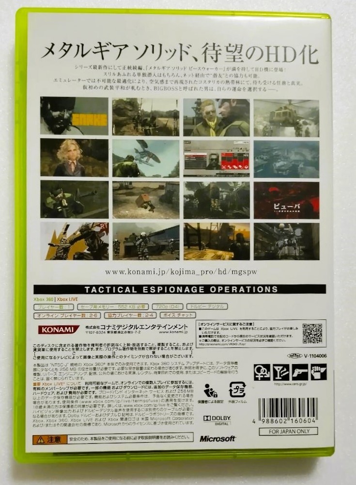 USED Xbox 360 Metal Gear Solid Peace Walker HD Edition Japanese KONAMI Description Condition Used Our products are 100% authentic, the item will be shipped from Japan. Shipping We always send the item with a tracking number. So please place an order without any concern on delivery. You can always track the delivery status. We use SpeedPAK Economy for shipping. Shipping is only available to the address registered in eBay. If you want us to send another address, please change your address on eBay and then place an order. Shipping is available from Monday to Friday. Weekends are not available because freight (shipping) companies are closed. We do not mark merchandise values below value or mark items as “gifts” – Japan, US and International government regulations prohibit such behavior. About Importer's Obligation Import duties, taxes, and charges are not included in the item price or shipping cost. These charges are the buyer's responsibility. Please check with your country's customs office to determine what these additional costs will be prior to bidding or buying. Thank you for your understanding.