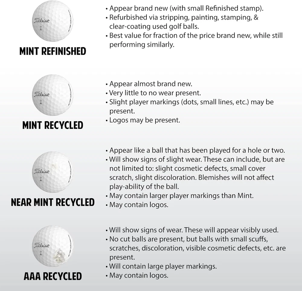 Store New Arrivals Add to Favorite View Feedback Contact Used and Recycled for Bridgestone Tour Mix Three A- 3A Quality Golf Balls Mesh Bag Included Description Number of Items 3 Color White Tour Mix 24 Ball Mesh Bag Material Surlyn Construction Type Two-piece construction Sport Golf Product Description Our highly trained staff hand sorts and inspects every golf ball that passes through our facility. We ensure ever product is authentic and up to standard before listing it for sale. Our factory is located in the heart of Virginia, where we're proud to recycle and refinish golf balls we retrieve from all over the United States. Our plant processes over 20 million golf balls each year, helping to clean our rivers, ponds, and lakes while delivering you greater value. Golf Ball Nut Golf Ball Nut is the premier provider of used recycled and refinished golf balls in the United States. We process over 20 million golf balls annually with a 5 point quality inspection process. Only golf balls in authentic Golf ball nut packaging are backed by our quality promise. GOLF GREEN Over 300 million golf balls are lost each year in the United States alone. Playing recycled and refinished balls not only saves you money but also cleans our waterways and removes waste from the environment. Why Buy Used? Save Up to 70% Off Retail Play More Top Brands Reduce New Material Consumption Reduce Pollution to Waterways How Golf Balls Are Graded MINT (5A) RECYCLED GOLF BALLS Appear almost brand new. Very little to no wear present. Slight player markings (dots, small lines, etc.) may be present. Logos may be present. NEAR MINT (4A) RECYCLED GOLF BALLS Appear like a ball that has been played for a hole or two. Will show signs of slight wear. These can include, but are not limited to: slight cosmetic defects, small cover scratch, slight discoloration. Blemishes will not affect play-ability of the ball. May contain larger player markings than Mint. May contain logos. AAA RECYCLED GOLF BALLS Will show signs of wear. These will appear visibly used. No cut balls are present, but balls with small scuffs, scratches, discoloration, visible cosmetic defects, etc. are present. Will contain large player markings. May contain logos. MINT REFINISHED GOLF BALLS Appear brand new (with small Refinished stamp). Refurbished via stripping, painting, stamping, & clear-coating used golf balls. Best value, while still performing similarly. ABOUT US We offer the best prices around on high quality products. Our E-store includes media such as books, movies, music and games while offering electronics, toys, sporting apparel, clothing, tools, general home, garden items and more. SHIPPING We are always working hard to ensure your package arrives as soon as possible. Please understand that some factors like weather, high postal traffic, and the performance of shipping companies are outside of our control. We offer free shipping to the lower 48 states and ship within 2 business days of payment, usually sooner. We do not accept P.O. Boxes. Please provide a physical address. For shipping outside of the continental USA, we only use eBay's Global Shipping Program.The item is shipped to KY and then sent to the rest of the world. International customers are responsible for all duties and taxes. Continue to check out in order to calculate costs for shipping the item to your country. Messages regarding eBay's Global Shipping Program MUST be directed at eBay EXCLUSIVELY. RETURNS We offer a 30-Day Return Policy on items which you are not completely satisfied with. You have the option for a full-refund or an exchange of the item. No returns are available on items shipped outside of the USA. PAYMENT We accept PayPal. CONTACT US This page content is yet to come Please ad us to your favorite seller and visit again later Thank You CUSTOMER SATISFACTION We try our very best to make sure every customer is completely satisfied. If there's a problem, message us! We're happy to help. WE ACCEPT Copyright © 2021 AutoDS. | All Rights Reserved