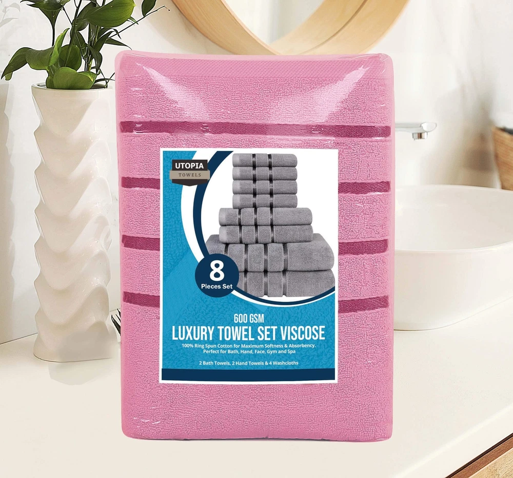 8 Piece Luxury Towel Set, 2 Bath, 2 Hand, and 4 Wash Cloths, 600 GSM Ring Spun Cotton, Highly Absorbent Viscose Stripe Towels, Ideal for Everyday use, Pink Set of 8 Towels - Includes 2 bath towels, each measuring 27 x 54 inch; 2 hand towels, each measuring 16 x 28 inch and 4 washcloths, each measuring 12 x 12 inch Highly Absorbent Towels - Our 600GSM high density towels are ultra-absorbent and fast drying. Gives your skin a soft and delicate touch while absorbing all traces of moisture efficiently 97% Cotton , 3% Viscose - These luxurious towels are made of 97% cotton & 3% Viscose giving you a super soft feel every time you use them. The surface is smooth and not easy to shed, adding to their durability Elegent Stripe Design - Elegantly designed viscose woven stripes have a brilliant shine and add to the luxurious look of the towels. They are sure to give your bathrooms, spas and kitchen a touch of sophistication Care Instruction - Machine wash the towels in cold water using delicate detergent and tumble dry on low setting; recommended to dry immediately. To prevent unforeseen color discoloration, it is advised, to avoid the removal of the application of any form of cosmetics, facial creams, or scrubs directly with the towel. 8-Piece Bath Linen Sets - Viscose Stripe Towels - 600 GSM Ring Spun Cotton - Highly Absorbent Luxury Towels (Pack of 8) Shipping We offer FREE shipping on all orders! We ship within Three business days of payment, usually sooner. We use a selection of shipping services such as UPS, FedEx, USPS etc. We only ship to the lower 48 states, no APO/FPO addresses or PO Boxes allowed. Local pickups and combined shipping options are not provided at this time. Return You can return a product for up to 30 days from the date you purchased it. Any product you return must be in the same condition you received it and in the original packaging. Please keep the receipt. Payment We accept payment by any of the following methods: PayPal Please pay as soon as possible after winning an auction, as that will allow us to post your item to you sooner! Feedback Customer satisfaction is very important to us. If you have any problem with your order, please contact us and we will do our best to make you satisfied. Contact Us If you have any queries, please contact us via ebay. We usually respond within 24 hours on weekdays. Please visit our eBay store to check out other items for sale! Thank you for shopping at our store.