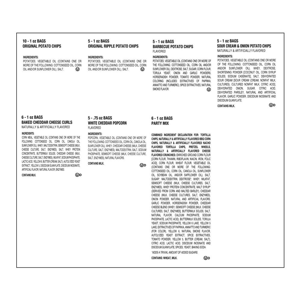Utz Snack Variety Pack Individual Snacks, Includes Potato Chips, Cheese Curls, Popcorn, and Party Mix, Crunchy Travel Snacks for Lunches, Vending Machines, and Enjoying on the Go (Pack of 42) Product Details Is Discontinued By Manufacturer : No Product Dimensions : 15 x 13 x 11 inches; 2.55 Pounds Item model number : 2178 Department : Unisex-Adult Manufacturer : Utz Units : 40.75 Ounce Brand: Utz Flavor: Variety Item Weight: 40.75 Ounces Specialty: Crunchy Allergen Information: Wheat, Milk VARIETY PACK: The Utz Snack Variety Box contains 10 - 1 oz. Original Chips, 5 - 1 oz. Ripple Chips, 5 - 1 oz. BBQ Chips, 5 - 1 oz. Sour Cream & Onion Chips, 6 - 1 oz. Cheese Curls, 6 - 1 oz. Party Mix, 5 - .75 oz. White Cheddar Popcorn. INDIVIDUALLY PACKAGED: These individual snacks are packaged for your ultimate convenience. They are ideal for filling the office breakroom or your home pantry. Plus, they are packed for resale so they’re great vending machine snacks. TRAVEL SNACKS: This pack of portable snacks is perfect for school or lunch boxes, to bring with you on the go, or to keep handy for whenever the cravings strike. Trust us, a sandwich just isn’t the same without a crunchy snack on the side! GREAT CRUNCH: No matter what variety of Utz snacks are your favorite, you can be sure you’re getting a great, satisfying crunch. We have expertly refined our cooking process to give you the best snacks foods possible. WE ARE UTZ: Since 1921, Utz has been making and selling quality pretzels and other delicious snacks in Hanover, PA, the snack capital of the world! We’re a family-managed business providing snacks that are crunchier, lighter, fresher and simply better. Stock up on all of the good stuff with the Utz Jumbo Variety Box! This 42-count box of travel snacks contains: * 10 - 1 oz. Original Chips * 5 - 1 oz. Ripple Chips * 5 - 1 oz. BBQ Chips * 5 - 1 oz. Sour Cream & Onion Chips * 6 - 1 oz. Cheese Curls * 6 - 1 oz. Party Mix * 5 - .75 oz. White Cheddar Popcorn These individual snacks are packaged for your ultimate convenience. The Utz Variety Pack is the ideal portable snack and is great for stocking up a vending machine, the office kitchen or your home pantry. It is perfect for school or lunch boxes, or to keep handy for whenever the cravings strike. Trust us, a sandwich just isn’t the same without a crunchy snack on the side! No matter what variety of Utz snacks is your favorite, you can be sure you’re getting a great, satisfying crunch. We have expertly refined our cooking process to give you the best snacks foods possible and with the Utz Variety Pack, there is a flavor that everyone is sure to love. Since 1921, Utz has been making and selling quality potato chips, pretzels, popcorn, pork rinds and other delicious snacks in Hanover, PA, the snack capital of the world! Our story began with Bill and Salie, who started making and selling potato chips almost 100 years ago, and now we are the largest independent privately-held snack brand in the U.S. Today, we’re still a family-managed business providing snacks that are crunchier, lighter, fresher and simply better. Each day we set out to honor our century of heritage and deliver the world-class innovation and products consumers will love for generations.