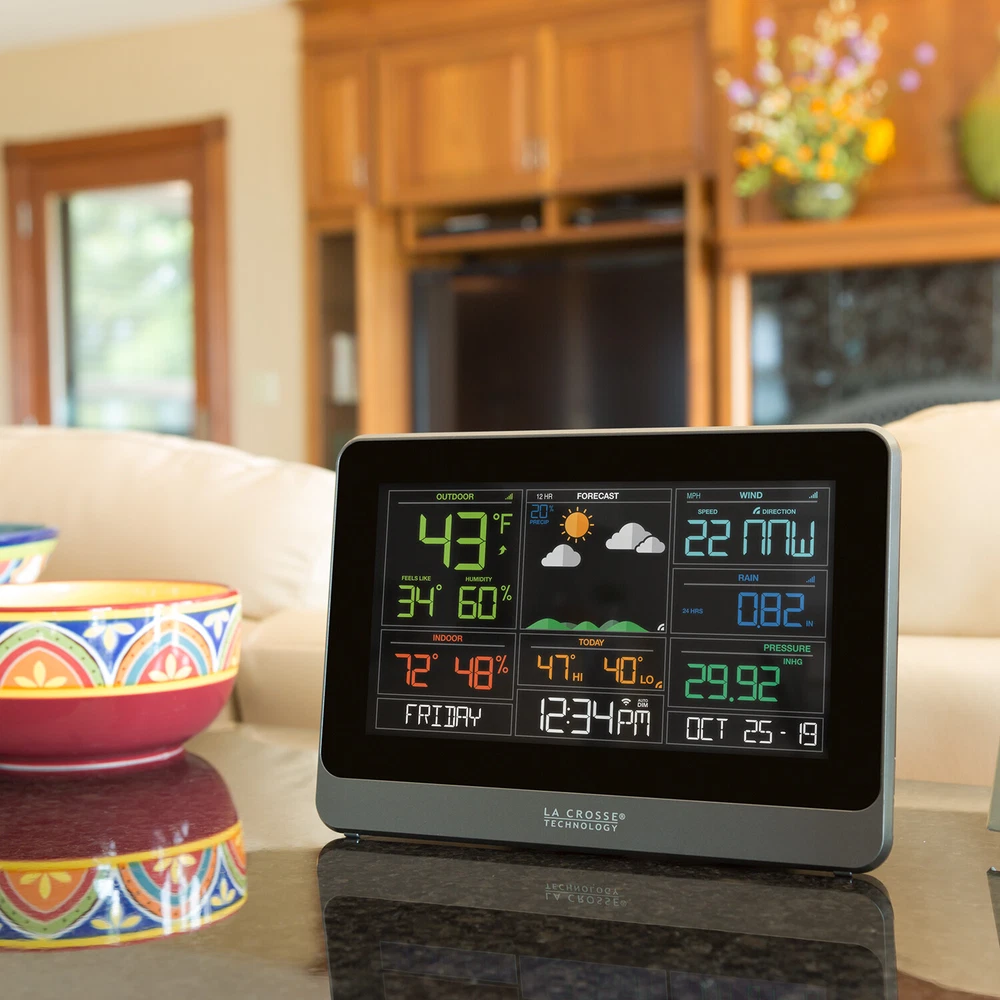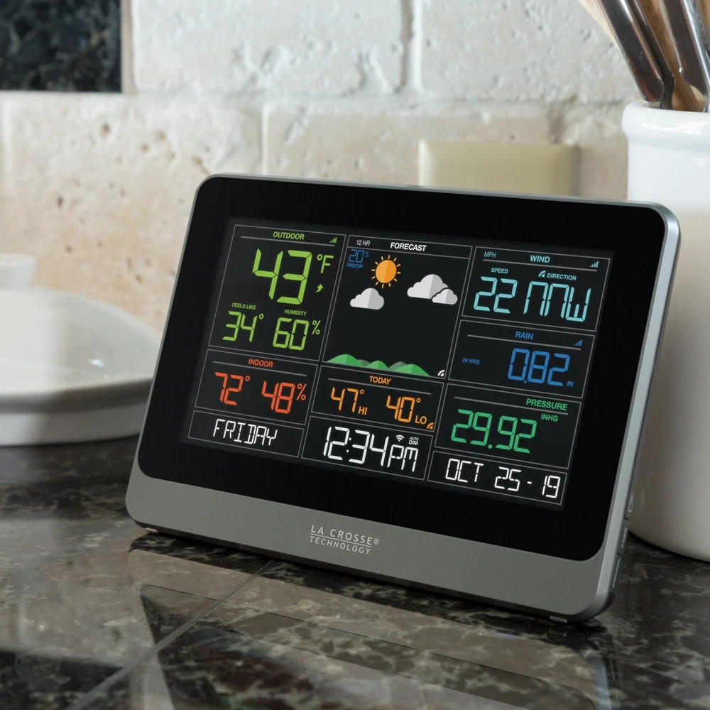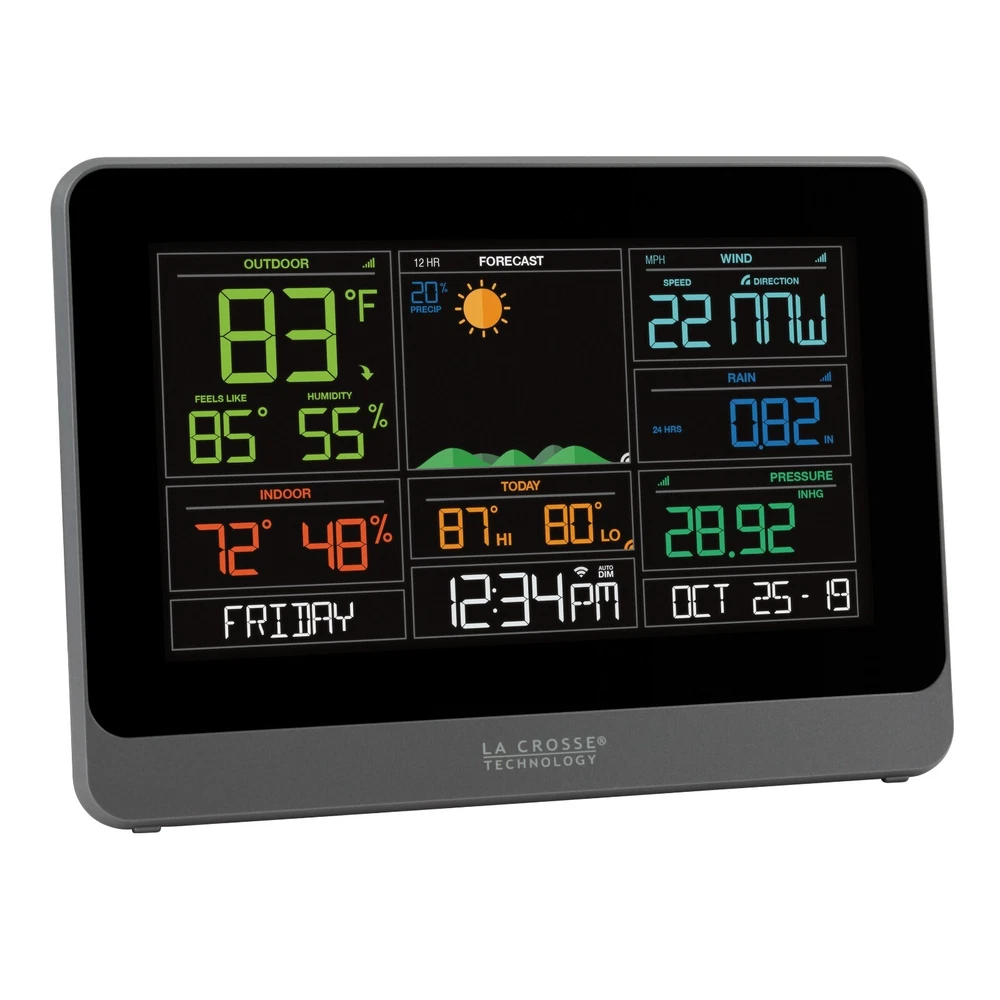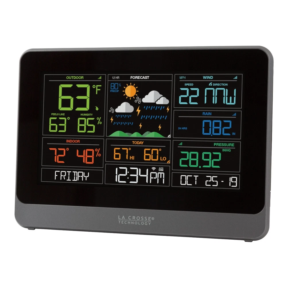 V30-WRTH La Crosse Technology Replacement/Add-On Color Weather Station Display View More La Crosse View Products REPLACEMENT/ADD-ON DISPLAY ONLY, SENSORS NOT INCLUDED Our new Remote Monitoring Weather Station features wind, rain, indoor and outdoor temperature and humidity data, daily high and low temperature records, dynamic forecast icons, and a new Wi-Fi connected option, which will allow you to see all of your sensor data in our new La Crosse View App . Works with or without a computer or smartphone Can be used as a stand-alone Weather Station without La Crosse View App Dimensions: V30 Display: 8.22 " L x 1.18" W x 5.83 " H Weather Station Features: Temperature & Humidity (°F or °C) Indoor/Outdoor Readings Outdoor Temperature Trend Indicators Feels Like Temperature, Heat Index and Dew Point HI/LO Records with Time/Date Stamp Dynamic Color Weather Forecast 6 Dynamic Forecast Icons Wind Speed Data Current and Hourly Top Speed History Records with Time Stamp Rain Fall Data Selectable rainfall time frame (NOW, 1 Hour, 24 Hour, 7 Days, 1 Month, 1 Year, Total) History Records Time & Date 12/24 Hour Setting Displays Day of the Week, Month, Date & Year Relative Pressure Relative Barometric Pressure Additional Features Low battery indicators for station and sensors 5 Settings LCD Brightness with Programmable Auto-Dim Sensor Connection Indicator Wifi Connection Indicator Bonus Indoor Temperature Display Wall Hanging or Adjustable Kickstand for Free Standing Option Compatible with Add-on sensors Wi-Fi Connectable Your weather station can function as a standalone weather station OR you can download the free La Crosse View App for enhanced features. Why go Connected? Anywhere Monitoring of Station and Sensor Information via the La Crosse View™ App View and Track History with Detailed Graphs Customize Alerts and Receive Push Notifications of Values Outside of Your Desired Range Share Your Weather Information Enhanced Station Features When Connected* AccuWeather Weather Service 6 Additional Forecast icons 7 Days of Forecast Hourly and Daily Forecast Temperature Forecast Wind Direction Daily Forcasted High and Lows Time and Date Automatically Update View Data Stream (VDS) Technology * NWS Data based on US Zip Code location, NIST Data based on the Time Zone entered on the Device set-up/info page. Build your system to monitor what matters to you with additional sensors for your La Crosse View App. Sensor Compatibility: The V30 station can display data from one Temperature & Humidity (T/H) sensor, one Wind sensor and one Rain sensor. Add-on sensor data will either pass through to the La Crosse View App and/or appear in the extra sensor area in place of pressure. Check out the View Sensor compatibility chart for full details . Looking to Add-on and expand the capability of your system? Check out the enhancement opportunities here. Specifications: Display: Indoor temperature range: +32°F to +99°F (0°C to 37°C) Relative Pressure: 23.62 to 32.48 InHg (800 to 1100 hPa) Indoor humidity range: 10% RH to 99 %RH Sensor Requirements ( not included-sold separately) : LTV-TH2 Wireless Outdoor Temp/Humidity Sensor: Outdoor temperature range: -40°F to 140°F (-40°C to 60°C) Outdoor humidity range: 10% RH to 99%RH Transmission range: Up to 400 feet (121 meters) in open air Transmission frequency: 915 MHz LTV-W1 Wind Sensor: Wind Speed Range: 0-111 mph (0-178 kmh) Up to 400 feet (121 meters) in open air, RF 915 MHz For custom mounting, use 1" Electric Metallic Tube (EMT) conduit ( not included ) LTV-R3 Rain Sensor: Rainfall Range: 0-393.6 inches (0-9999 mm) Up to 400 feet (121 meters) in open air, RF 915 MHz Power Requirements: V30 Display: 5.0 Volt power cord included (required) AC6: XH0500-600W (Input 100-240V) CR2032 battery (not included) , backup for time and date Item Condition: This item is DISPLAY ONLY, SENSORS NOT INCLUDED. Not in the original packaging. Warranty & Return Policy: Great Big Outlet provides a 30 day money back warranty and 1 year limited warranty on this item from date of purchase relating to manufacturing defects in materials and workmanship. You are covered by the eBay Money Back Guarantee if you receive an item that is not as described in the listing. After receiving the item, please contact us thru eBay within 30 days. R efer to eBay Return Policy for more details. Return Shipping: The seller pays for return shipping if the item was damaged, faulty, or doesn't match the listing description. Buyer pays for return shipping if you're returning the item because you changed your mind, ordered the item by mistake or didn't like the item. Track Page Views With Auctiva's FREE Counter
