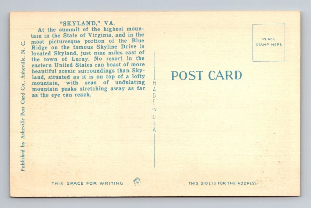 VA-Virginia, Skyland Drive, Blue Ridge Mountains, Vintage Souvenir Postcard