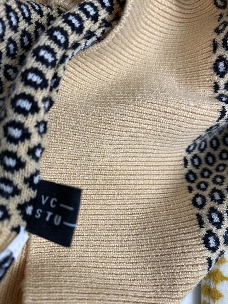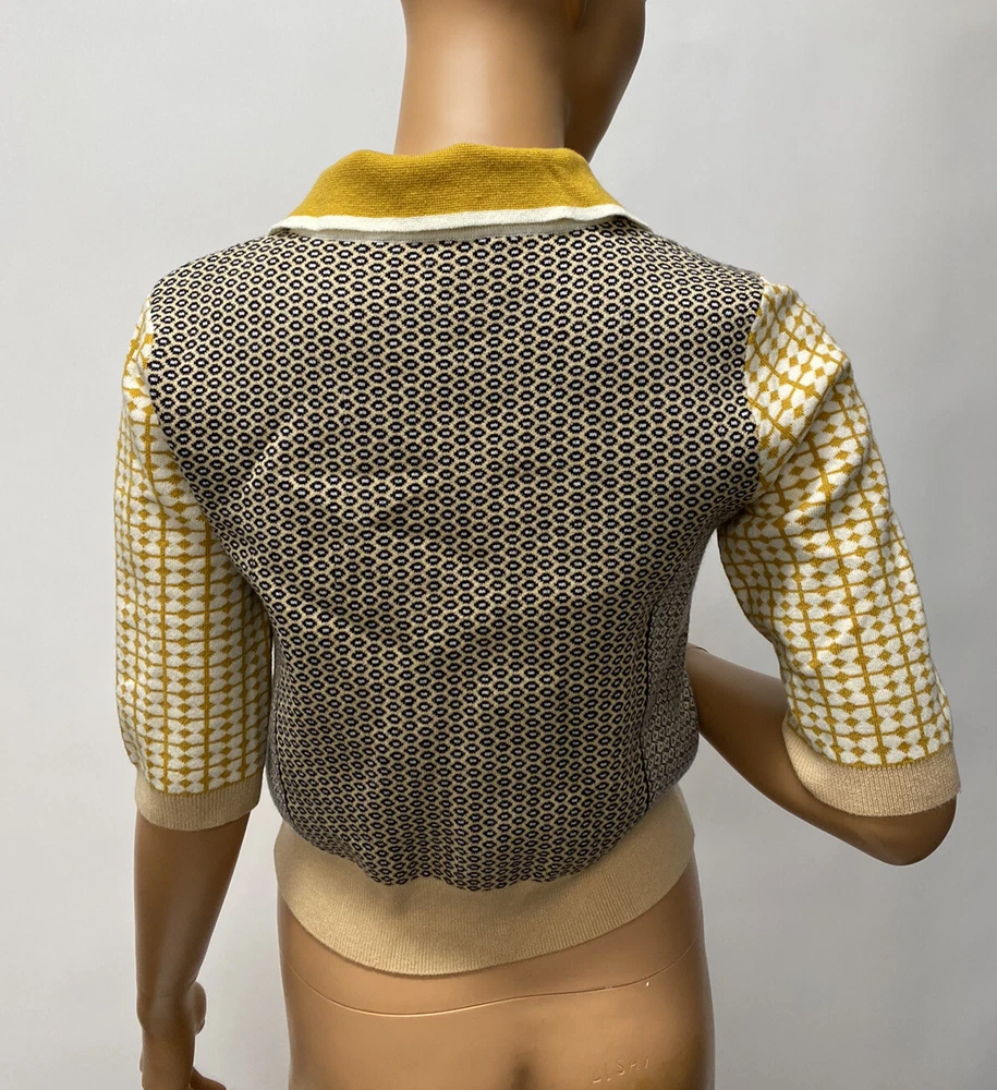 VC-RUAN STU-DIO Cropped retro Style Size Small is a women's sweater made of knit fabric with a collared neckline and short bell sleeves. The pullover features a geometric pattern in multicolor and a button accent. It is a classic fit and is available in size small. The sweater is machine washable and made of polyester.
