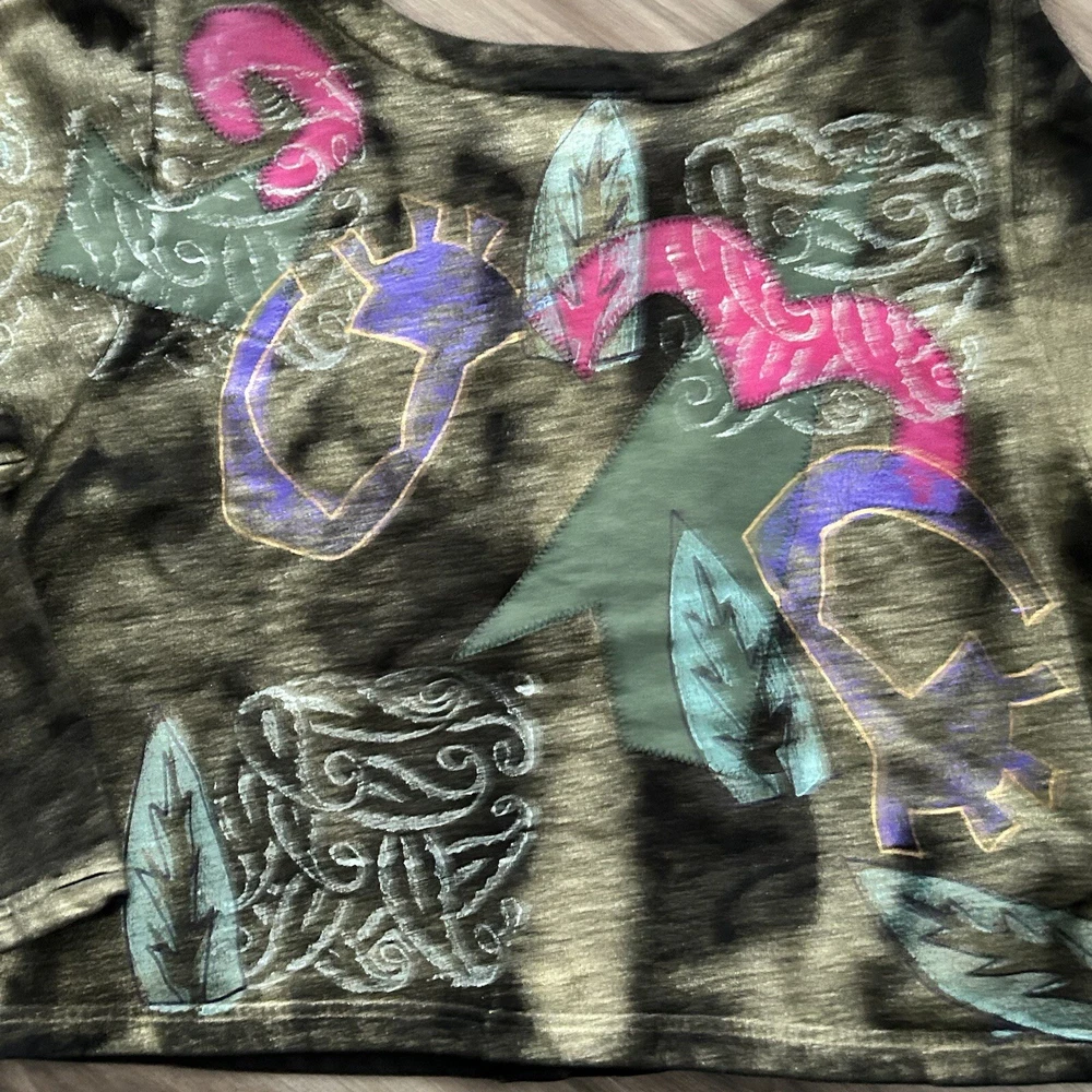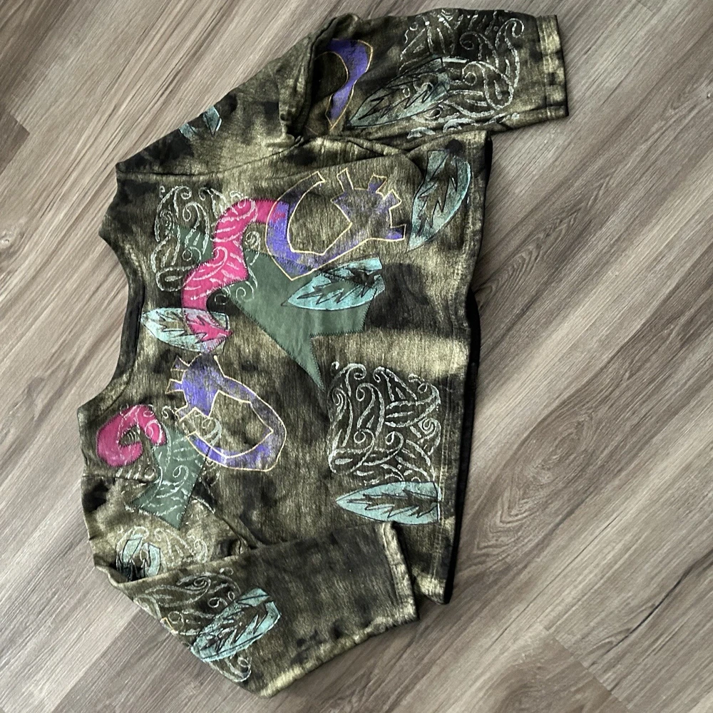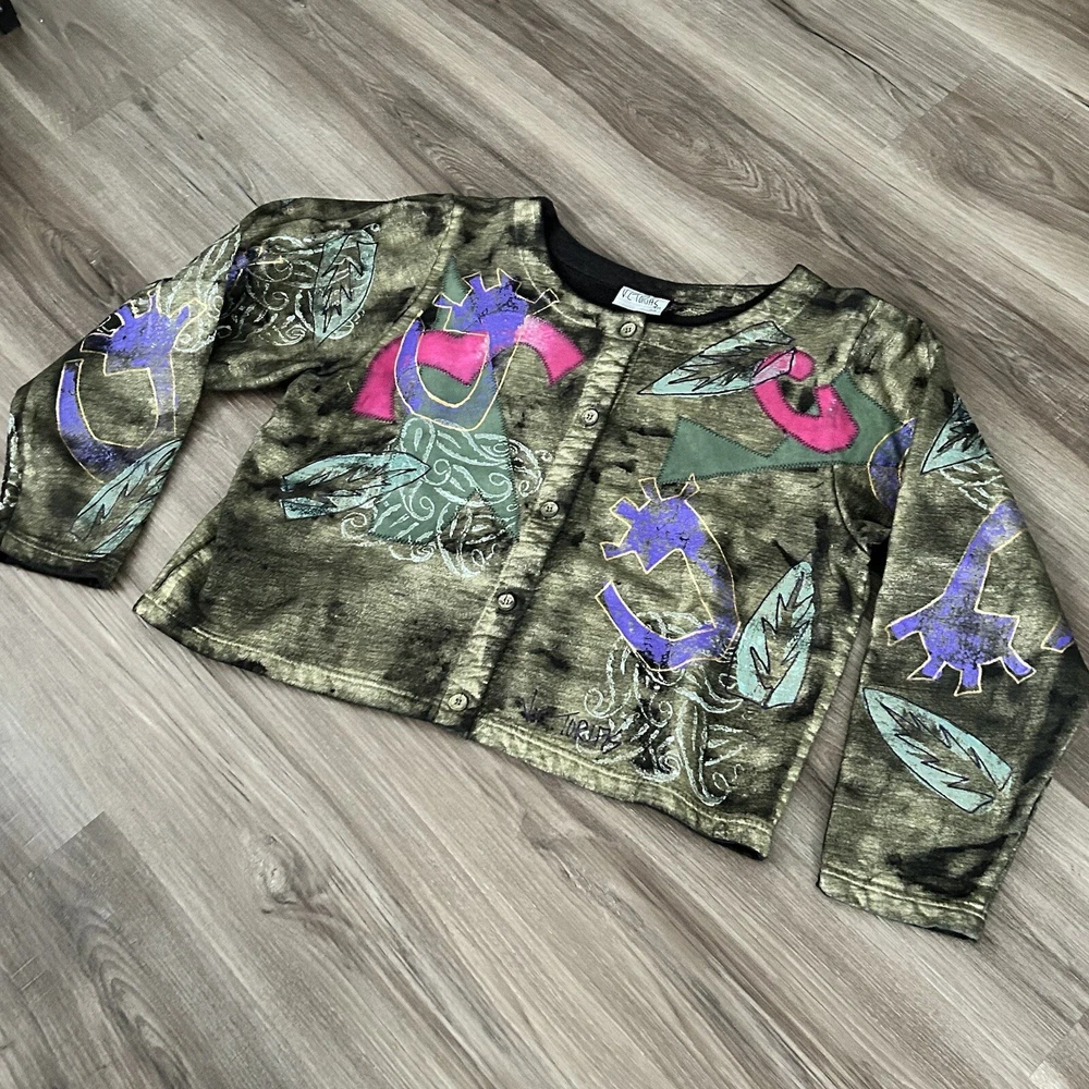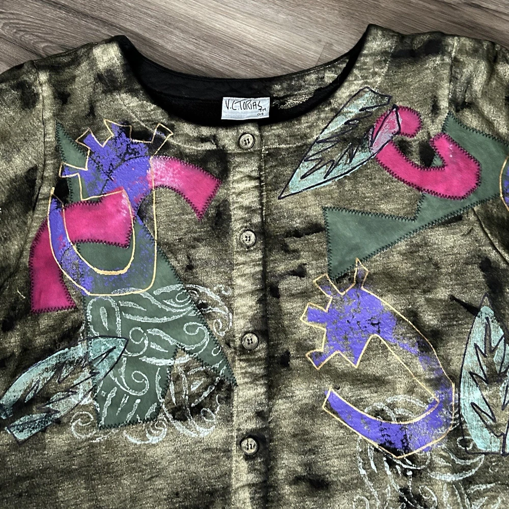 V.C.Torias Gold Multicolored Hand Paint Patch Work Button Up Cardigan Women 0/S. V.C.Torias Gold Multicolored Hand Paint Patch Work Button Up Cardigan Women 0/S in great condition/ boxy cut/ All Over Print/ non stretchy / vintage Pit to pit 22” Length from shoulder 20” Sleeve from shoulder seam 23” Approximate measurements #20 Office, work, brunch, street, 80’s, 90’s, retro, street, Paris fashion, New York fashion , art to wear granny , garden, gremlin All final sale