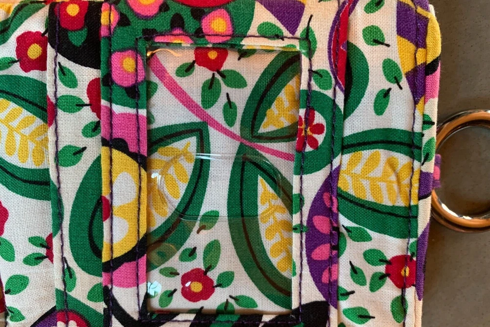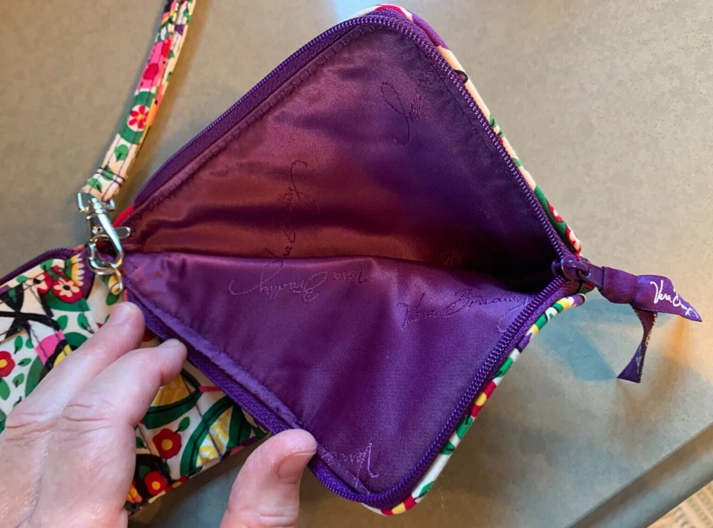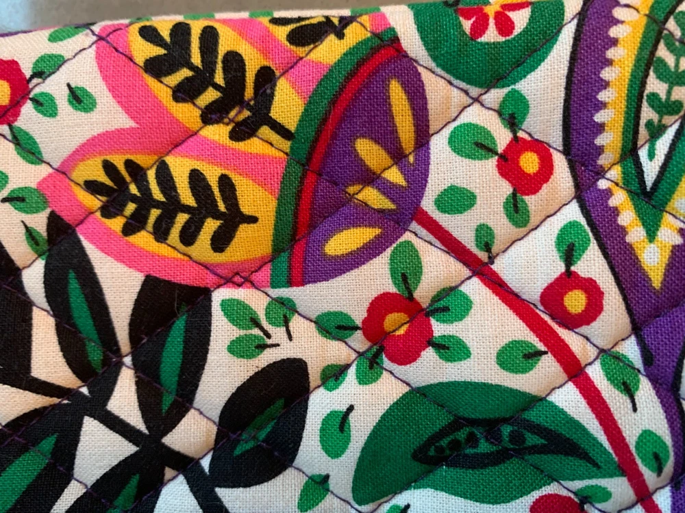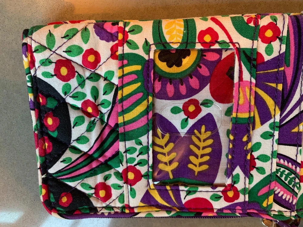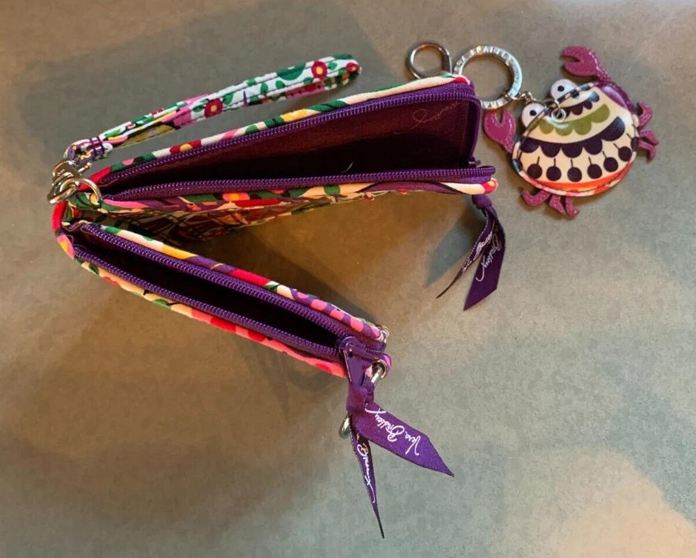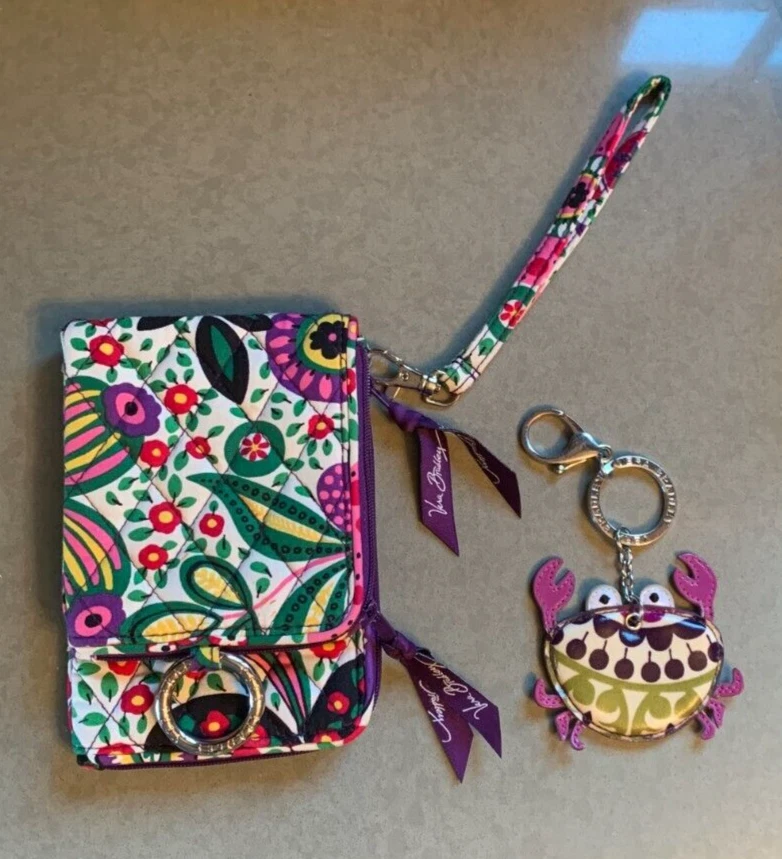 New without tags, mint condition! Bright Vera wristlet wallet in a diamond-quilted multicolor paisley with purple lining. Shiny chrome accents. Hidden magnetic closure opens bifold wallet to reveal two clear pocket slots for ID, and multiple flat compartments for credit cards, cash. etc. Double zippers with flag tags featuring the designer's name. Adorable vinyl crabby key fob is attached, or this accessory can be used separately. Handy loop for wrist. Measures 6" x 4"; 11" when opened. Crab fob is 3" x 3" Fast shipping, quality packed, smoke-free household, trackable. Thanks for looking :)