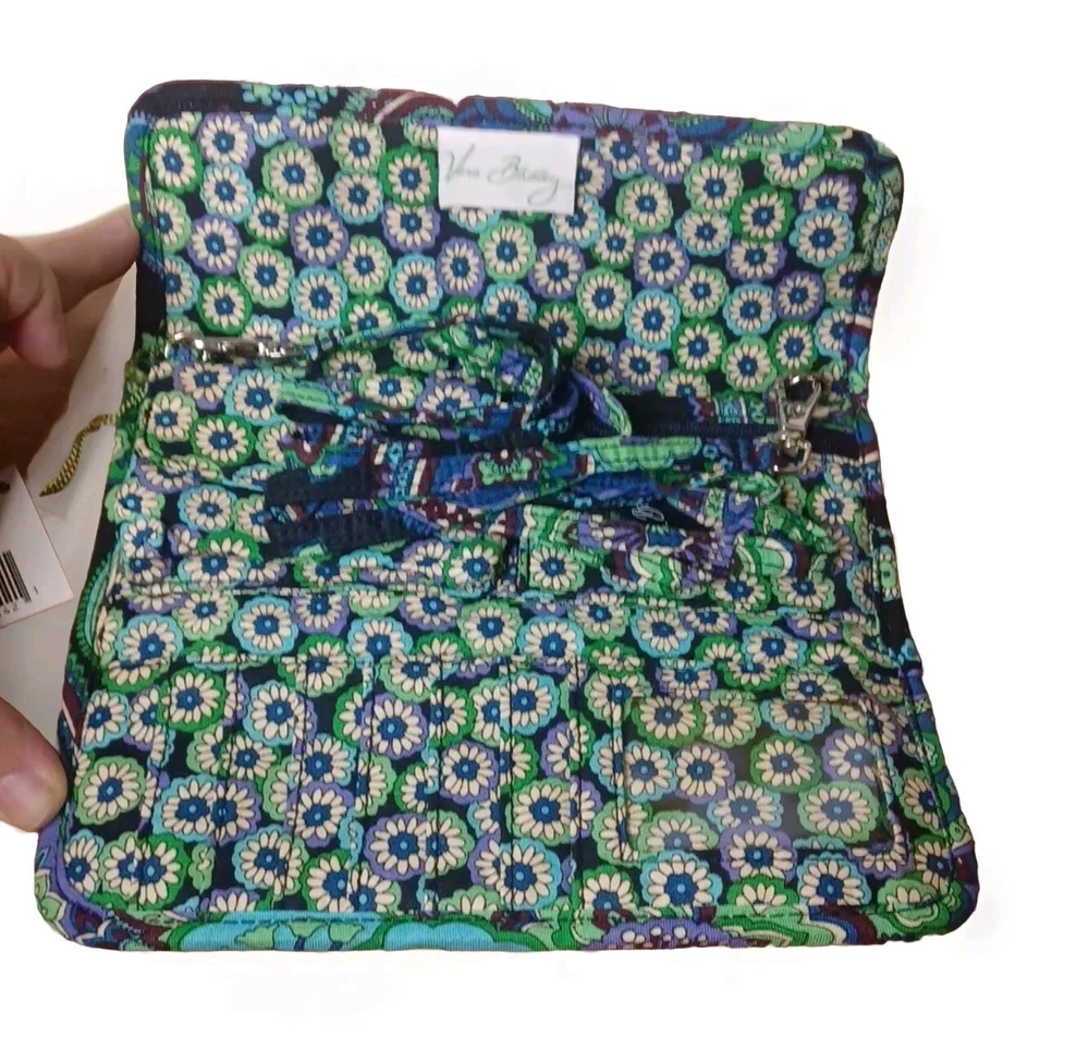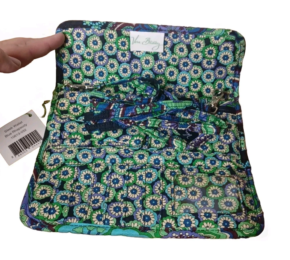 This Vera Bradley Trifold Wallet in Blue Rhapsody features a sleek design with a strap accent, perfect for women looking for a stylish accessory to carry their essentials. Made of cotton material, this wallet offers functionality with its trifold design, ideal for organizing credit cards and cash. The vibrant Multi-Color pattern adds a trendy touch to the wallet, making it a fashionable choice for everyday use. Brand new with tags, this Vera Bradley wallet combines practicality with a touch of flair.