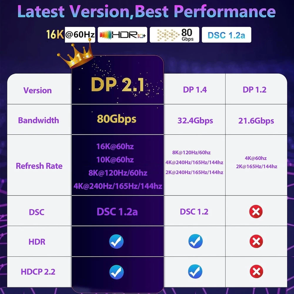VESA Certified 16K Displayport Cable 2.1, DP 2.1 10FT-3M 16K-10feet Product Details Package Dimensions : 8.62 x 6.77 x 1.06 inches; 1.6 ounces Item model number : CABLE-54532587 Manufacturer : Green Jiss Country of Origin : China Brand: Green Jiss Connector Type: DisplayPort Cable Type: Display Port Compatible Devices: Desktops, laptops and high refresh rate gaming monitor with an available DisplayPort output, AMD Graphics Card, NVIDIA Graphics Card, 8K/4K DisplayPort Out UHD TV, etcDesktops, laptops and high refresh rate gaming monitor with an available DisplayPort output, AMD Graphics Card, NVIDIA Graphics Card, 16K/8K/4K DisplayPort Out UHD TV, etc Desktops, laptops and high refresh rate gaming monitor with an available DisplayPort output, AMD Graphics Card, NVIDIA Graphics Card, 8K/4K DisplayPort Out UHD TV, etcDesktops, laptops and high refresh rate gaming monitor with an available DisplayPort output, AMD Graphics Card, NVIDIA Graphics Card, 16K/8K/4K DisplayPort Out UHD TV, etcDesktops, laptops and high refresh rate gaming monitor with an available DisplayPort output, AMD Graphics Card, NVIDIA Graphics Card, 8K/4K DisplayPort Out UHD TV, etcDesktops, laptops and high refresh rate gaming monitor with an available DisplayPort output, AMD Graphics Card, NVIDIA Graphics Card, 16K/8K/4K DisplayPort Out UHD TV, etc See more Special Feature: Braided, High Speed 【VESA Certified 16K DisplayPort Cable 2.1】 The 16K DP to DP 2.1 cable is officially certified by VESA for exceptional quality. The DP 2.1 Cable supports high resolutions like 16K(15360*8640)@60Hz, 10K@60Hz, backward compatible with 8K@120Hz, 4K@240Hz, and 2K@360Hz and more. This is the only Display Port cable you'll need for the next decade. It's also backward compatible with DisplayPort 2.0, 1.4, 1.3, and 1.2. 【Optimal Choice for Gaming Enthusiasts】16K displayport cable supports all popular graphics cards and monitors. Unlike 4K/8K DP cables, 16K displayport 2.1 can provide 80Gbps bandwidth, HBR3, DSC 1.2a. Dynamic HDR enhances dark scenes and details. The 32-bit audio captures enemy footsteps and breathing, especially in FPS and 3A masterpieces. Experience the thrill of multi-screen gaming with MTS multi-stream transmission. This is your all-in-one DisplayPort cable for the next decade. (Important: Exclusively for DP to DP connections, Not HDMI or Mini DP) 【Wide Compatibility】 Our DisplayPort to DisplayPort Cable 2.1/2.0 allows for a direct connection between DisplayPort-enabled desktops and laptops to monitors. It is compatible with various monitors, including Odyssey G8 G9 CHG90 CRG9, Ben Q, iiyama, Alienware monitors, and others. Additionally, it works seamlessly with popular graphics cards such as 4090, 4080ti, 4070ti, 3090, 7900XTX, and others. It supports DP, DP++, DisplayPort++, and G-Sync, Free-Sync, Adaptive-Sync, and is suitable for graphics cards and monitors with DisplayPort ports ️【Ergonomic Design & Anti-Interference】The Green Jiss DP cable features a buckle-free and groove design at the port, reducing the chances of accidental damage. The groove design also makes it easier to remove the cable in tight spaces. The conductor is made of 28AWG tinned copper and has triple shielding to provide high resistance to EMI. In comparison to PVC cables, this cable is ten times more durable. Its double nylon braiding and 24K gold-plated connectors ensure that there are no artifacts or audio/video synchronization problems 【Lifetime After-sale Service】Each cable undergoes rigorous quality control to ensure optimal functionality. We go beyond selling cables by providing expert technical support to every customer. If you have any questions or concerns, feel free to contact us. There is a professional customer service team who will solve the problem for you within 24 hours.