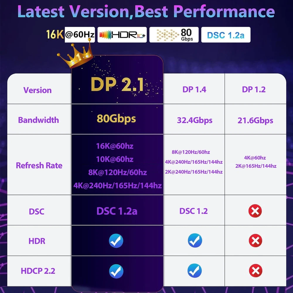 šćVESA Certified 16K DisplayPort Cable 2.1ć The 16K DP to DP 2.1 cable is officially certified by VESA for exceptional quality. The DP 2.1 Cable supports high resolutions like 16K(15360*8640)@60Hz, 10K60Hz, backward compatible with 8K120Hz, 4K240Hz, and 2K360Hz and more. This is the only Display Port cable you'll need for the next decade. It's also backward compatible with DisplayPort 2.0, 1.4, 1.3, and 1.2. š®ćOptimal Choice for Gaming Enthusiastsć16K displayport cable supports all popular graphics cards and monitors. Unlike 4K/8K DP cables, 16K displayport 2.1 can provide 80Gbps bandwidth, HBR3, DSC 1.2a. Dynamic HDR enhances dark scenes and details. The 32-bit audio captures enemy footsteps and breathing, especially in FPS and 3A masterpieces. Experience the thrill of multi-screen gaming with MTS multi-stream transmission. This is your all-in-one DisplayPort cable for the next decade. (Important: Exclusively for DP to DP connections, Not HDMI or Mini DP) š»ćWide Compatibilityć Our DisplayPort to DisplayPort Cable 2.1/2.0 allows for a direct connection between DisplayPort-enabled desktops and laptops to monitors. It is compatible with various monitors, including Odyssey G8 G9 CHG90 CRG9, Ben Q, iiyama, Alienware monitors, and others. Additionally, it works seamlessly with popular graphics cards such as 4090, 4080ti, 4070ti, 3090, 7900XTX, and others. It supports DP, DP++, DisplayPort++, and G-Sync, Free-Sync, Adaptive-Sync, and is suitable for graphics cards and monitors with DisplayPort ports š”ļøćErgonomic Design & Anti-InterferencećThe DP cable features a buckle-free and groove design at the port, reducing the chances of accidental damage. The groove design also makes it easier to remove the cable in tight spaces. The conductor is made of 28AWG tinned copper and has triple shielding to provide high resistance to EMI. In comparison to PVC cables, this cable is ten times more durable. Its double nylon braiding and 24K gold-plated connectors ensure that there are no artifacts or audio/video synchronization problems š¤ćAfter-sale ServicećEach cable undergoes rigorous quality control to ensure optimal functionality. We go beyond selling cables by providing expert technical support to every customer. If you have any questions or concerns, feel free to . There is a professional team who will solve the problem for you within 24 hours.